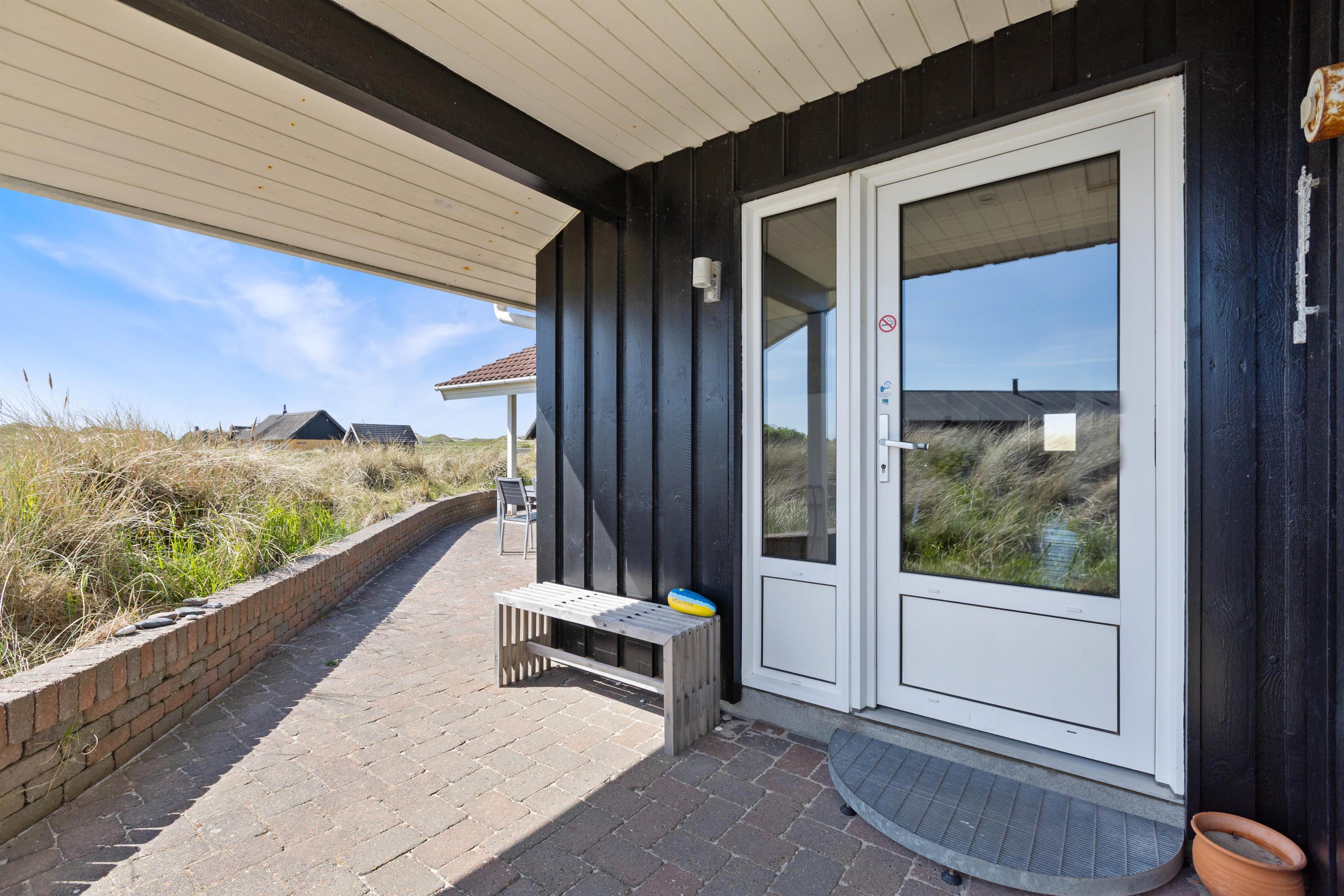 Den delvist overdækkede terrasse indbyder til afslappende timer i den friske vesterhavsluft, uanset vejret. Med komfortable havemøbler og en grill kan I tilbringe hyggelige aftener her og nyde jeres ferie i fulde drag. Naturgrunden på 2100 m2 giver jer også masser af plads til at lege og slappe af.