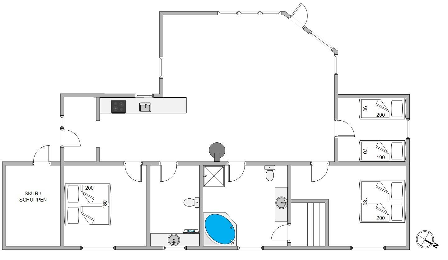Velkommen til det klassiske feriehus med et centralt opholdsrum, der kombinerer køkken, spiseplads og stue. I det rummelige opholdsrum med brændeovn kan I varme jer efter en frisk strandtur. Det åbne køkken er udstyret med alt, hvad I har brug for til at tilberede lækre måltider, inklusive opvaskemaskine og en separat fryser på 80 l.