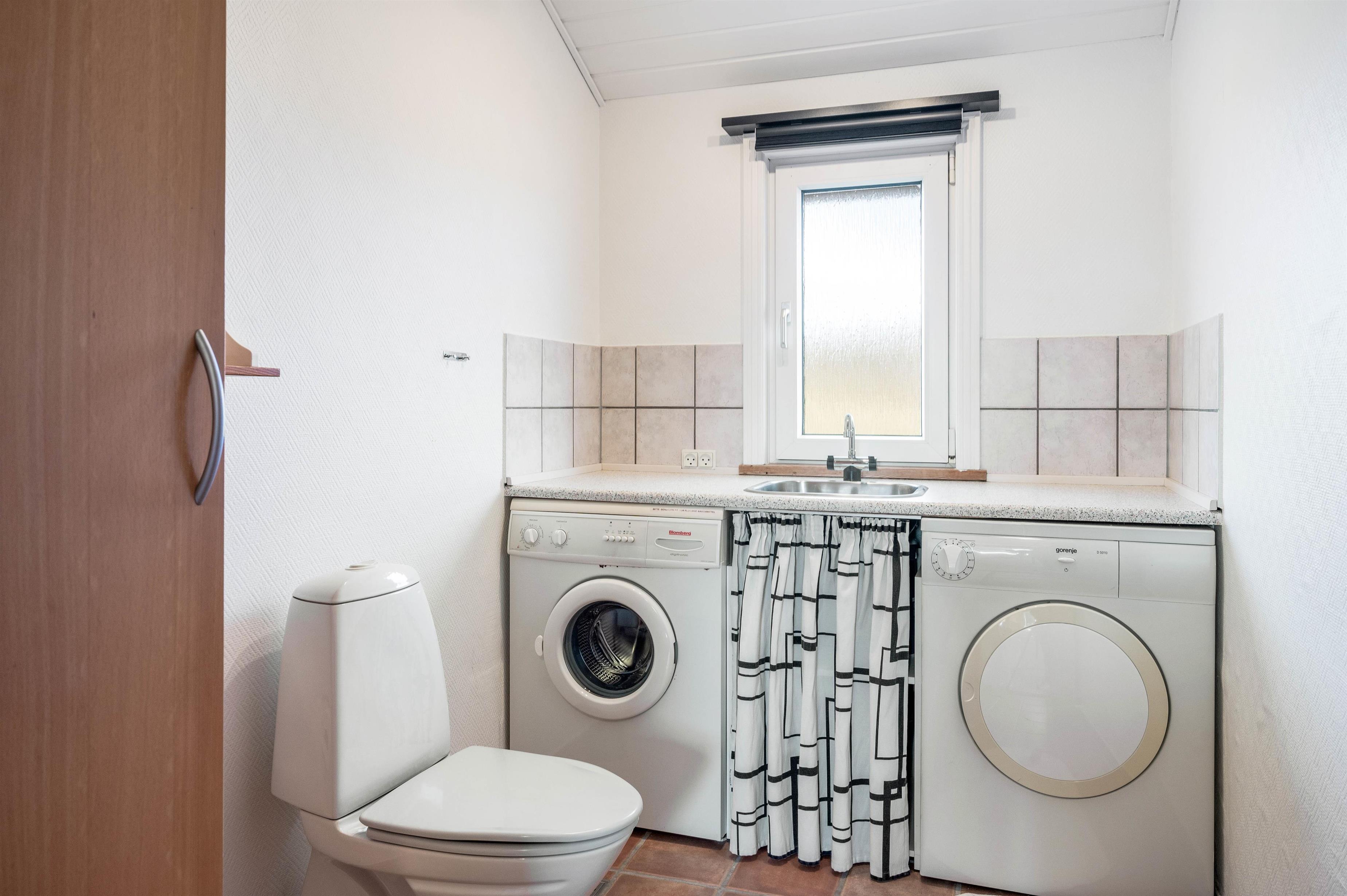 En delvis overdækket terrasse og bekvemmeligheder som vaskemaskine, tørretumbler og varmepumpe gør opholdet særligt bekvemt.