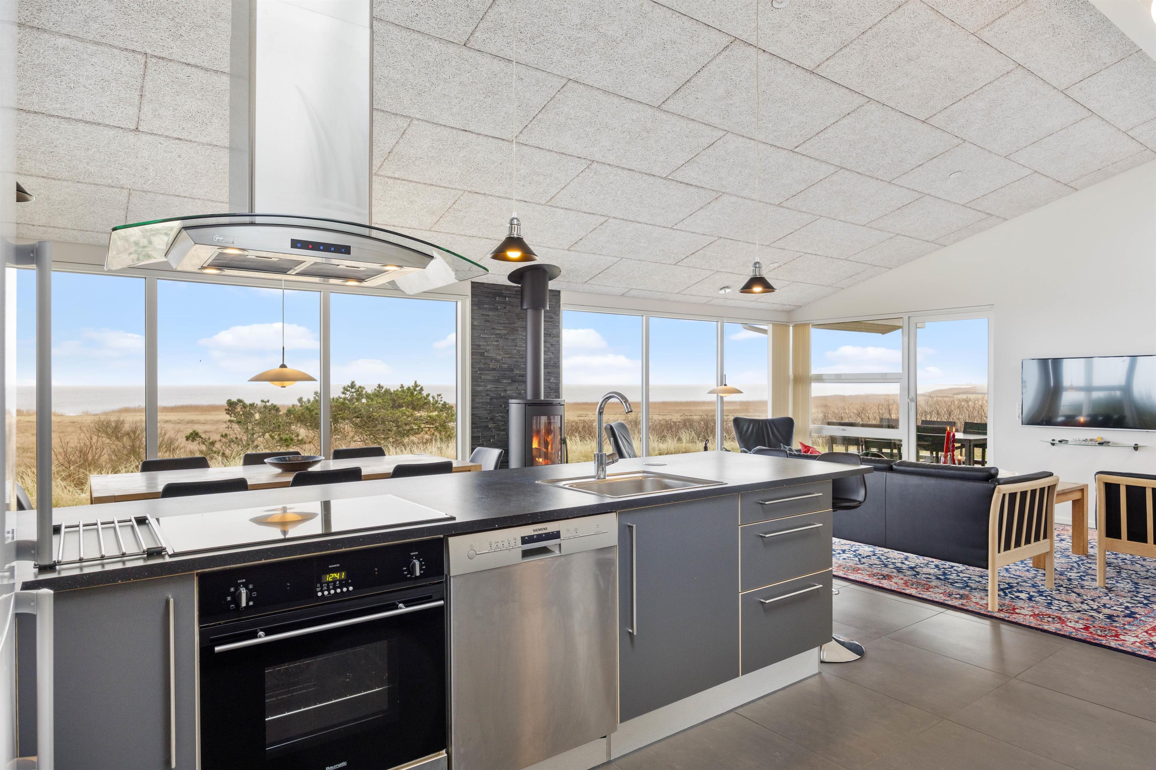 Når bilen er parkeret, kan I følge trappen op til et bryggers, hvor der er mulighed for opbevaring og tøjvask ved hjælp af vaskemaskinen og tørretumbleren. Efterfølgende træder I ind i sommerhusets hjerte med køkken og stue i ét. Gennem de store vinduer har I den smukkeste udsigt udover Ringkøbing Fjord.