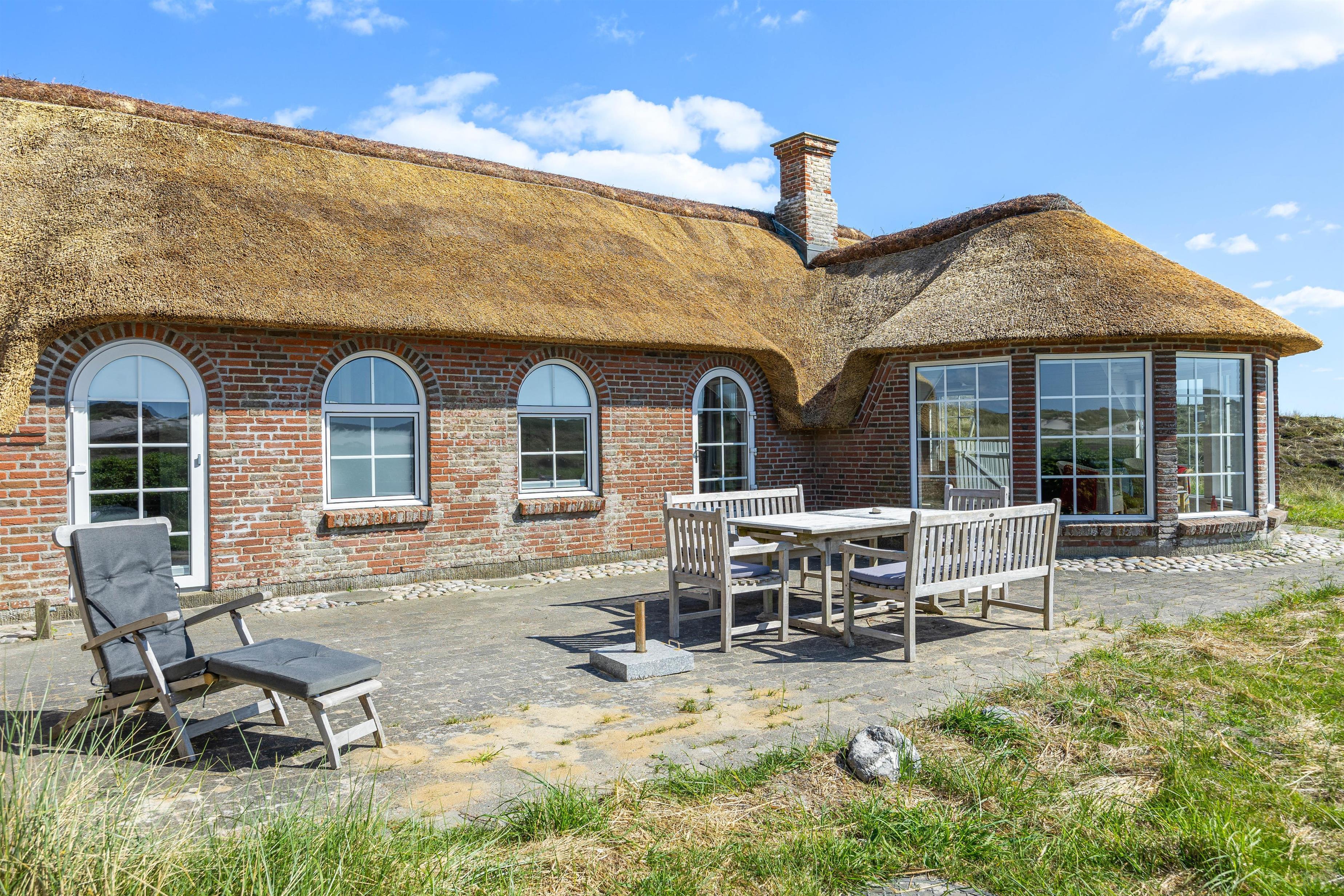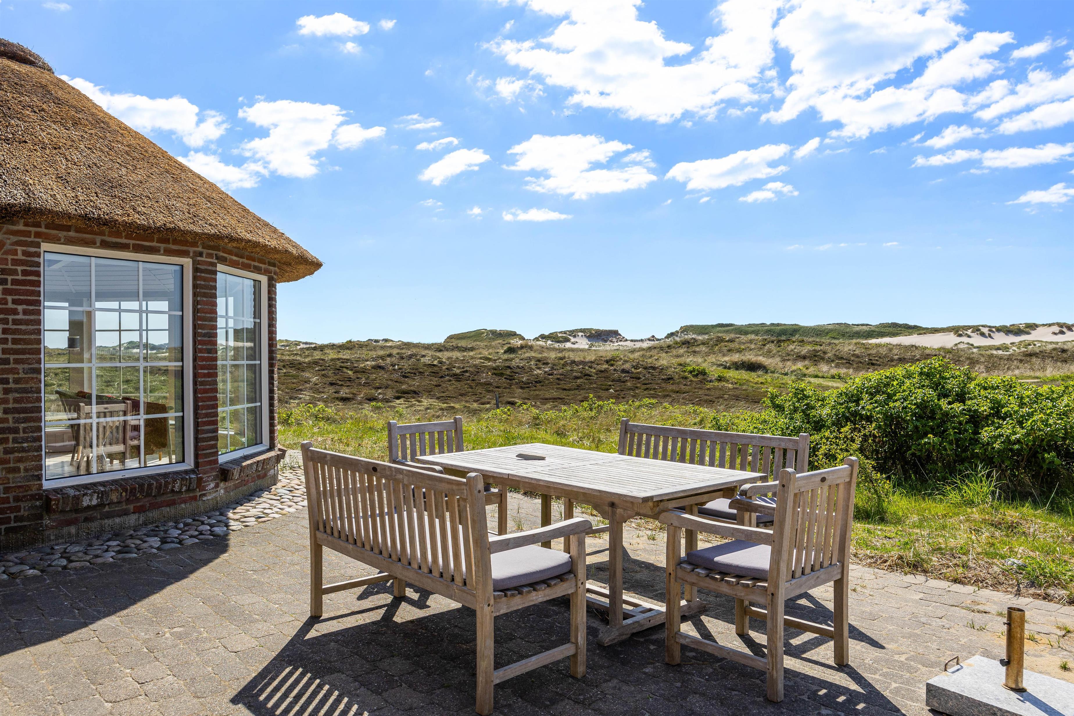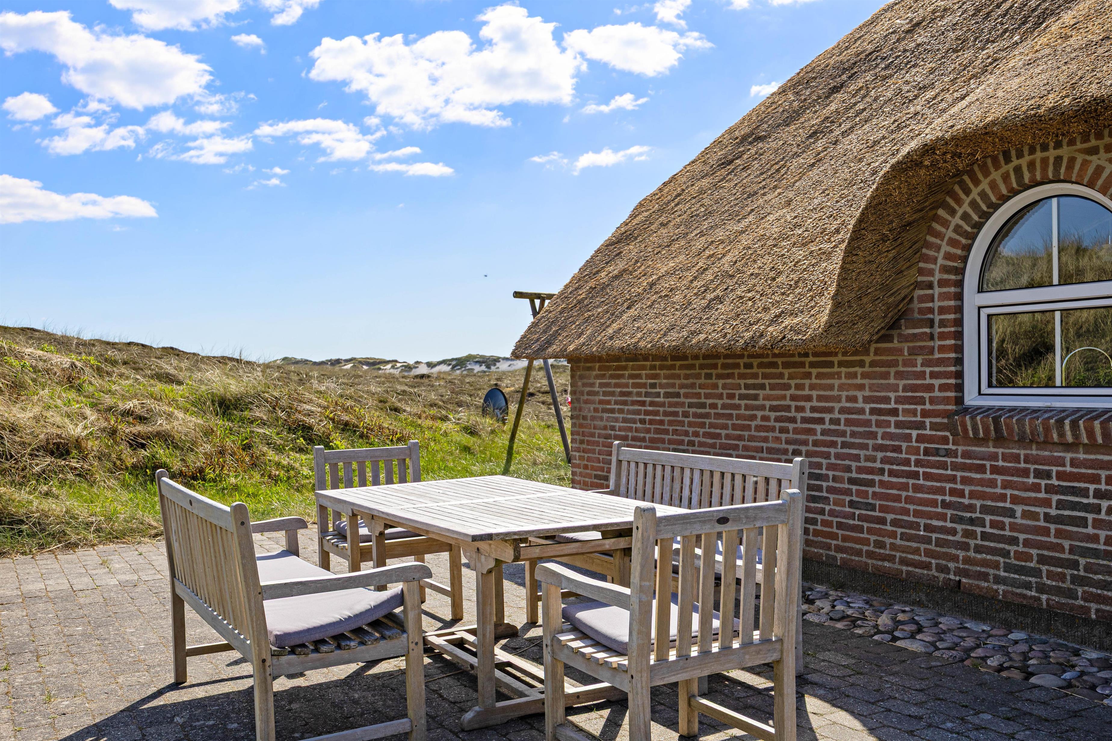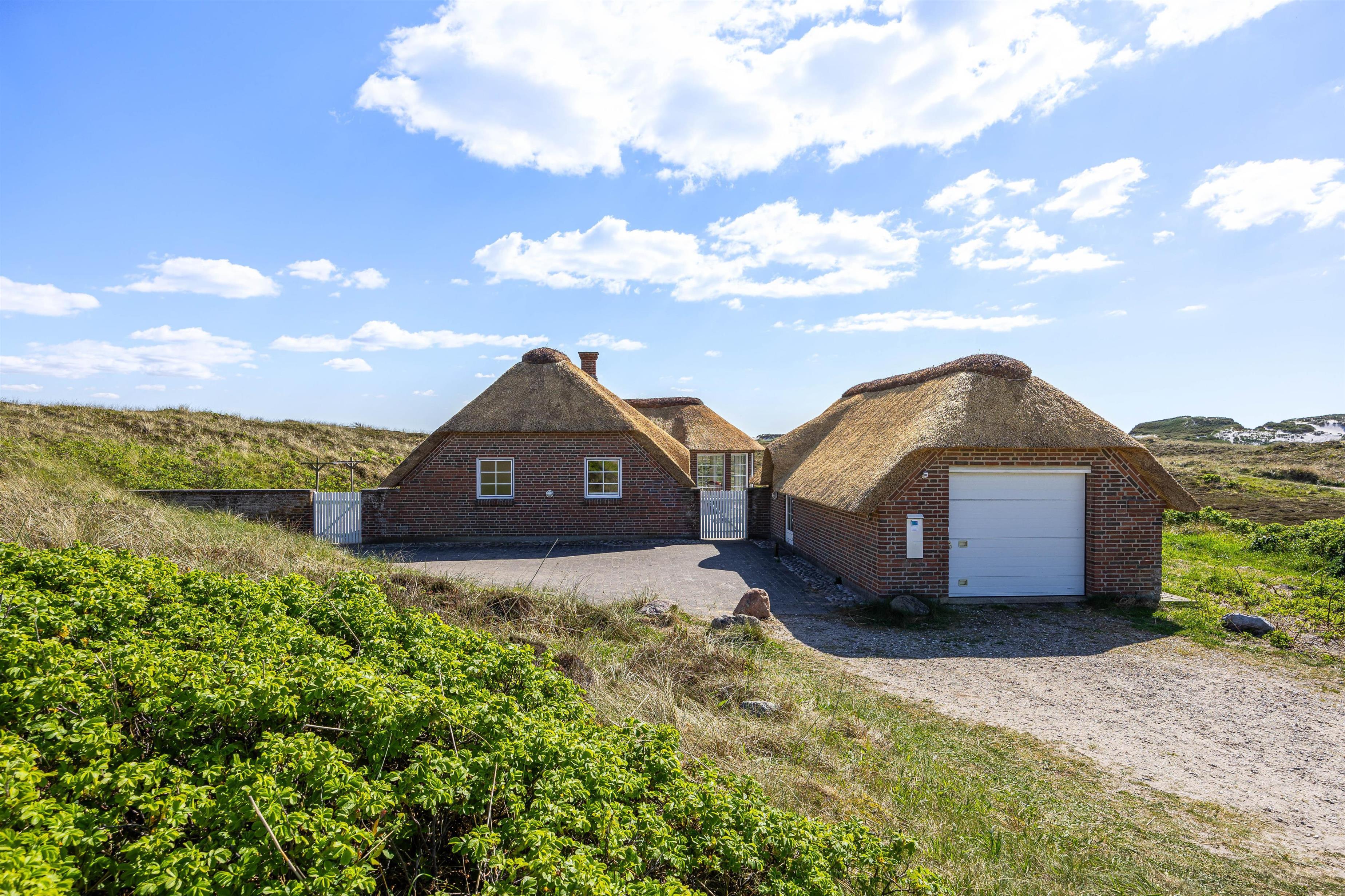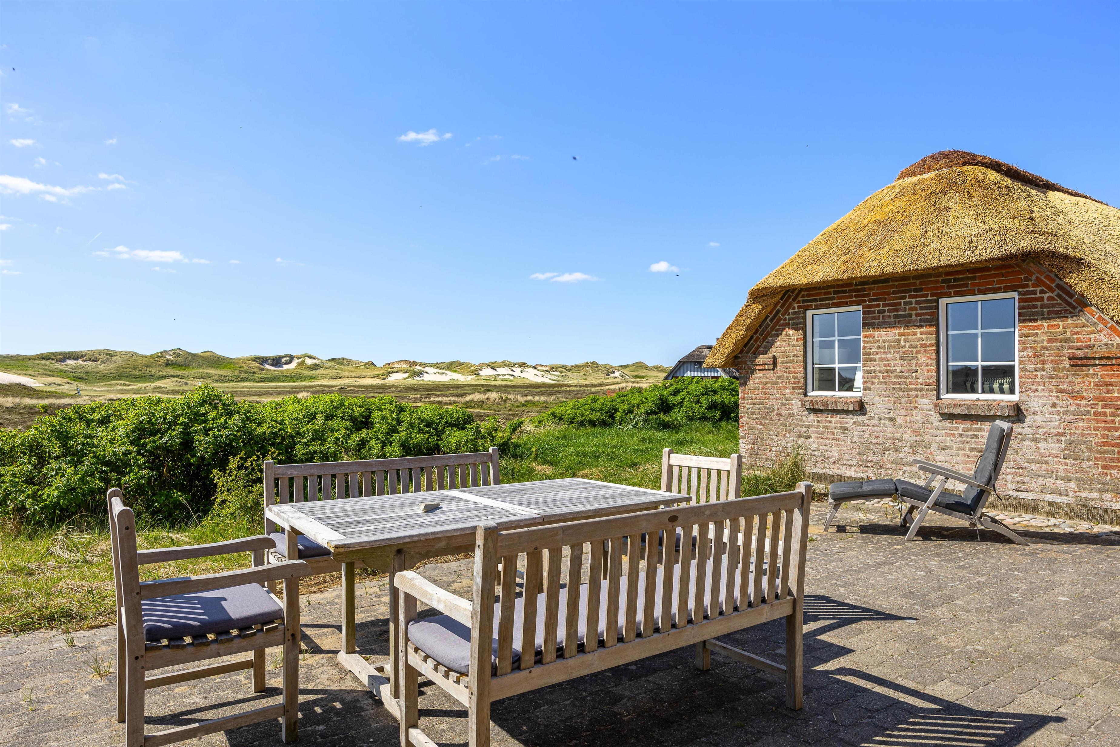 Som et ægte glansbillede ligger det stråtækte sommerhus med udsigt udover den smukke natur. Når I er ankommet, kan I trygt parkere bilen i garagen og nyde solskinnet fra terrassen. Sommerhuset har flere lækre terrasser, hvor I kan sidde ude i det gode vejr, og især gården mod sydøst er fantastisk først på dagen. Med god afskærmning, mod øst af klitten og mod vest af huset, kan I til hver en tid nyde den friske luft og de flotte omgivelser i læ for vinden.