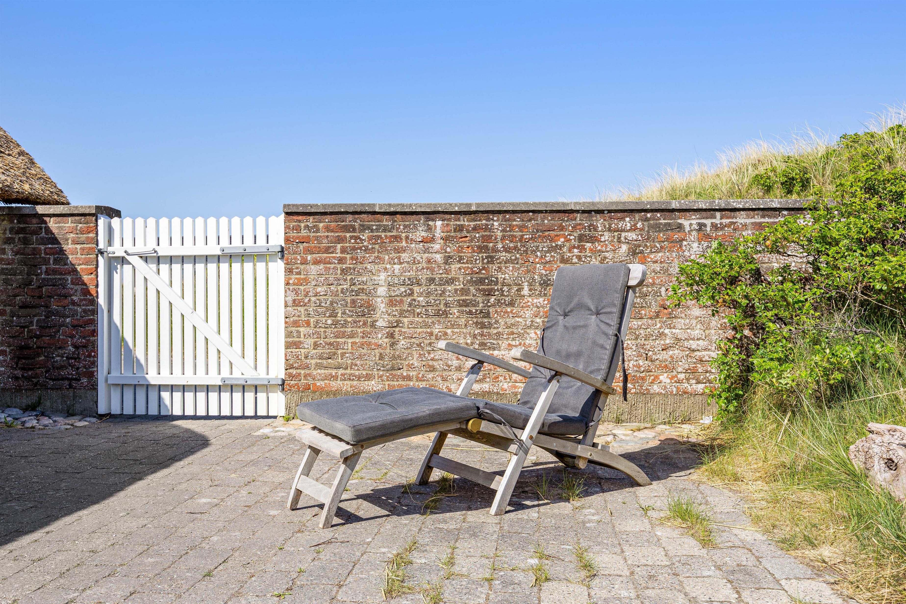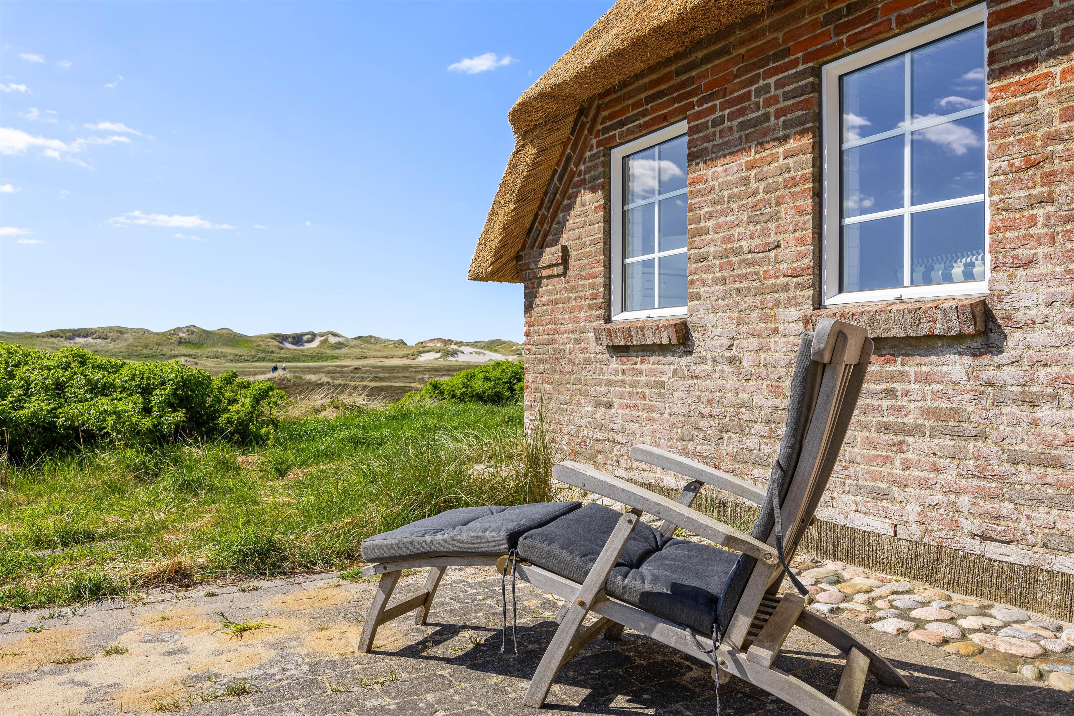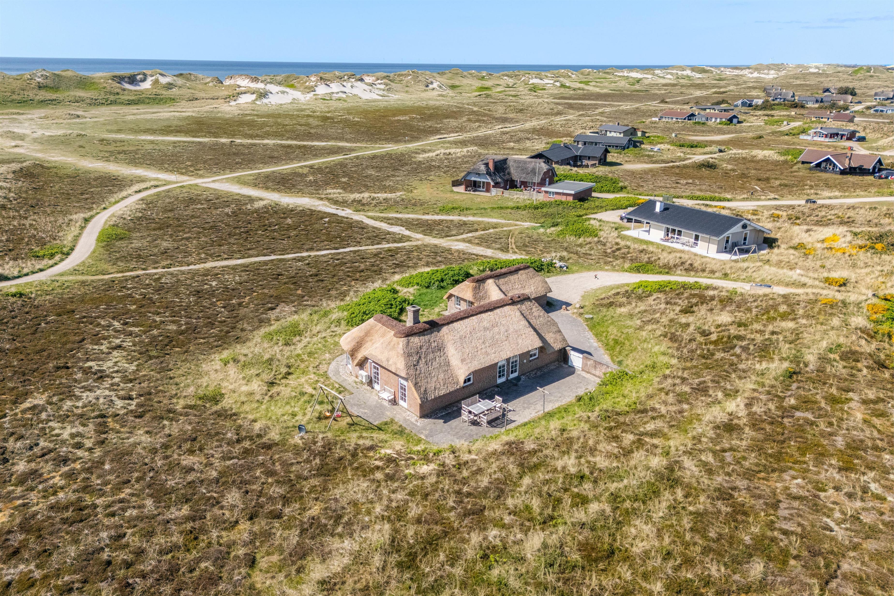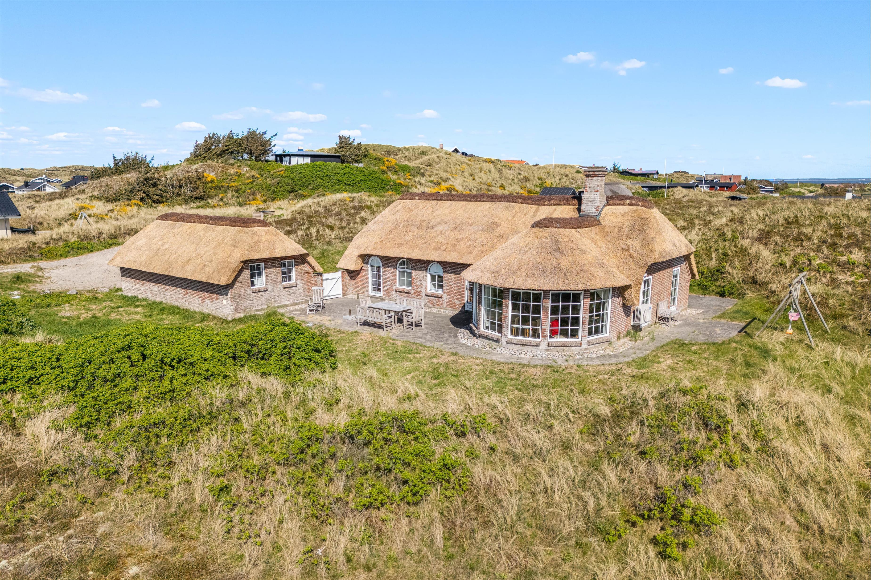 Som et ægte glansbillede ligger det stråtækte sommerhus med udsigt udover den smukke natur. Når I er ankommet, kan I trygt parkere bilen i garagen og nyde solskinnet fra terrassen. Sommerhuset har flere lækre terrasser, hvor I kan sidde ude i det gode vejr, og især gården mod sydøst er fantastisk først på dagen. Med god afskærmning, mod øst af klitten og mod vest af huset, kan I til hver en tid nyde den friske luft og de flotte omgivelser i læ for vinden.