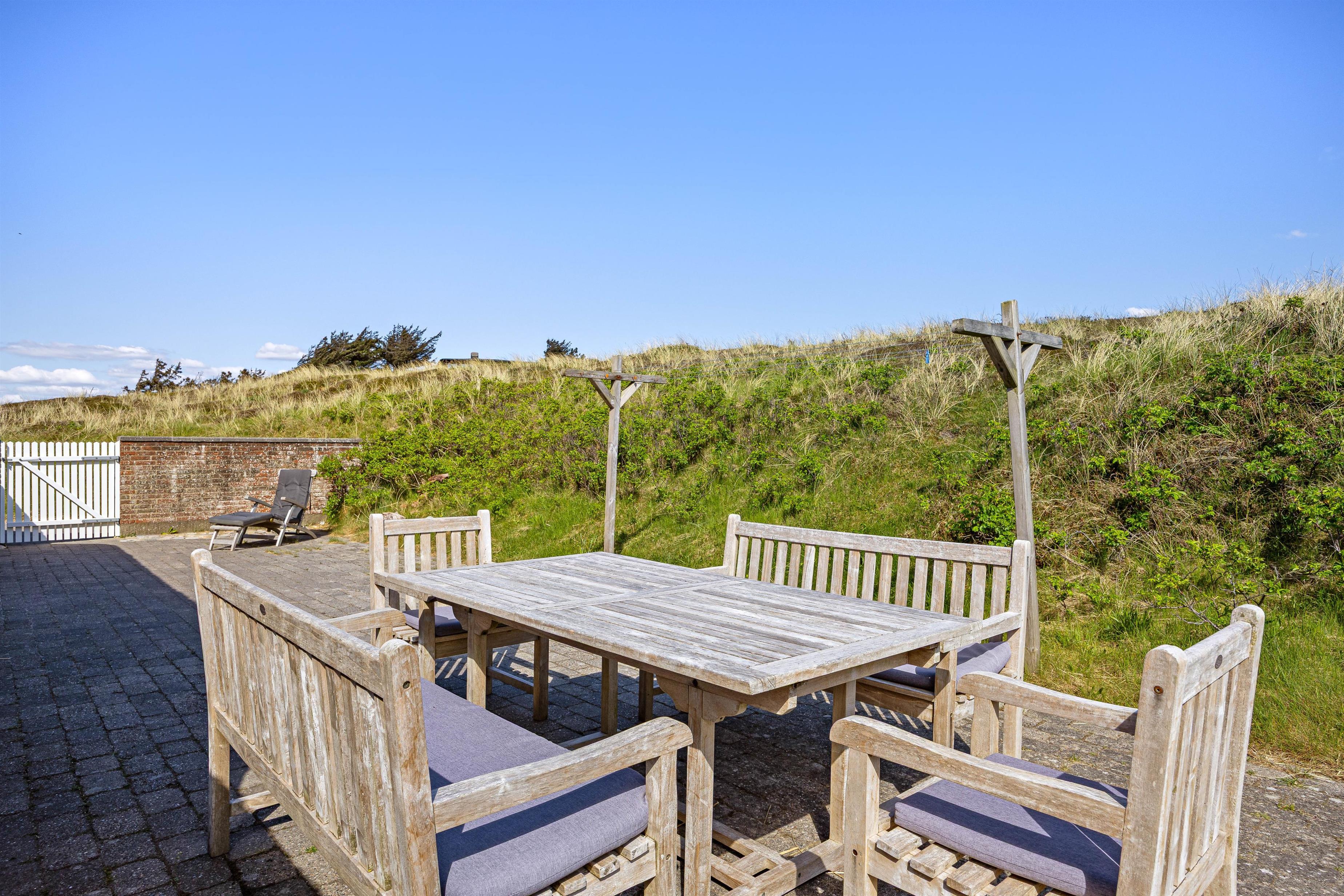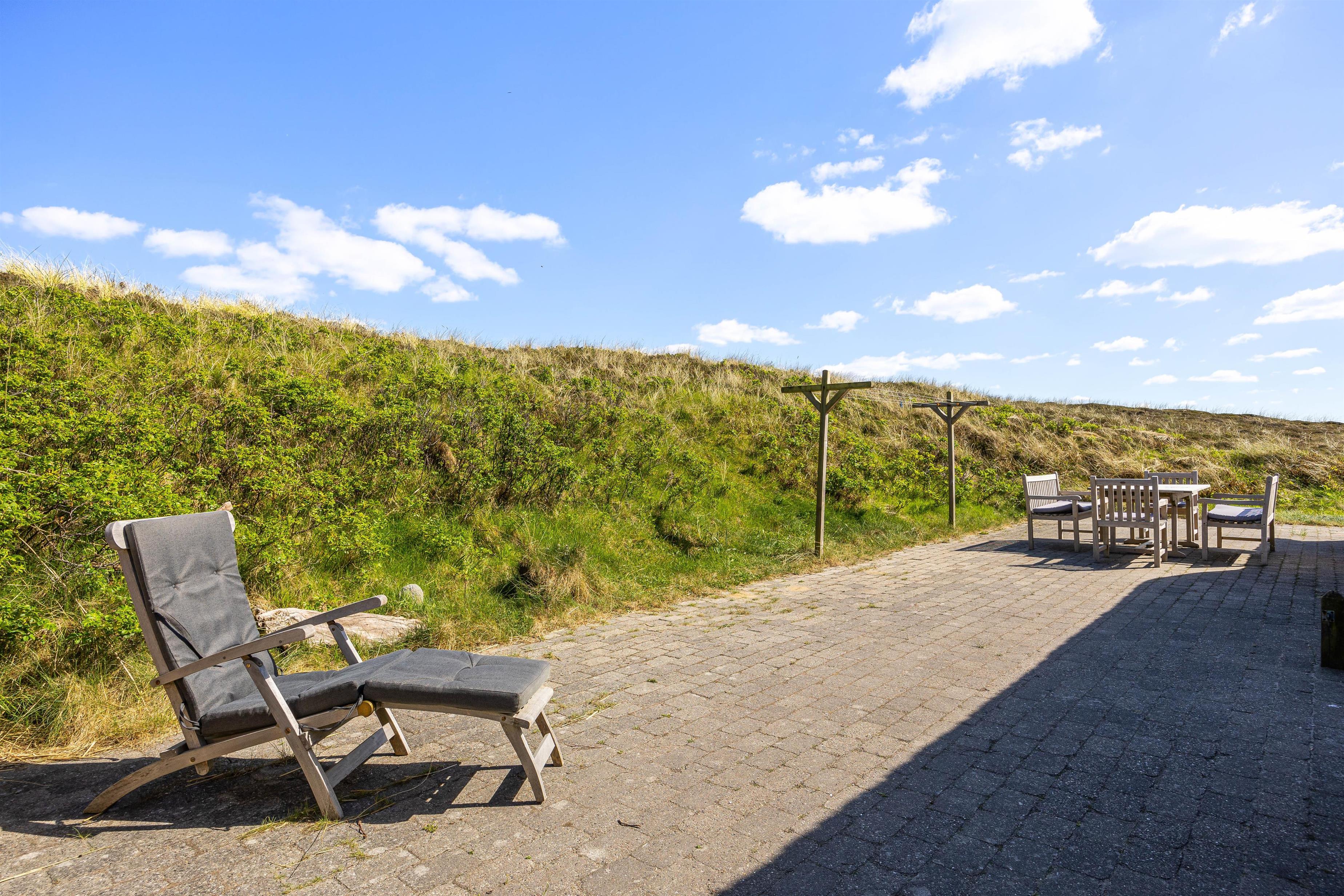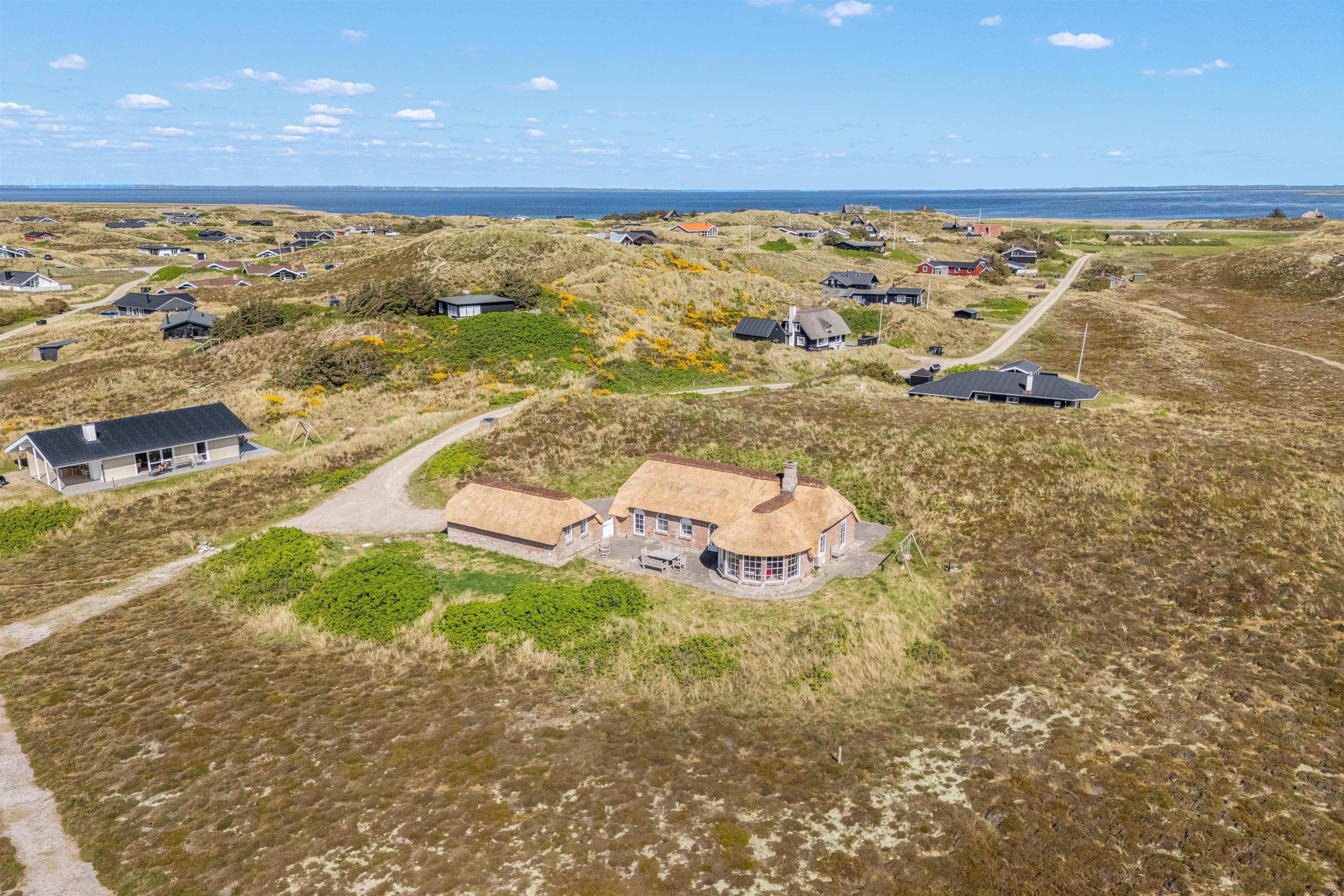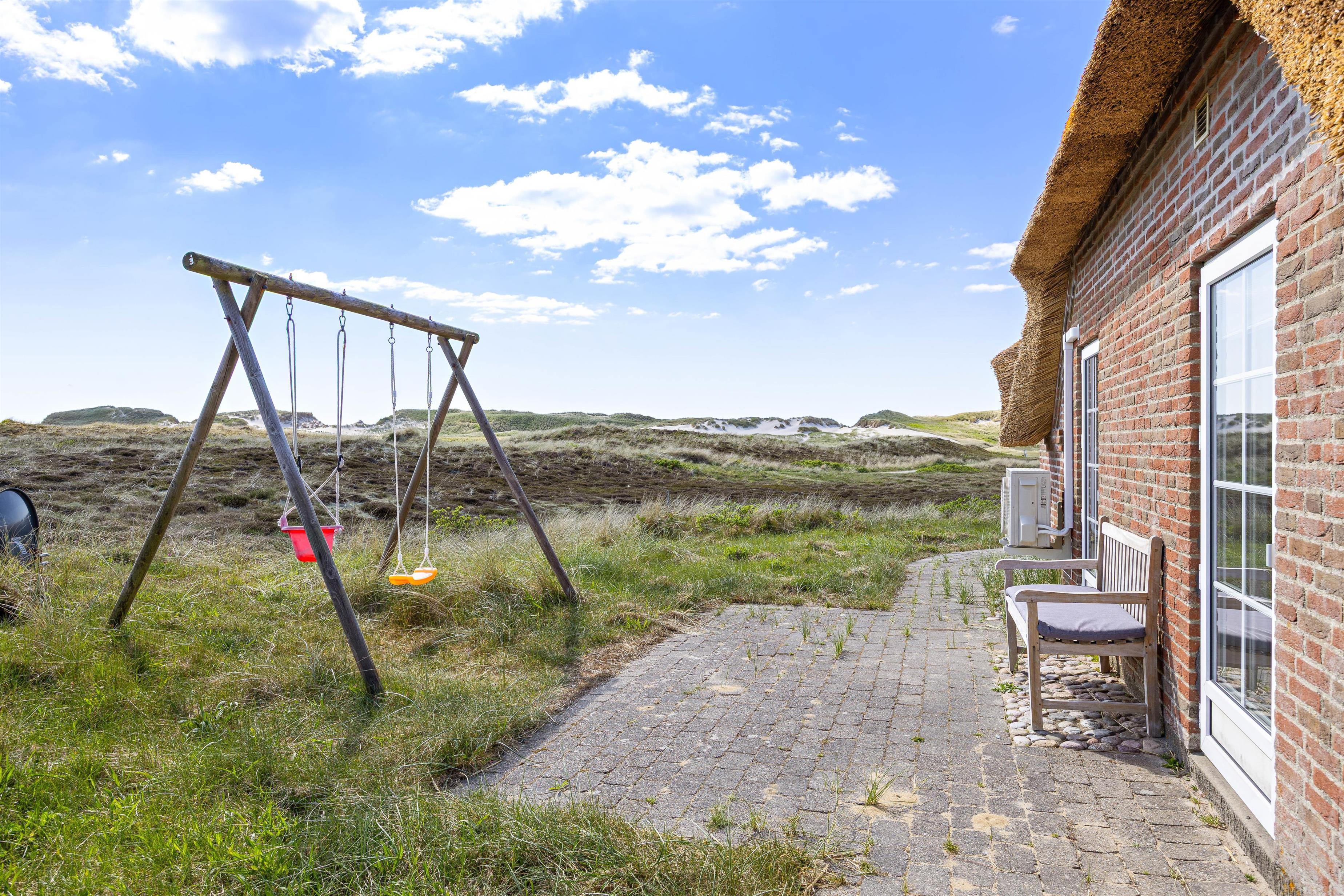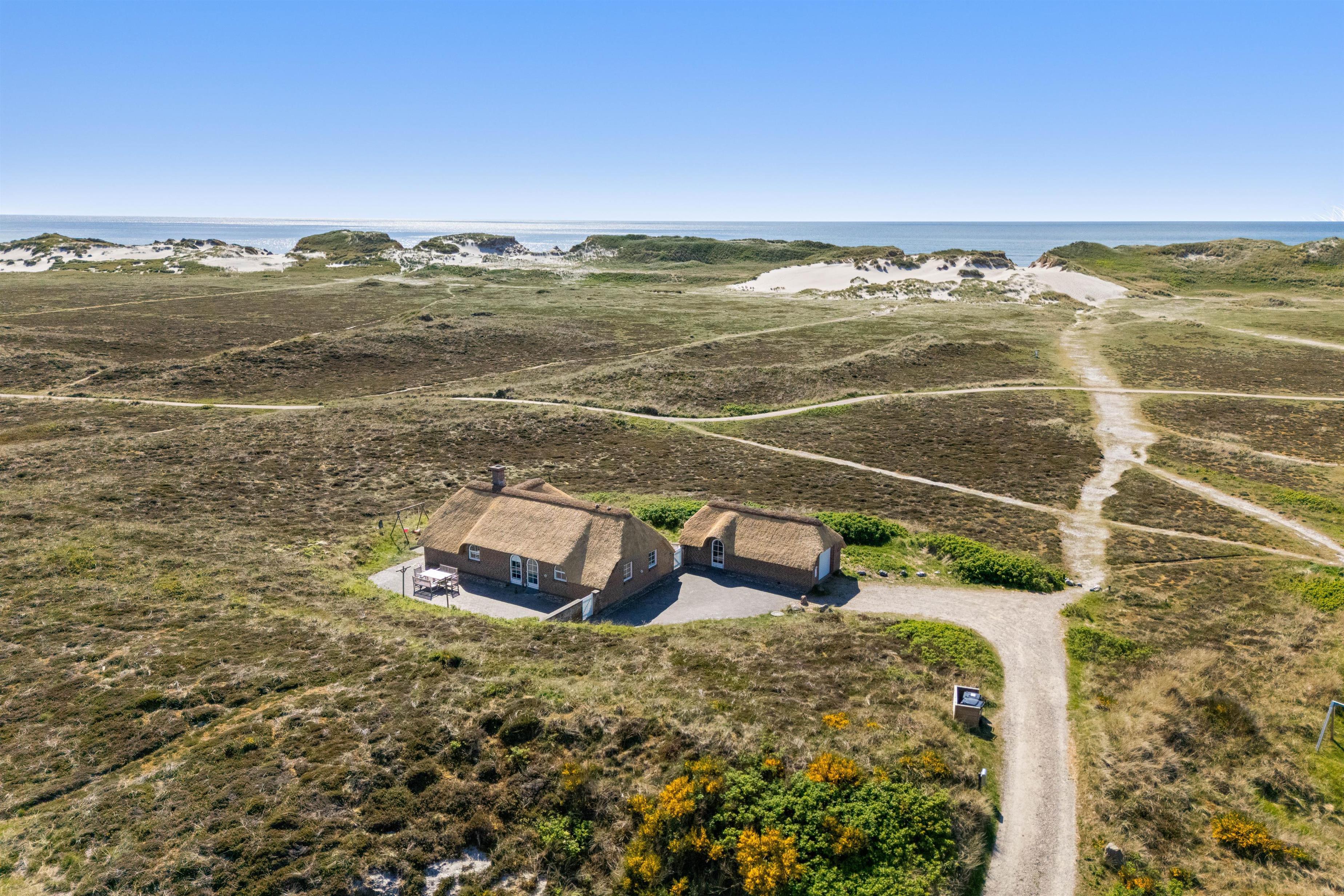 Som et ægte glansbillede ligger det stråtækte sommerhus med udsigt udover den smukke natur. Når I er ankommet, kan I trygt parkere bilen i garagen og nyde solskinnet fra terrassen. Sommerhuset har flere lækre terrasser, hvor I kan sidde ude i det gode vejr, og især gården mod sydøst er fantastisk først på dagen. Med god afskærmning, mod øst af klitten og mod vest af huset, kan I til hver en tid nyde den friske luft og de flotte omgivelser i læ for vinden.