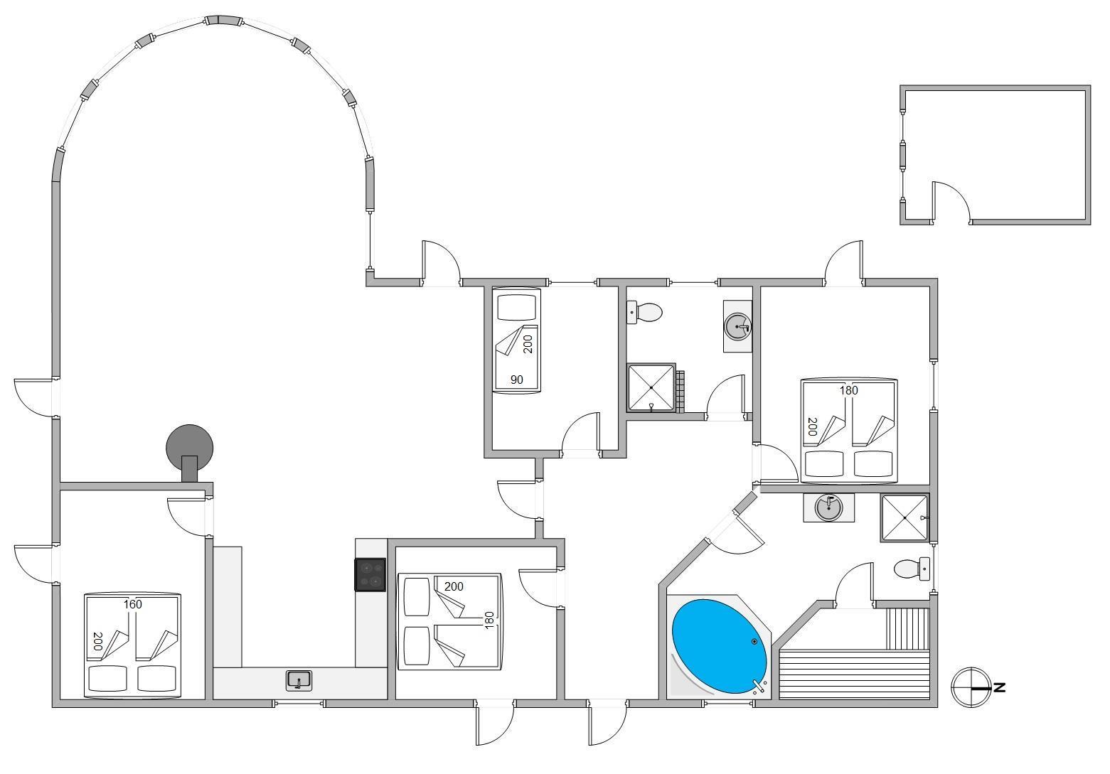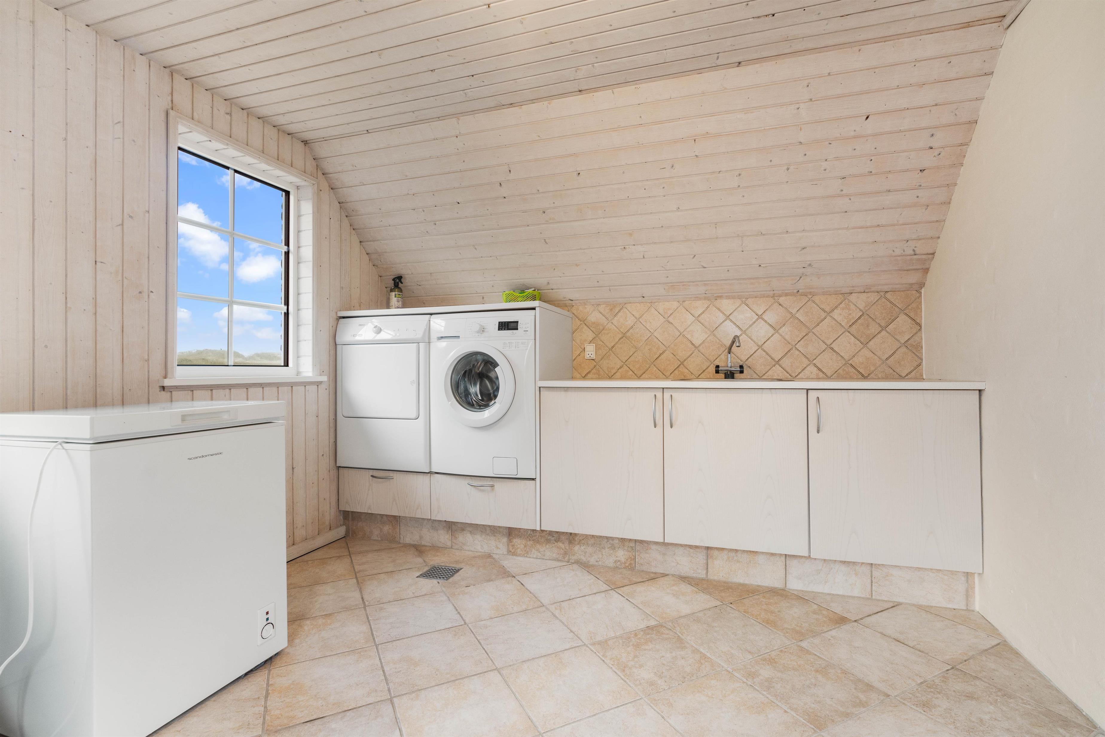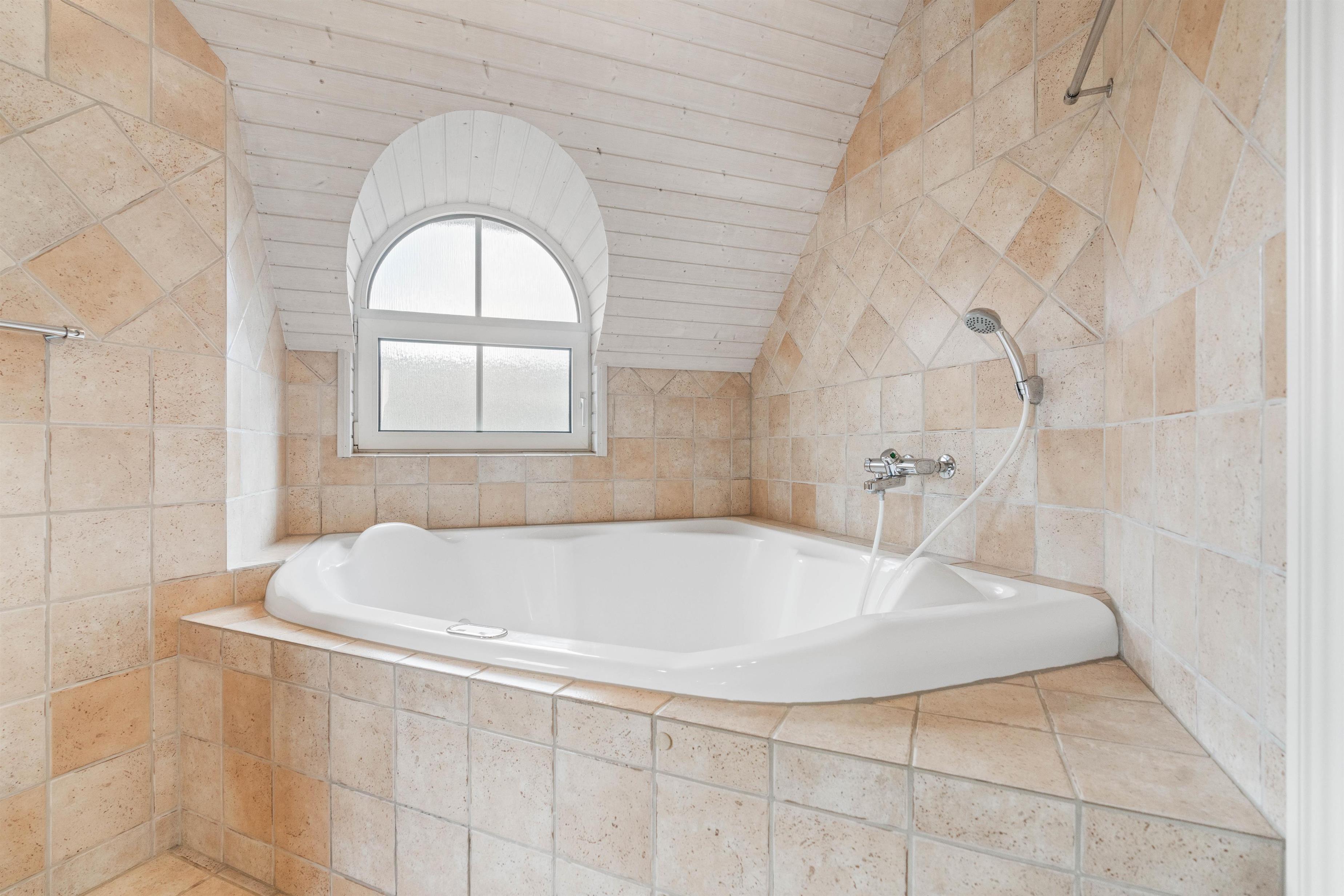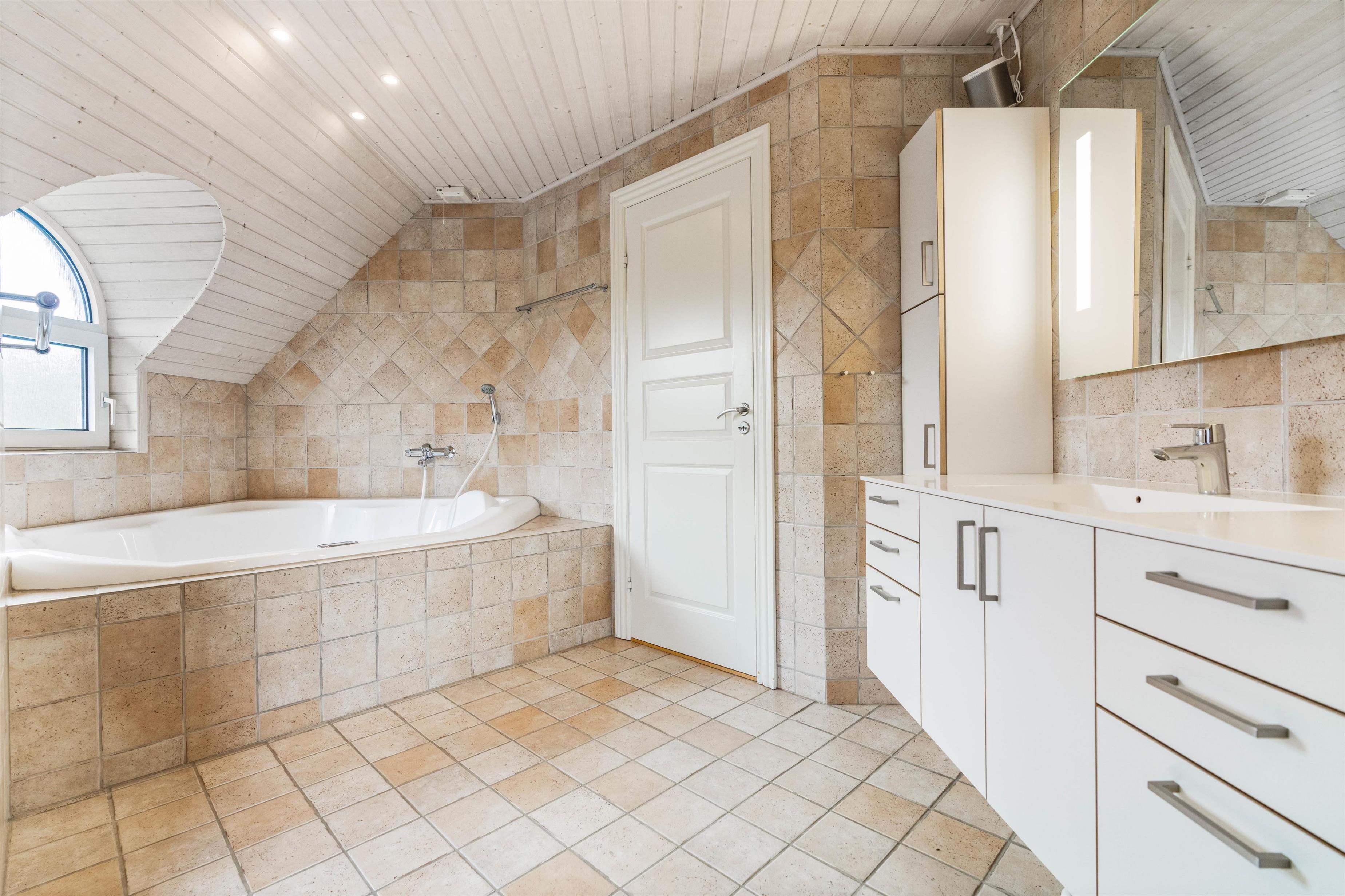 Når I skal forkæles, finder I spabad og sauna på det største af sommerhusets badeværelser. Her bliver hverdagens stress og jag hurtigt glemt – og I kan få varmen i det boblende vand. Begge badeværelser er med gulvvarme, så I ikke fryser fødderne. Praktisk er det store bryggers indrettet med vaskemaskine og tørretumbler – perfekt hvis strandhåndklæderne skal opfriskes.