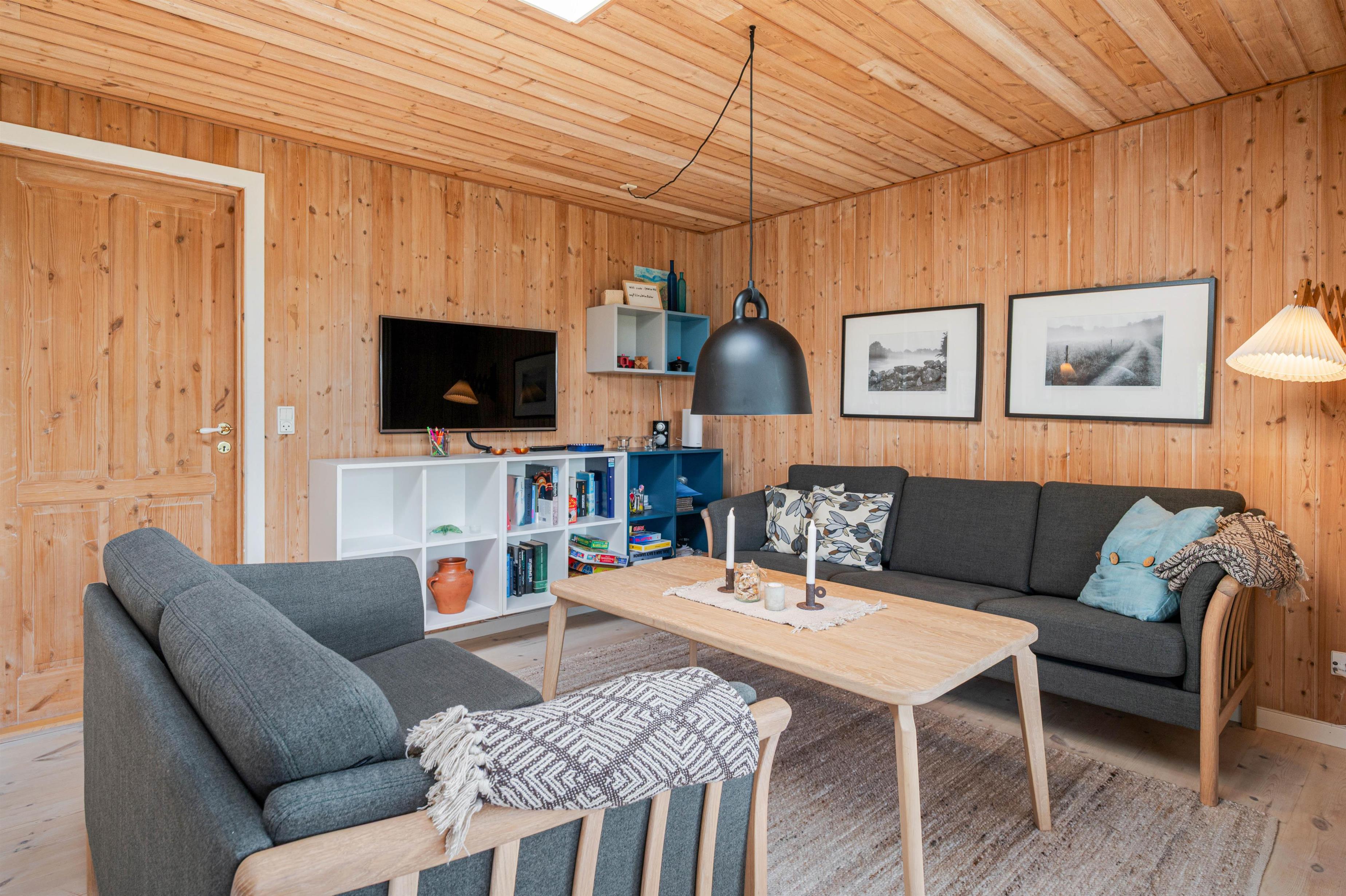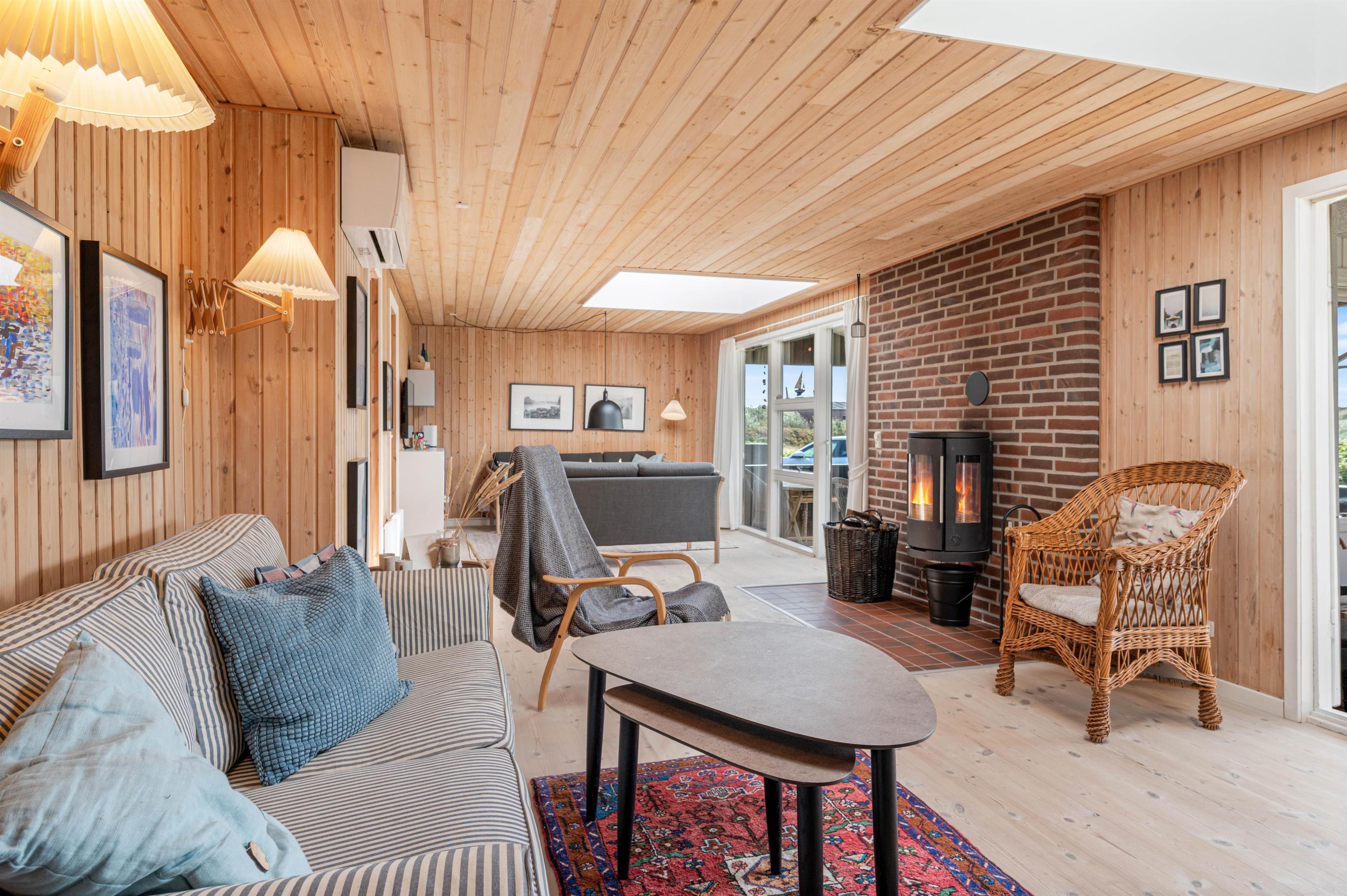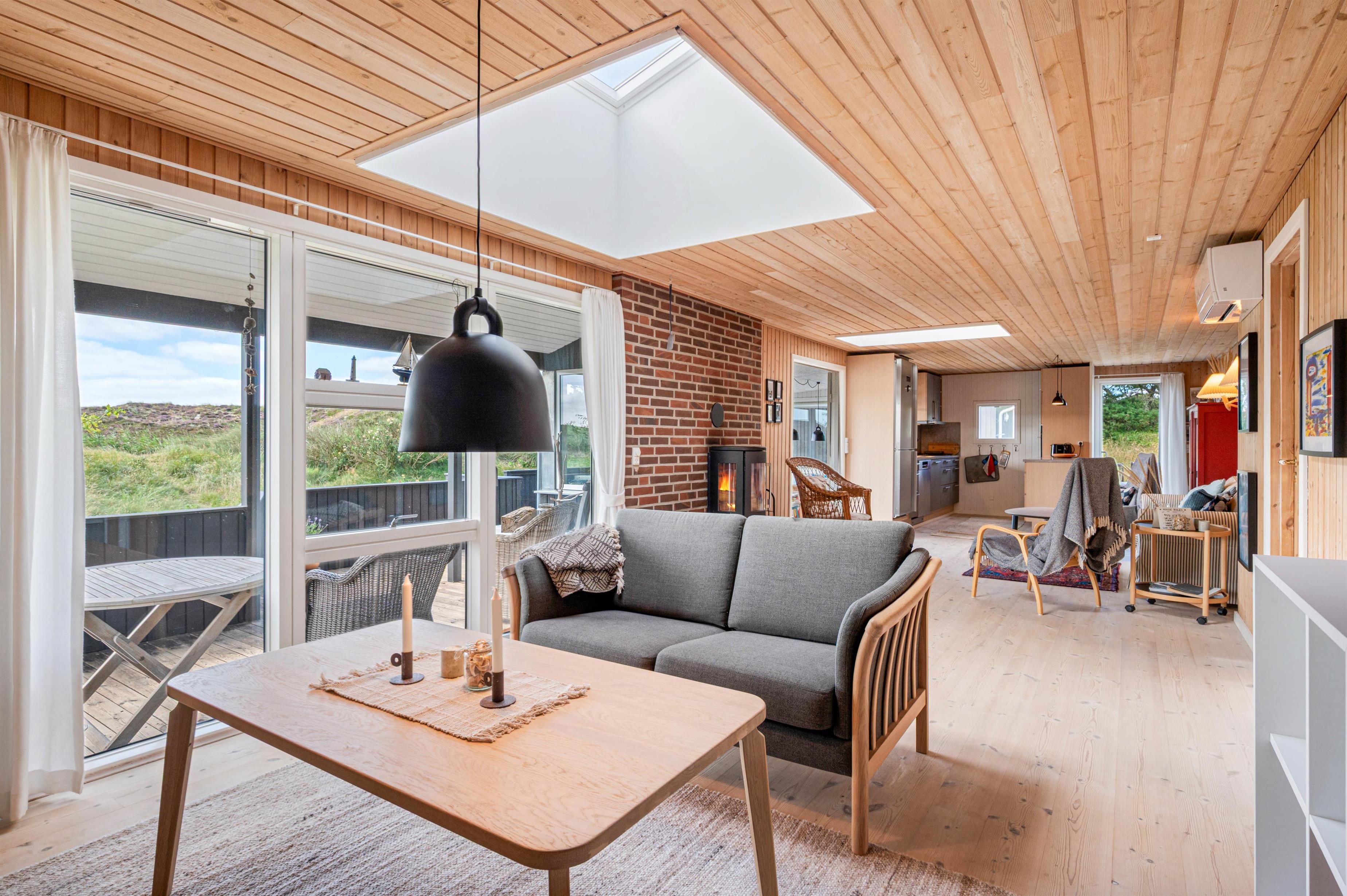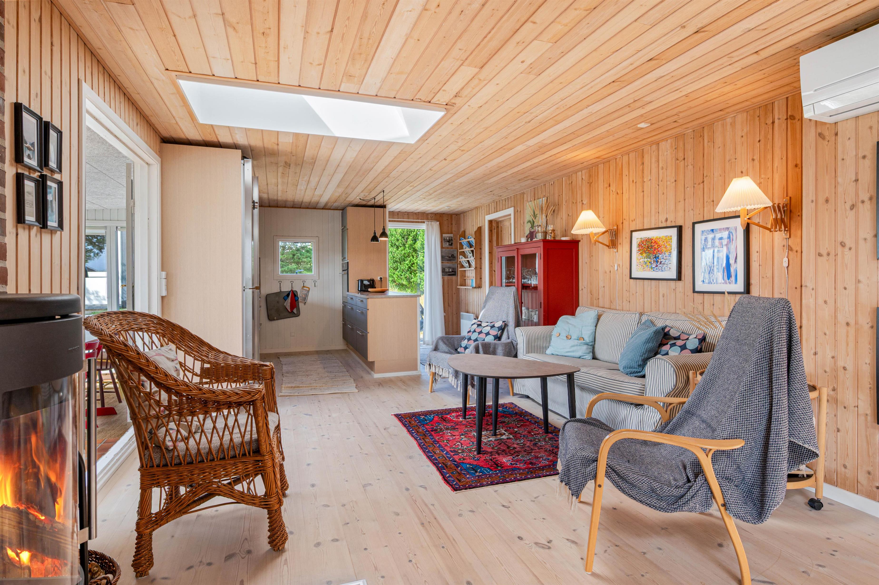 Det hyggelige træ-feriehus er bygget i 1960 og totalrenoveret i 2018, og det fremstår lyst og dejligt. Flere ovenlysvinduer giver et fantastisk lys i det kombinerede køkken- og opholdsrum, som er husets hjerte. Her kan man virkelig slappe af – evt. med en god bog og en kop kaffe foran den knitrende ild i brændeovnen.