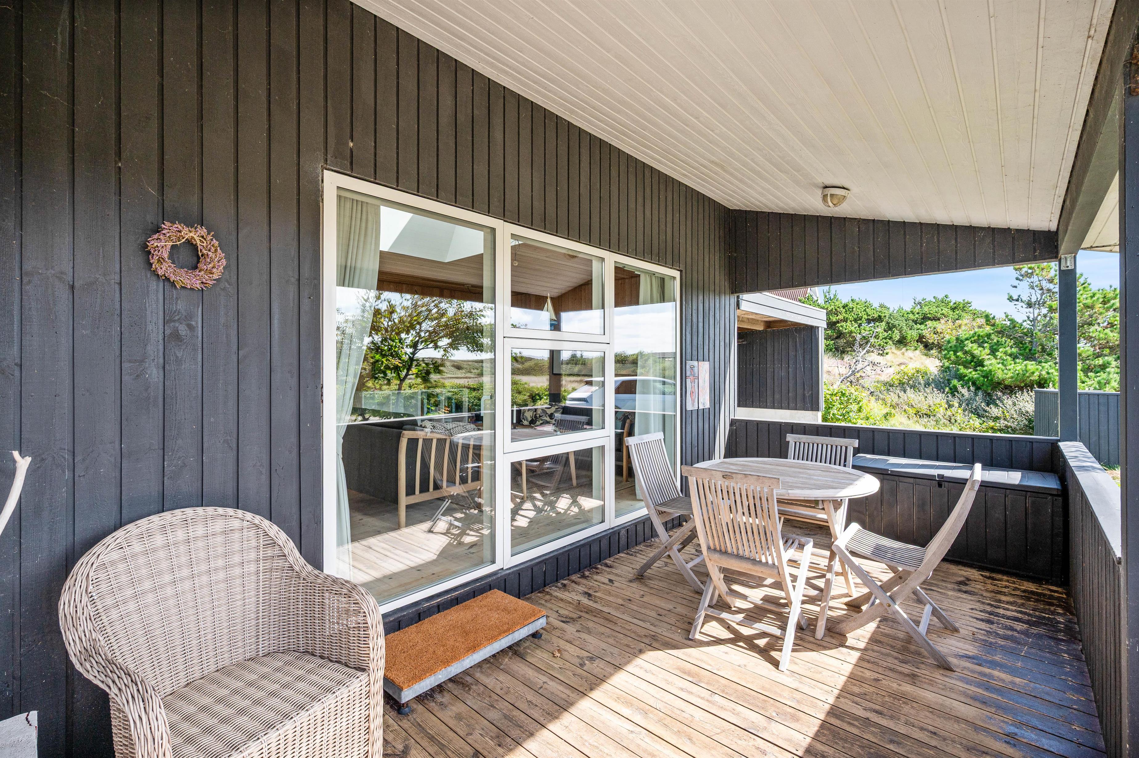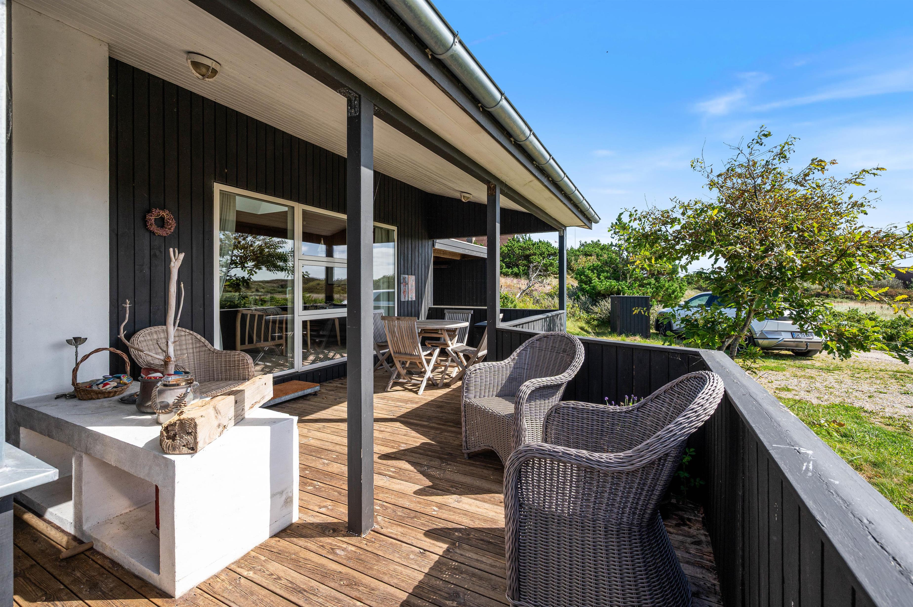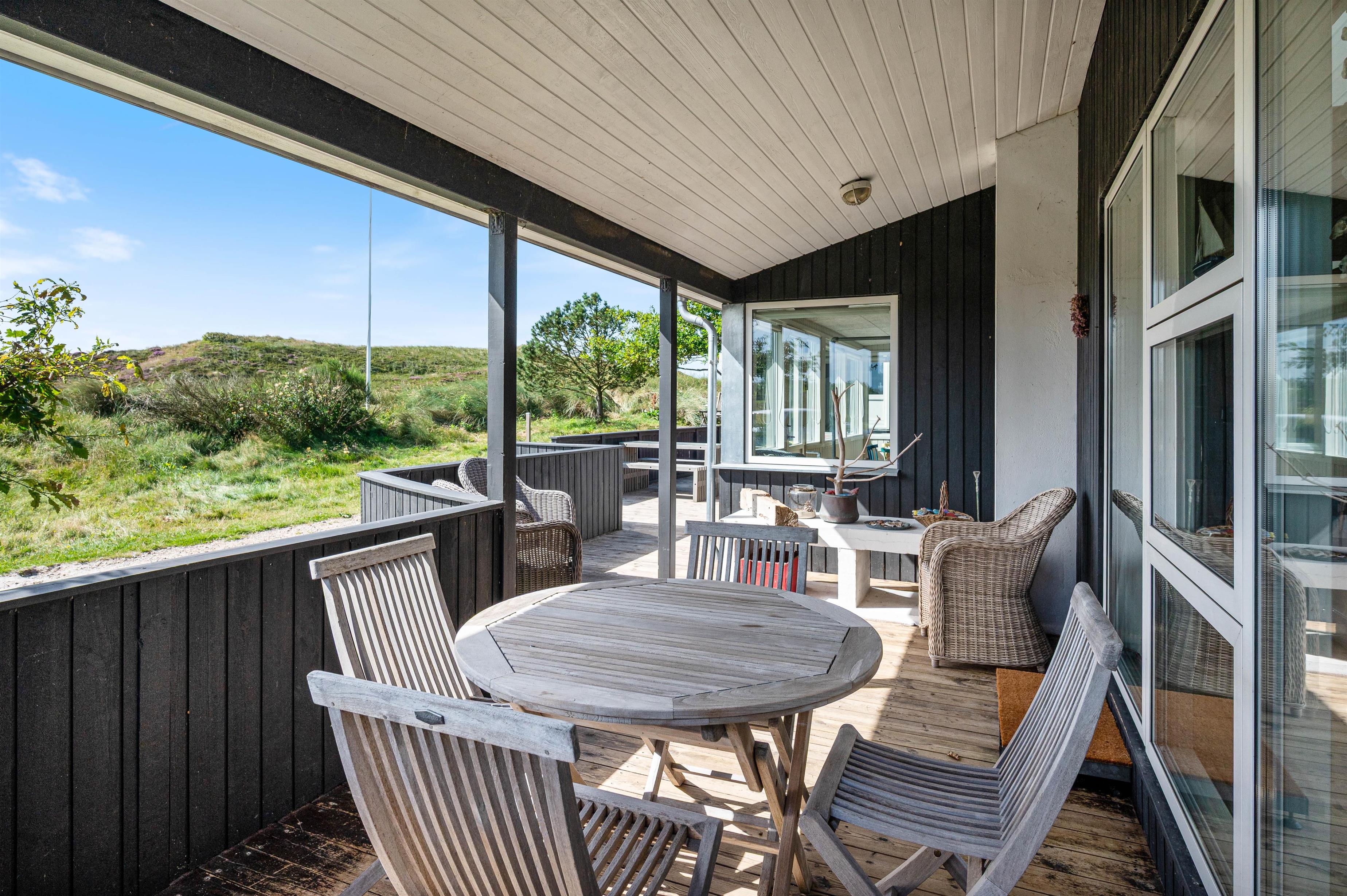 Hele vejen rundt om huset er der sørget for hyggelige siddepladser, så man kan nyde naturen overalt. Der er rig mulighed for at nyde solens stråler og den betagende natur på terrasserne rundt om huset og den overdækkede terrasse mod syd forlænger ”ude-tiden”. Med en udendørsbruser kan du hurtigt blive forfrisket eller skylle sand og salt bort efter sommerens strandture. Udebruseren kan benyttes fra april til november.