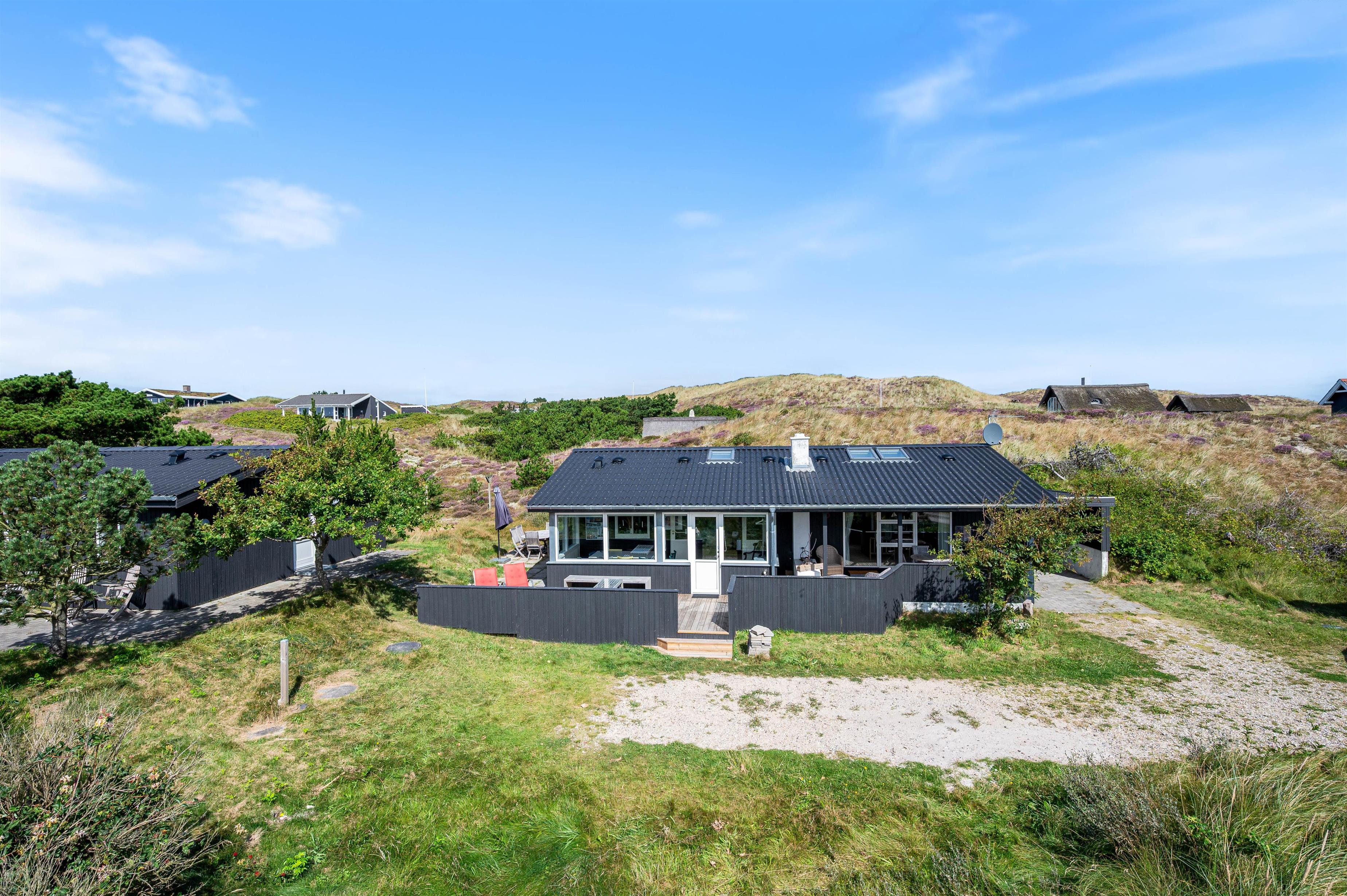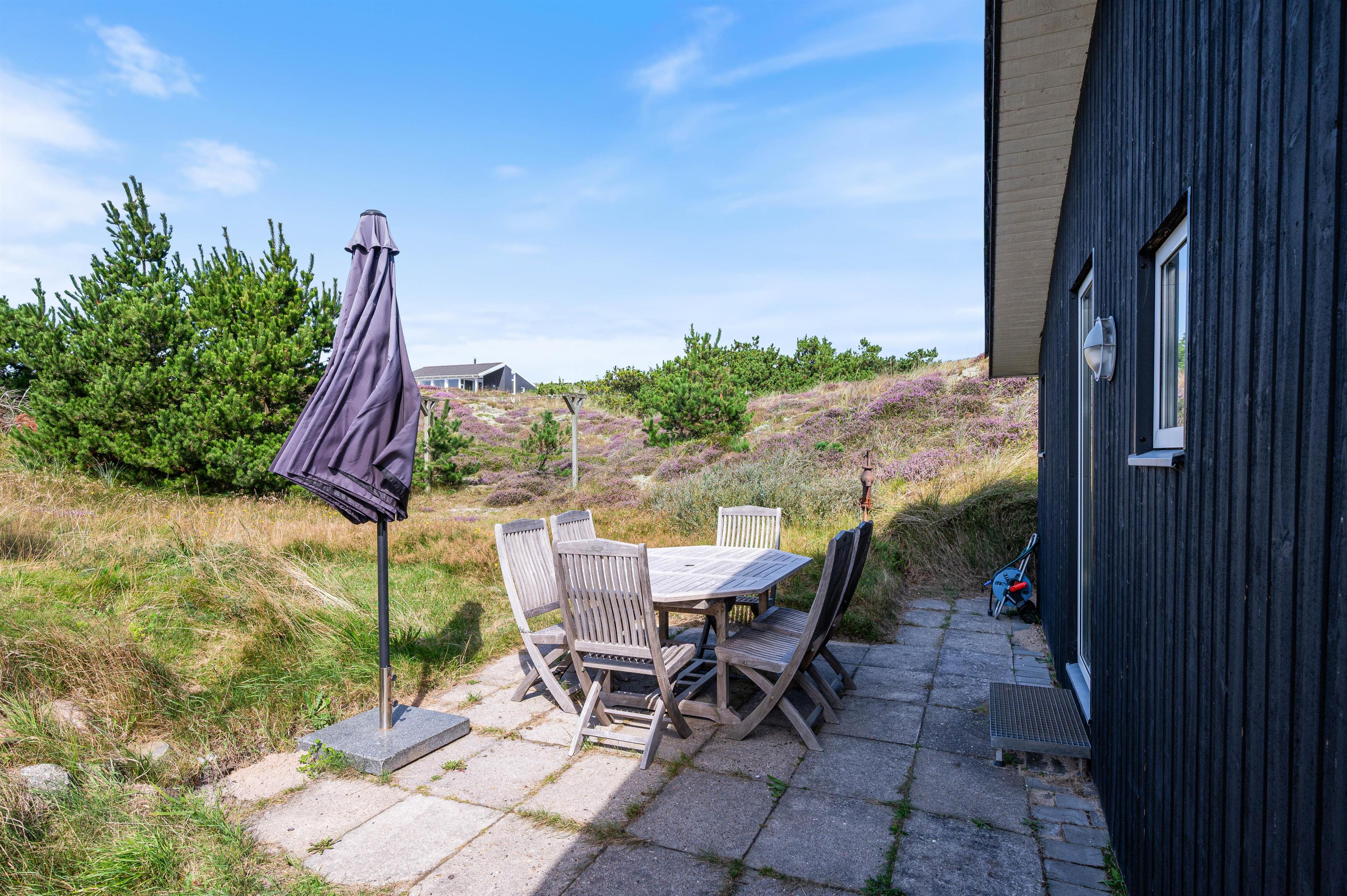 Huset ligger i på en kuperet naturgrund, hvor man fra toppen kan skimte Ringkøbing fjord – ca. 400 m væk – og man kan se de yderste klitrækker – også kun 400 meter væk.