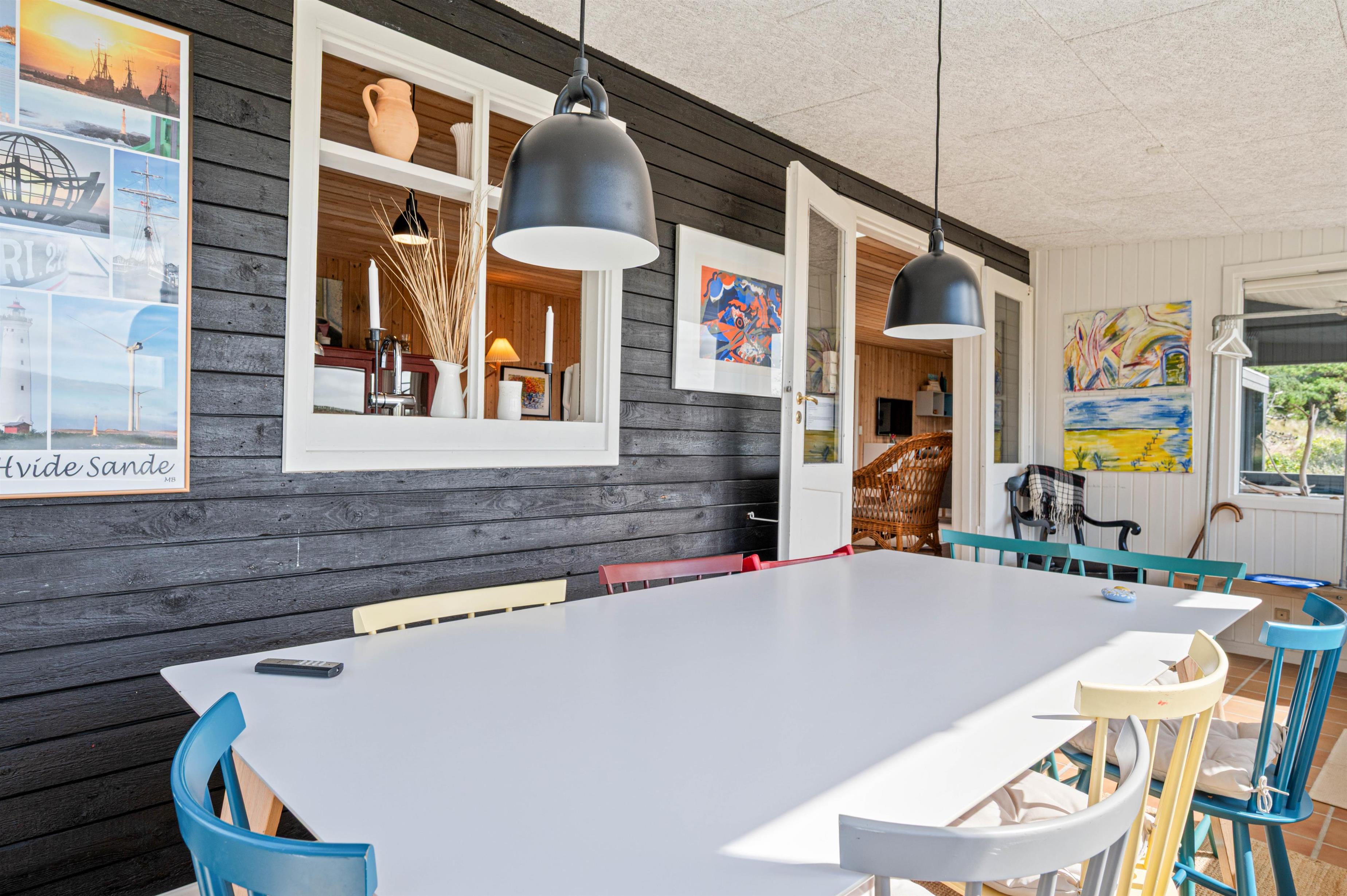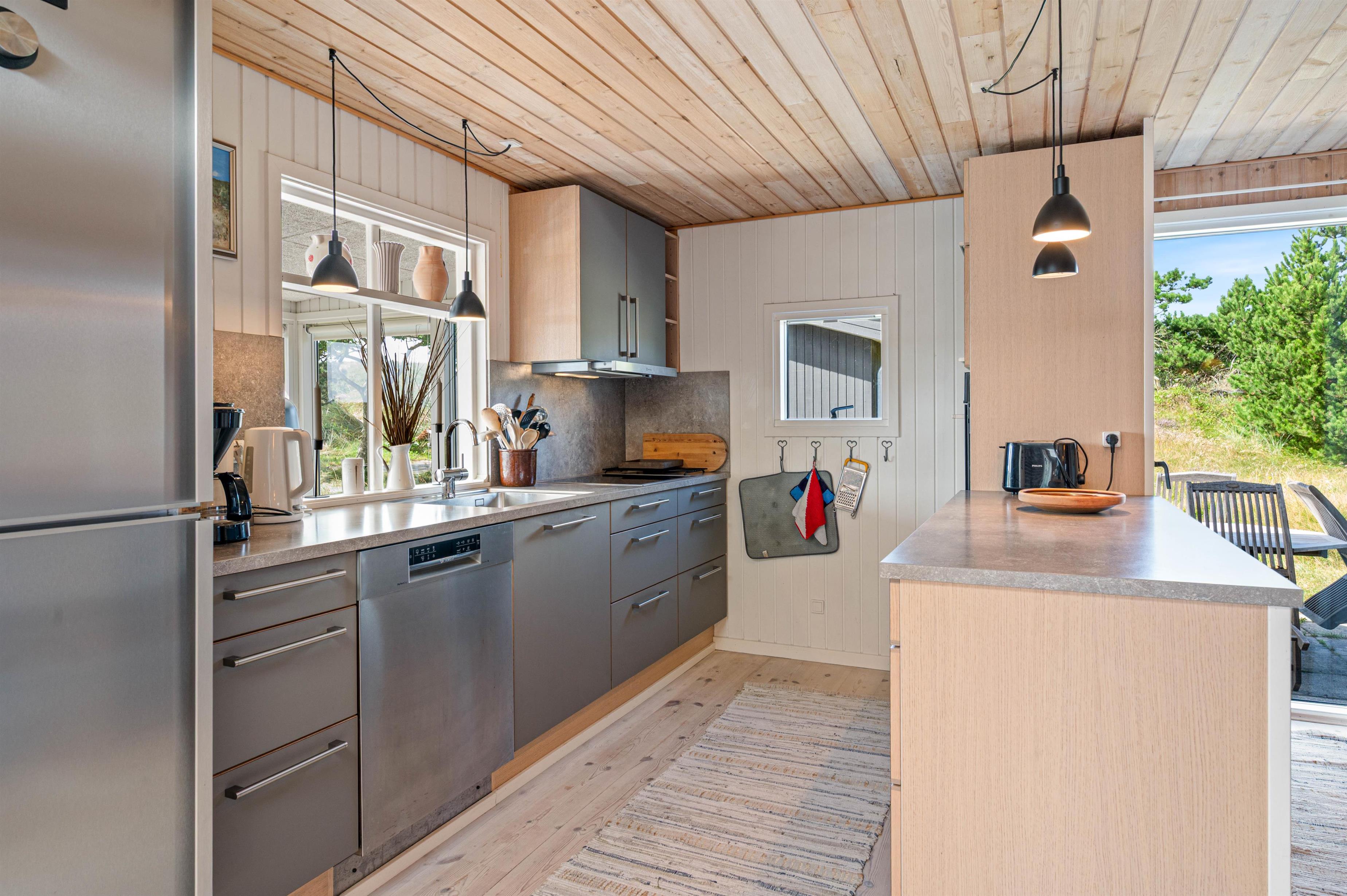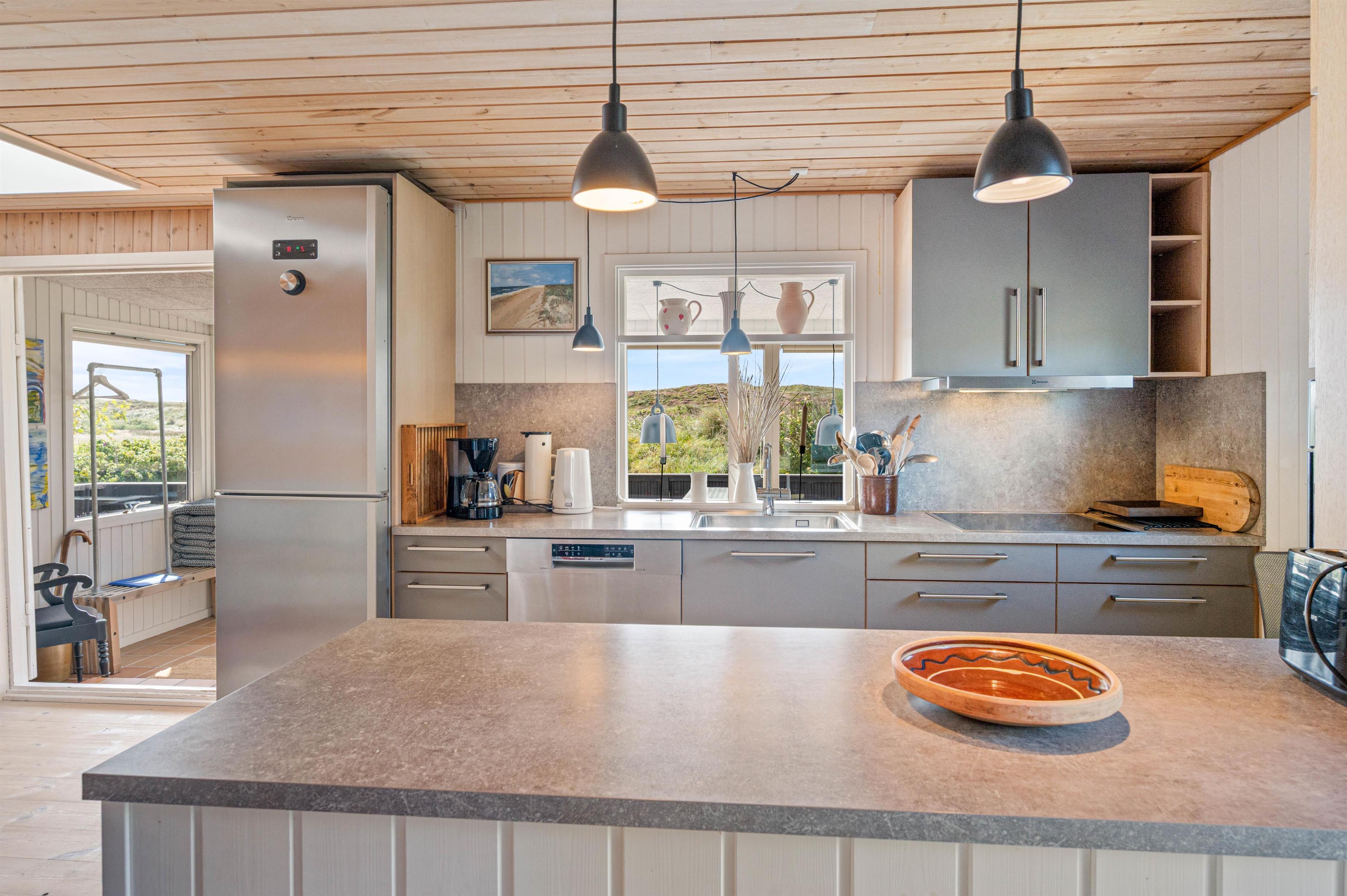 Køkkenafdelingen er blandt andet udstyret med mikroovn og opvaskemaskine, hvilket gør køkken-tjansen så meget nemmere. Fra spisestuen har man, pga. de store vinduespartier, også dette helt unikke og vilde klit-landskab helt tæt på.