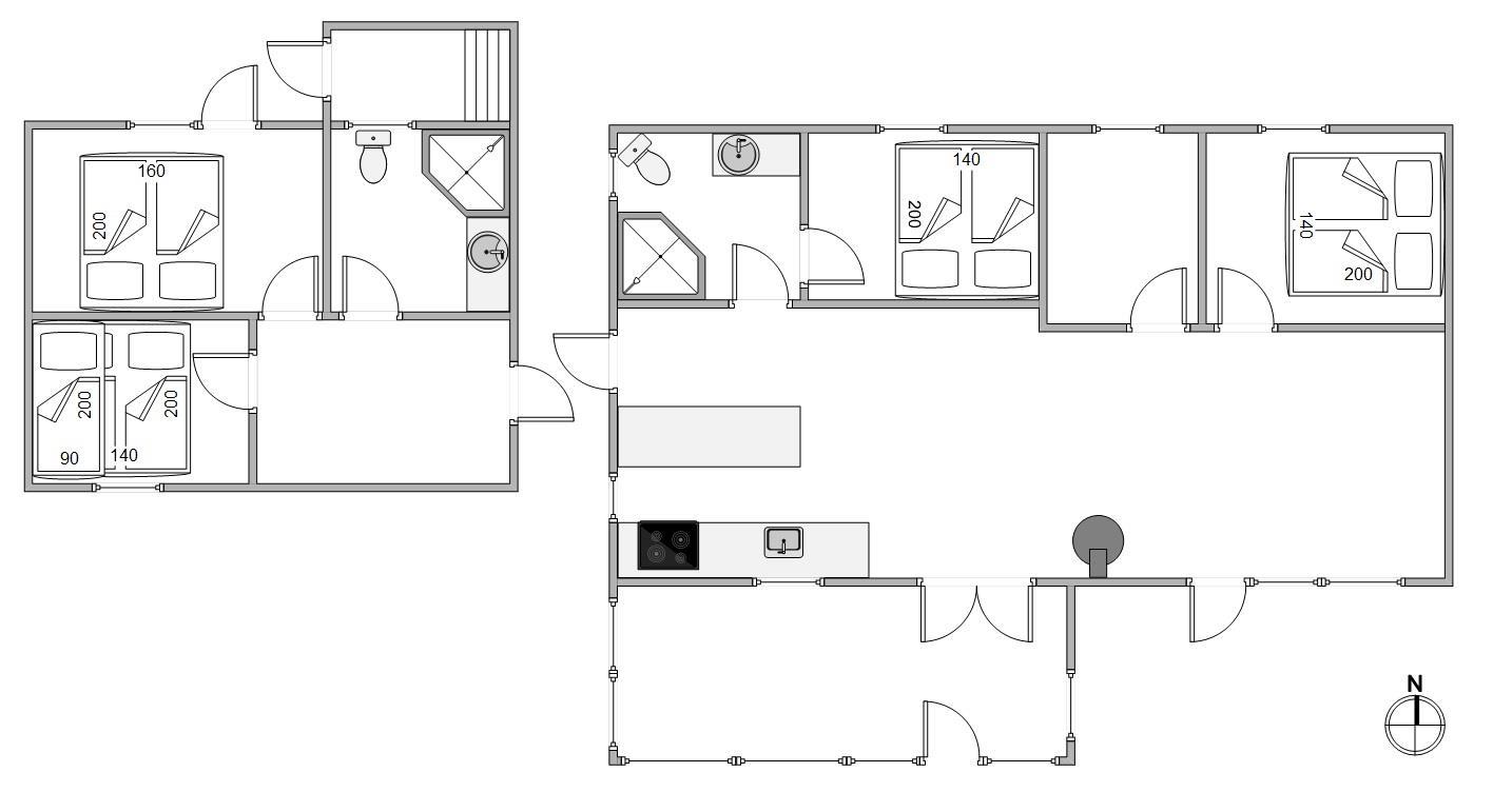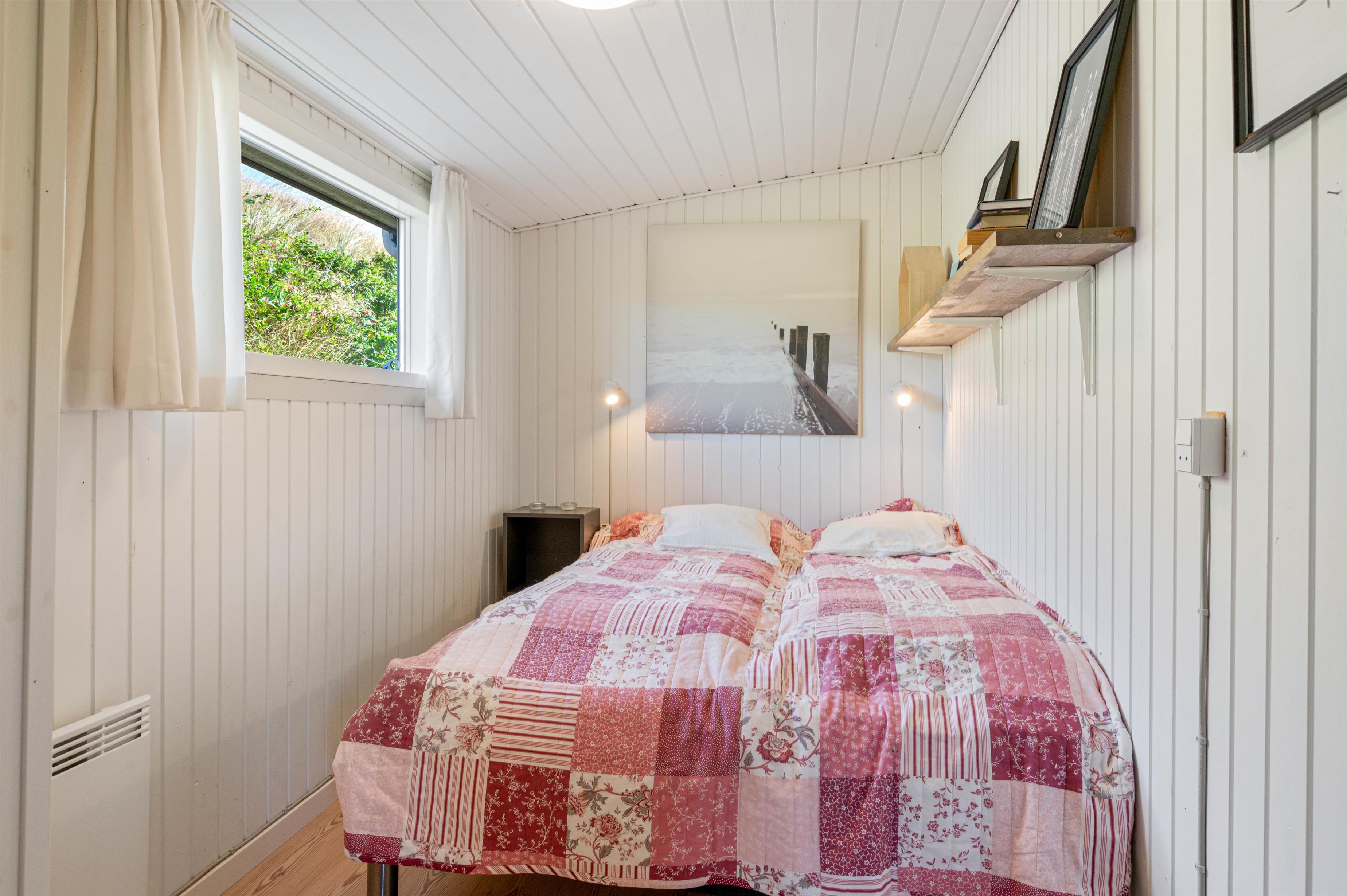 Sovepladserne er fordelt i 4 soverum med hver en dobbeltseng – 2 soveværelser i hovedhuset og 2 soveværelser i annexet. Der findes også badeværelse med gulvvarme, både i annexet og i hovedhuset.