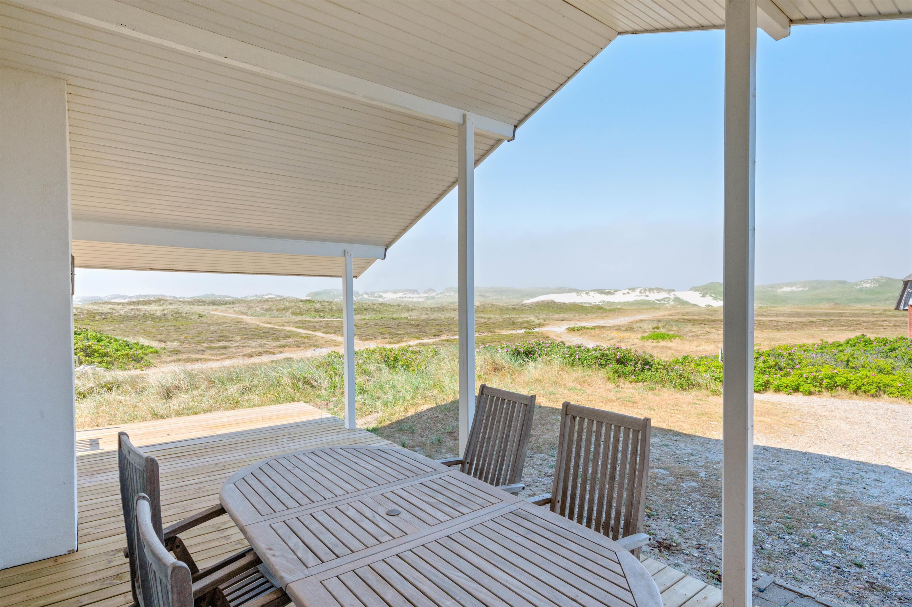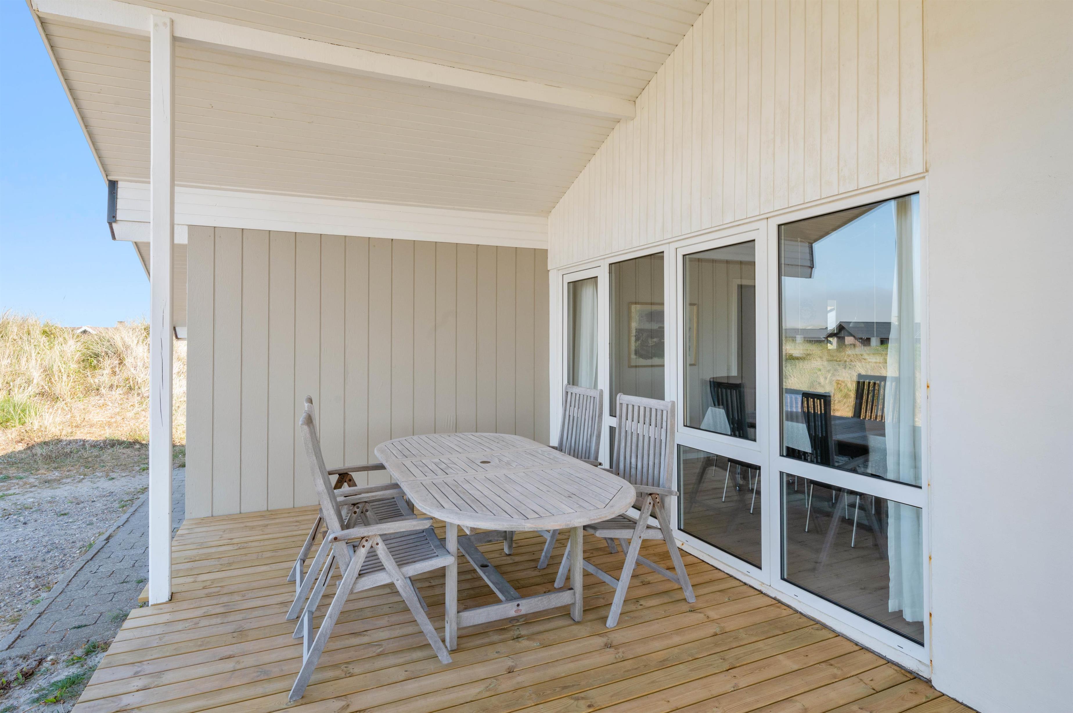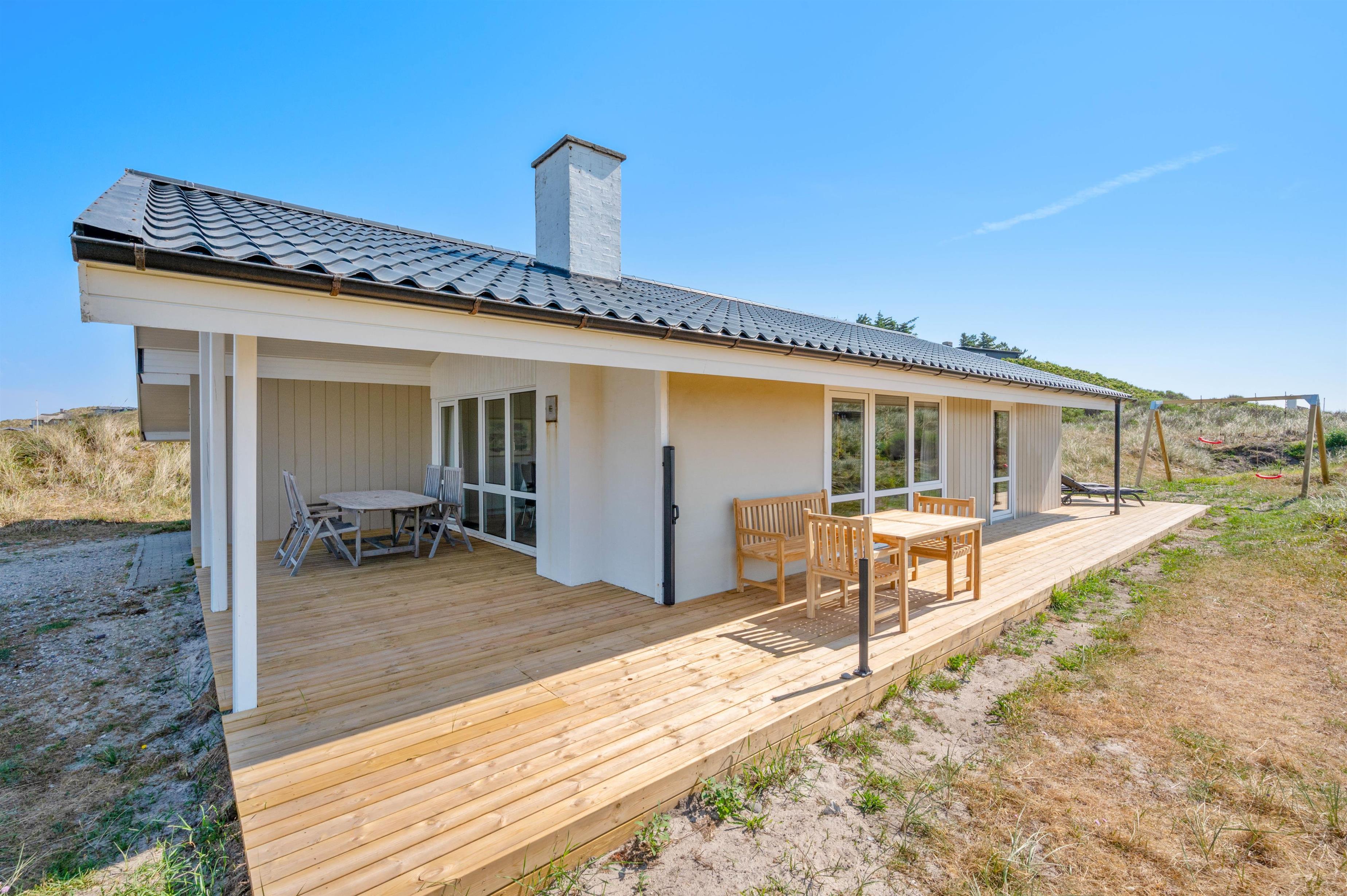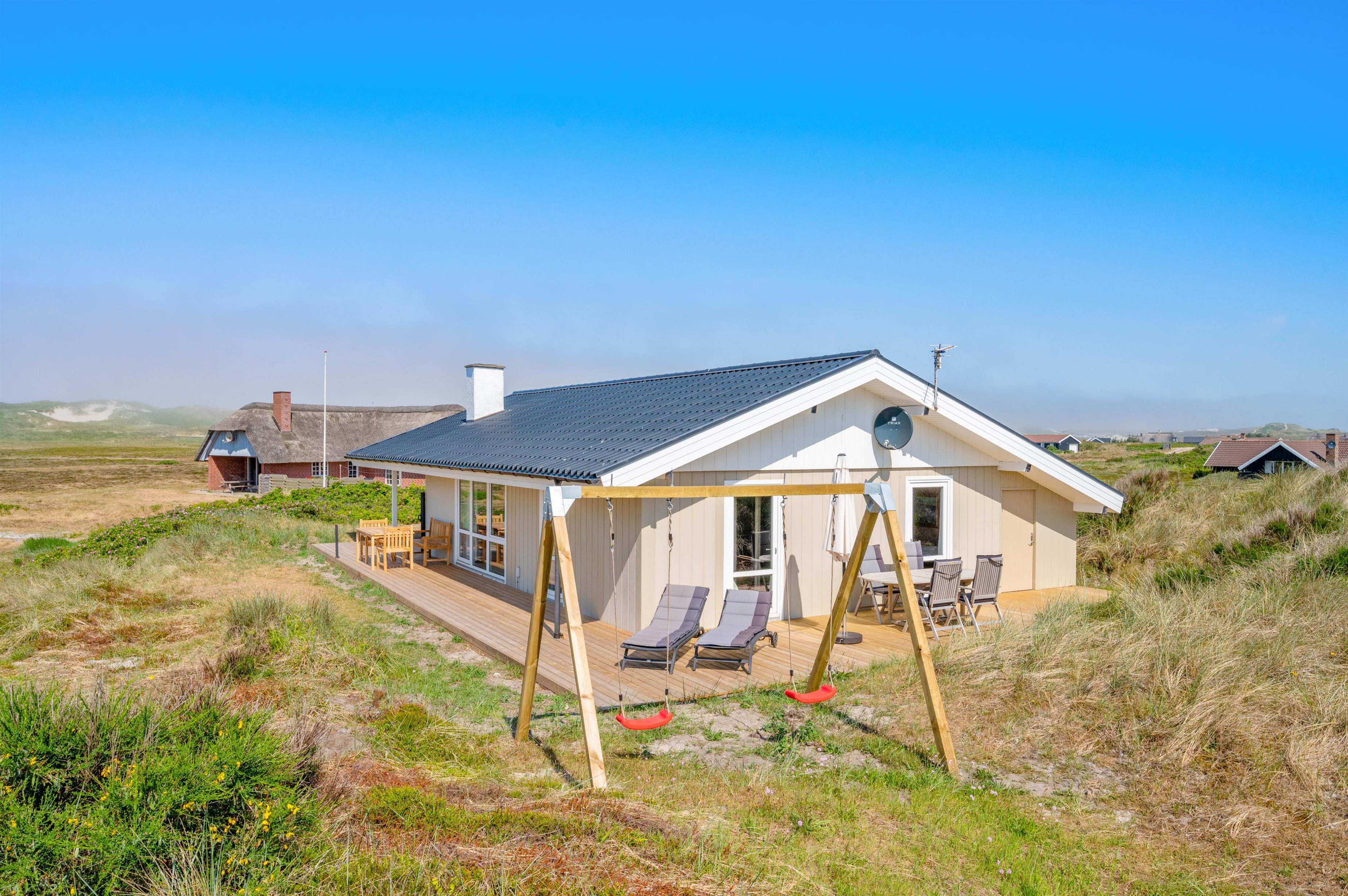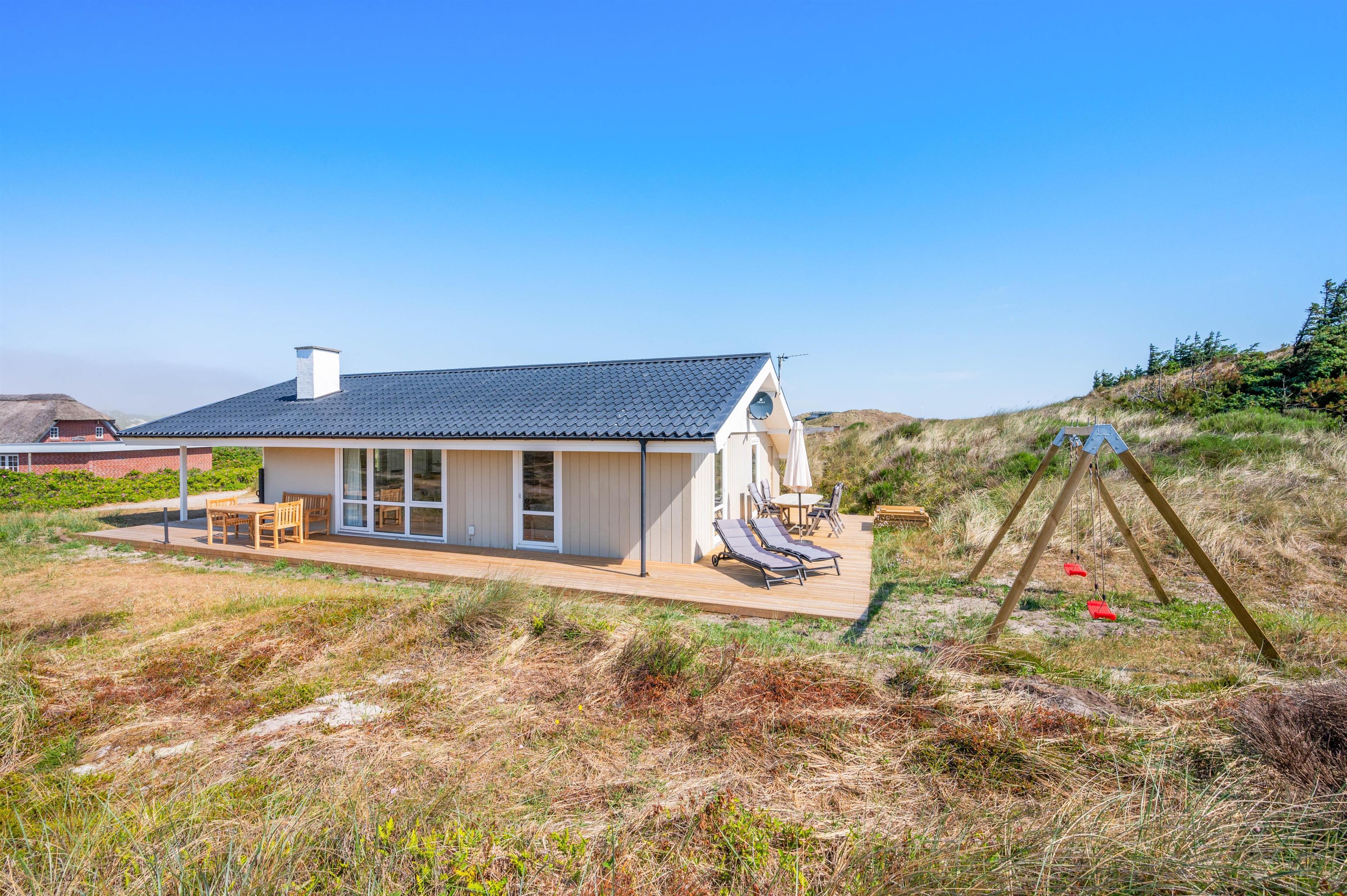 Der er 2 skønne terrasser til sommerhuset, som er forbundet med en sti omkring huset fra vest, langs sydsiden og om i øst. Den sydlige terrasse er delvist overdækket og delvis afskærmet. Udsigten er fremragende, og her kan I nyde en veltilberedt grillmiddag, mens I ser solen farve himlen orangerød over klitterne. Terrassen mod øst er vidunderlig om morgenen og indtil først på eftermiddagen. Herfra kan I også nyde børnenes leg på gyngen eller i sandkassen.