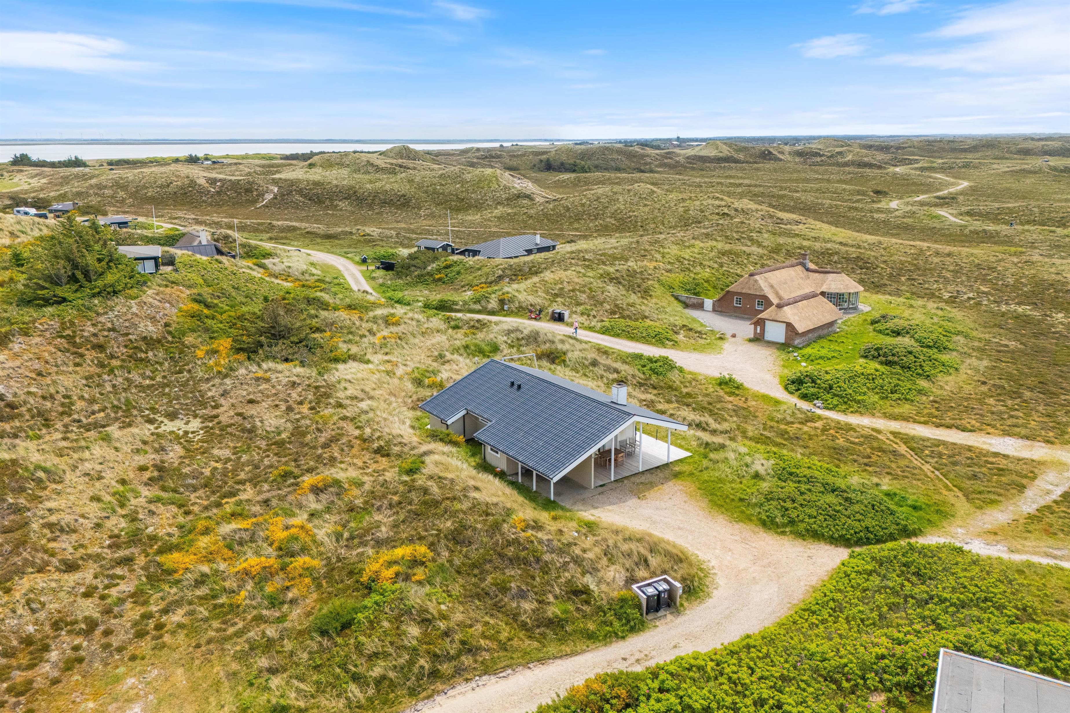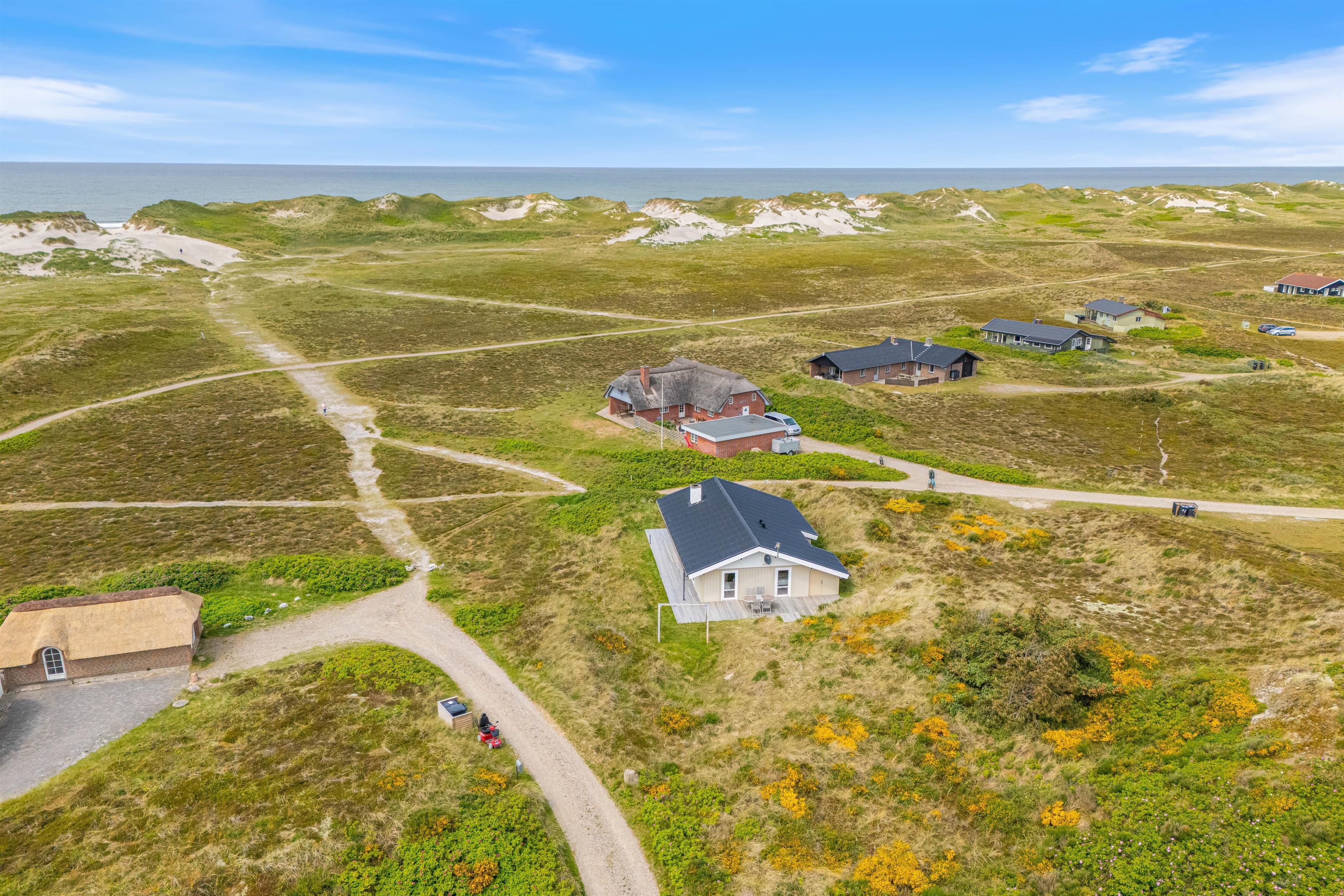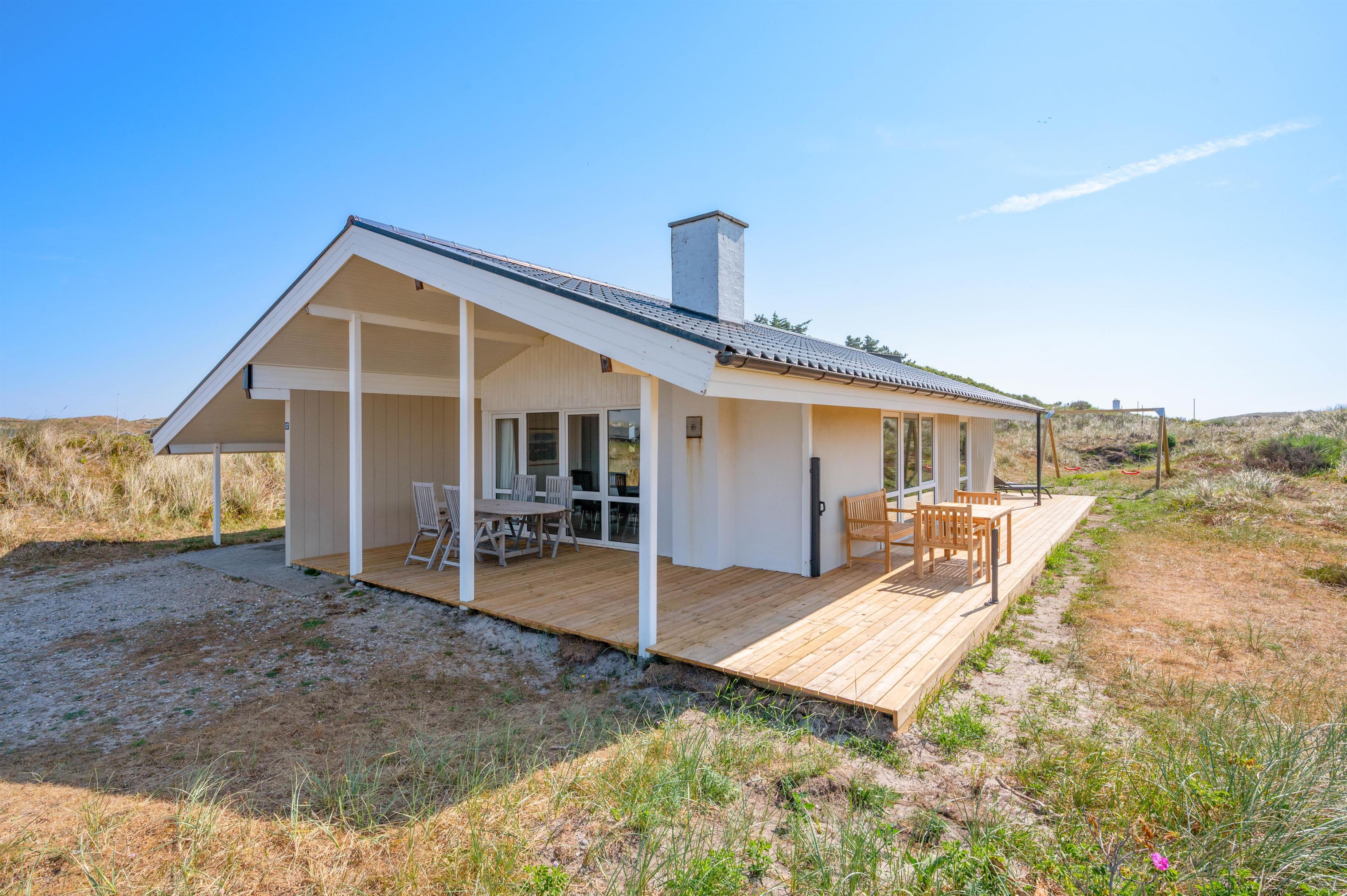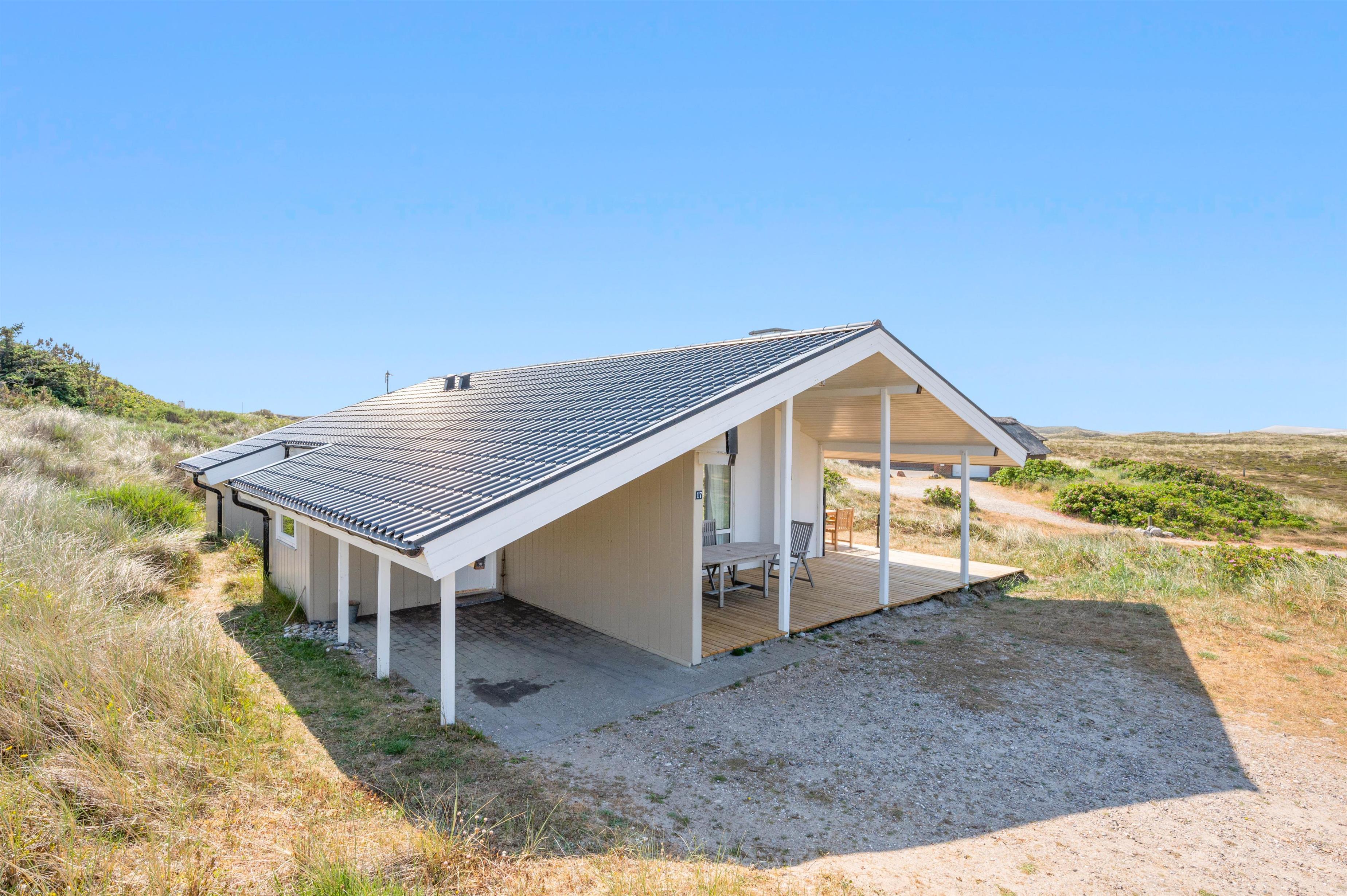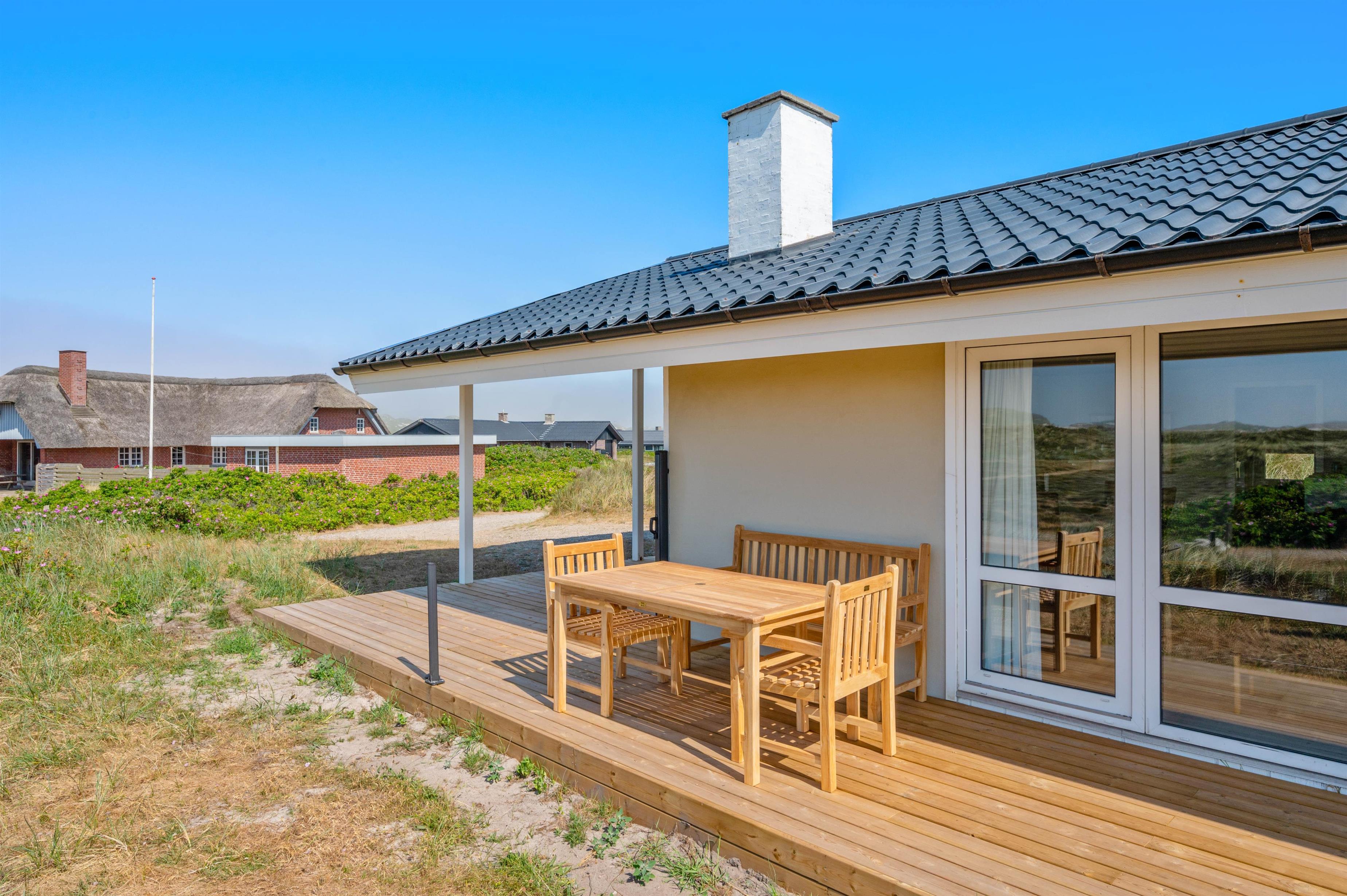 Der er 2 skønne terrasser til sommerhuset, som er forbundet med en sti omkring huset fra vest, langs sydsiden og om i øst. Den sydlige terrasse er delvist overdækket og delvis afskærmet. Udsigten er fremragende, og her kan I nyde en veltilberedt grillmiddag, mens I ser solen farve himlen orangerød over klitterne. Terrassen mod øst er vidunderlig om morgenen og indtil først på eftermiddagen. Herfra kan I også nyde børnenes leg på gyngen eller i sandkassen.