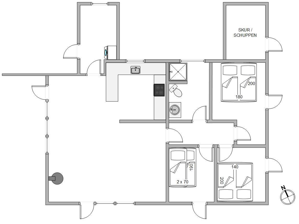 Der er plads til 6 personer og 1 hund i sommerhuset, fordelt på 3 soveværelser, som alle har udgang til terrasse. 2 af værelserne har dobbeltsenge, og det sidste har køjesenge.