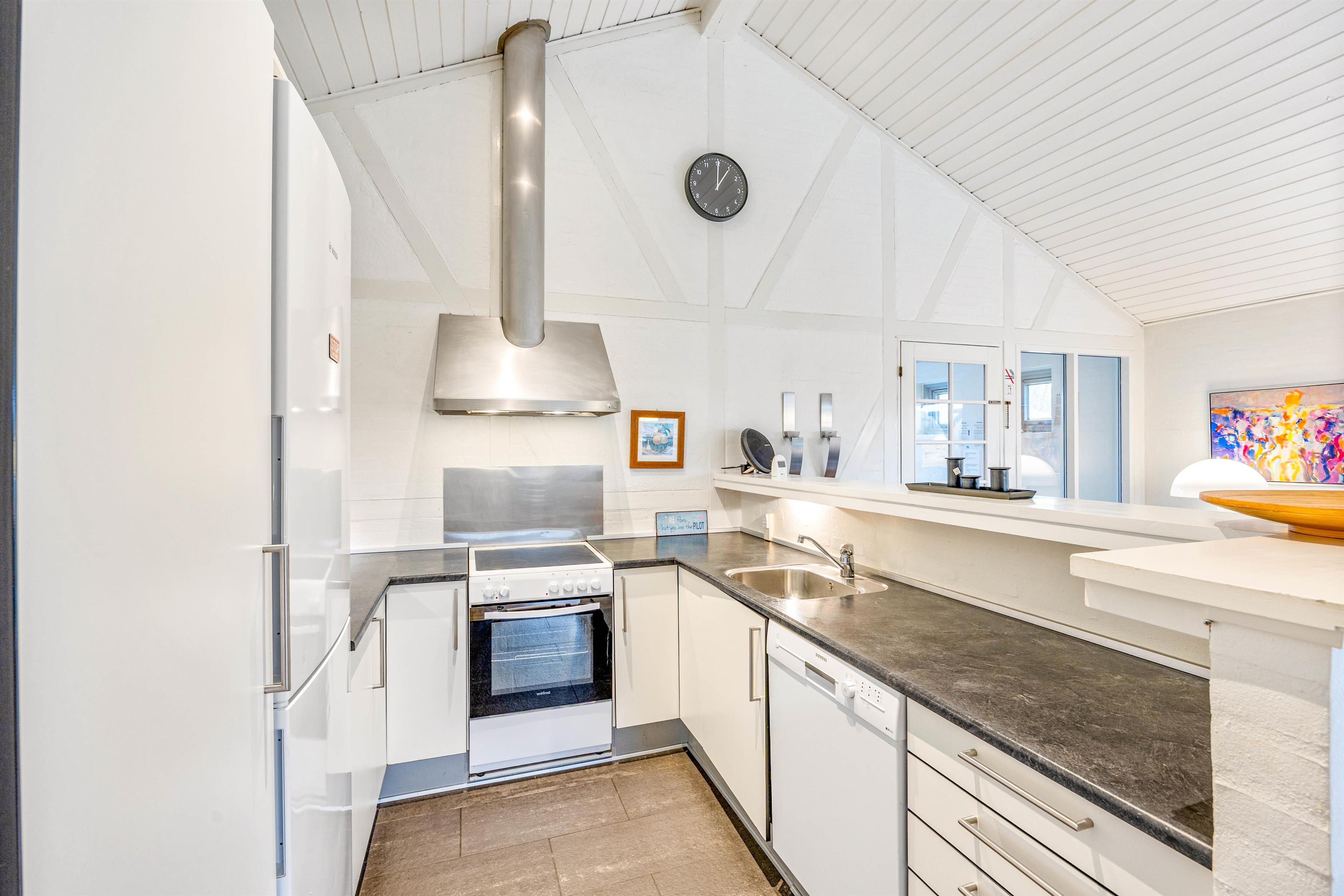 Når I træder ind ad døren til sommerhuset, vil I straks fornemme den lyse og indbydende stemning, der kendetegner husets indretning. Det velholdte og flotte sommerhus er indrettet med lyse vægge og lofter. I det store køkkenalrum, som er husets hjerte, går loftet flot til kip, hvilket skaber et stort rum med masser af plads og lys. De store vinduer giver et flot lysindfald ved spisepladsen, som er centralt placeret i rummet. Døren til terrassen kan åbnes, så ude- og inderum smelter sammen i forårs- og sommermåneder.