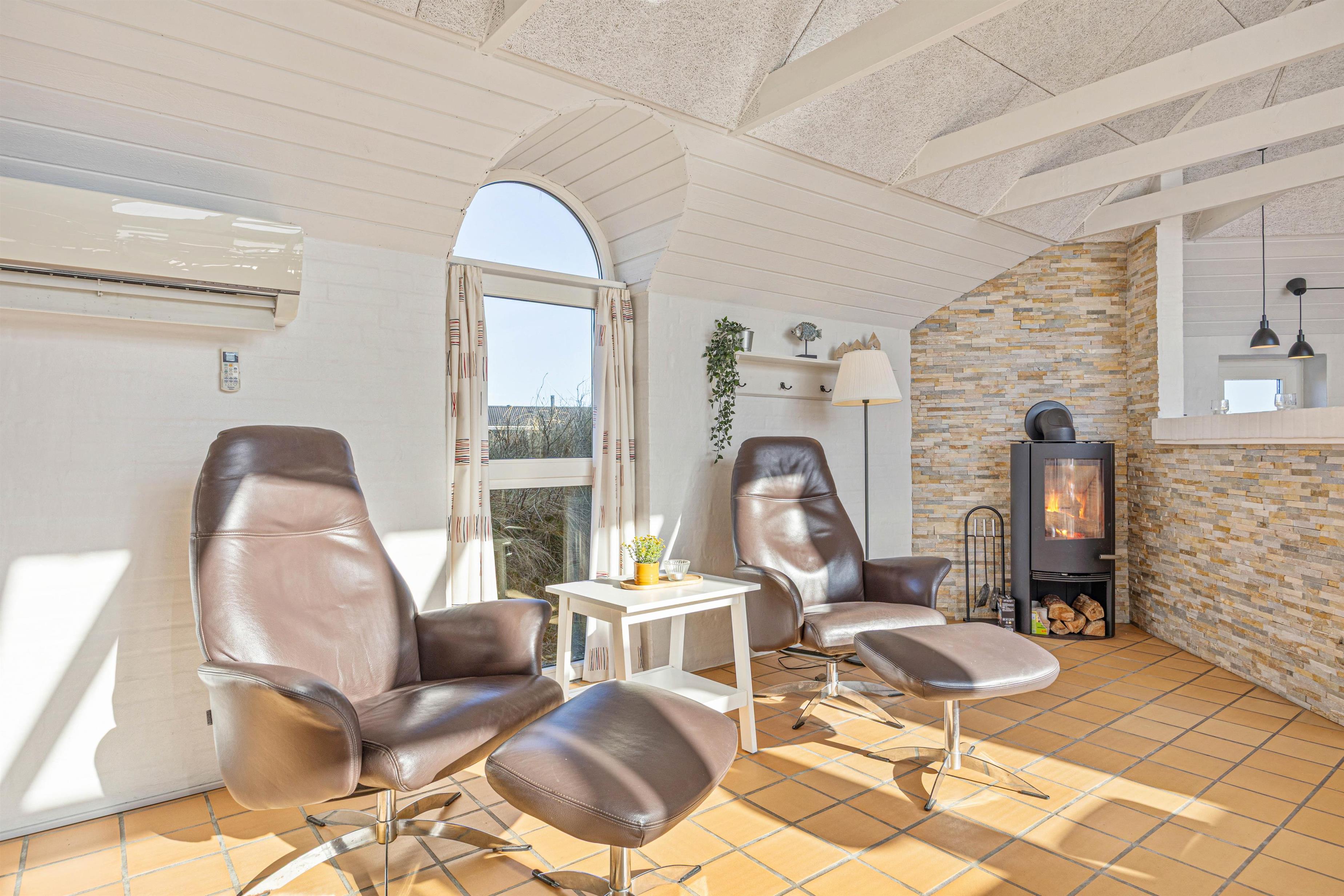Flot indretning og hyggelig stue med gulvvarme, brændeovn og varmepumpe