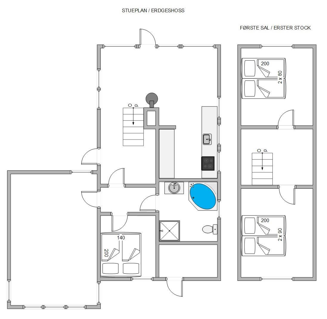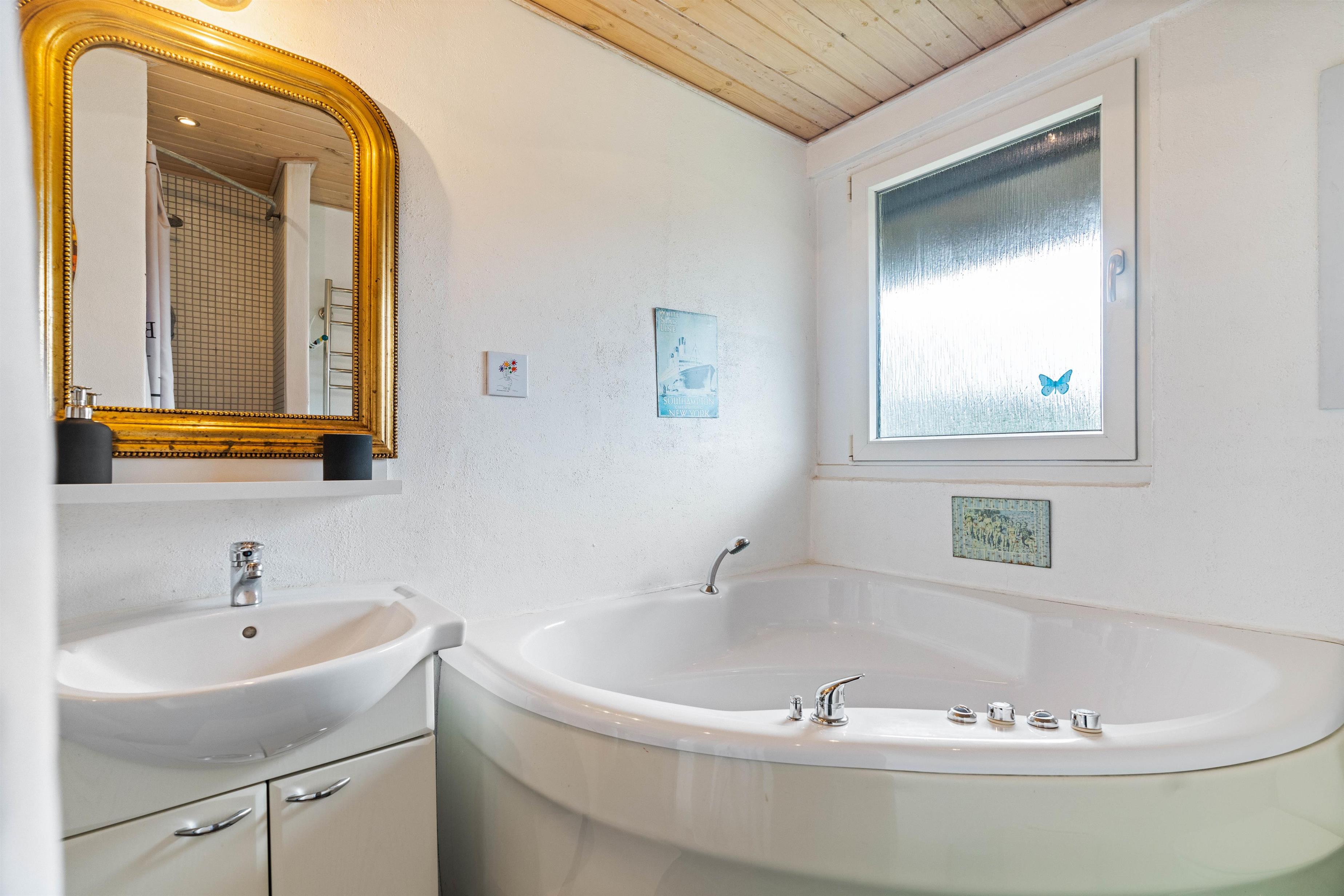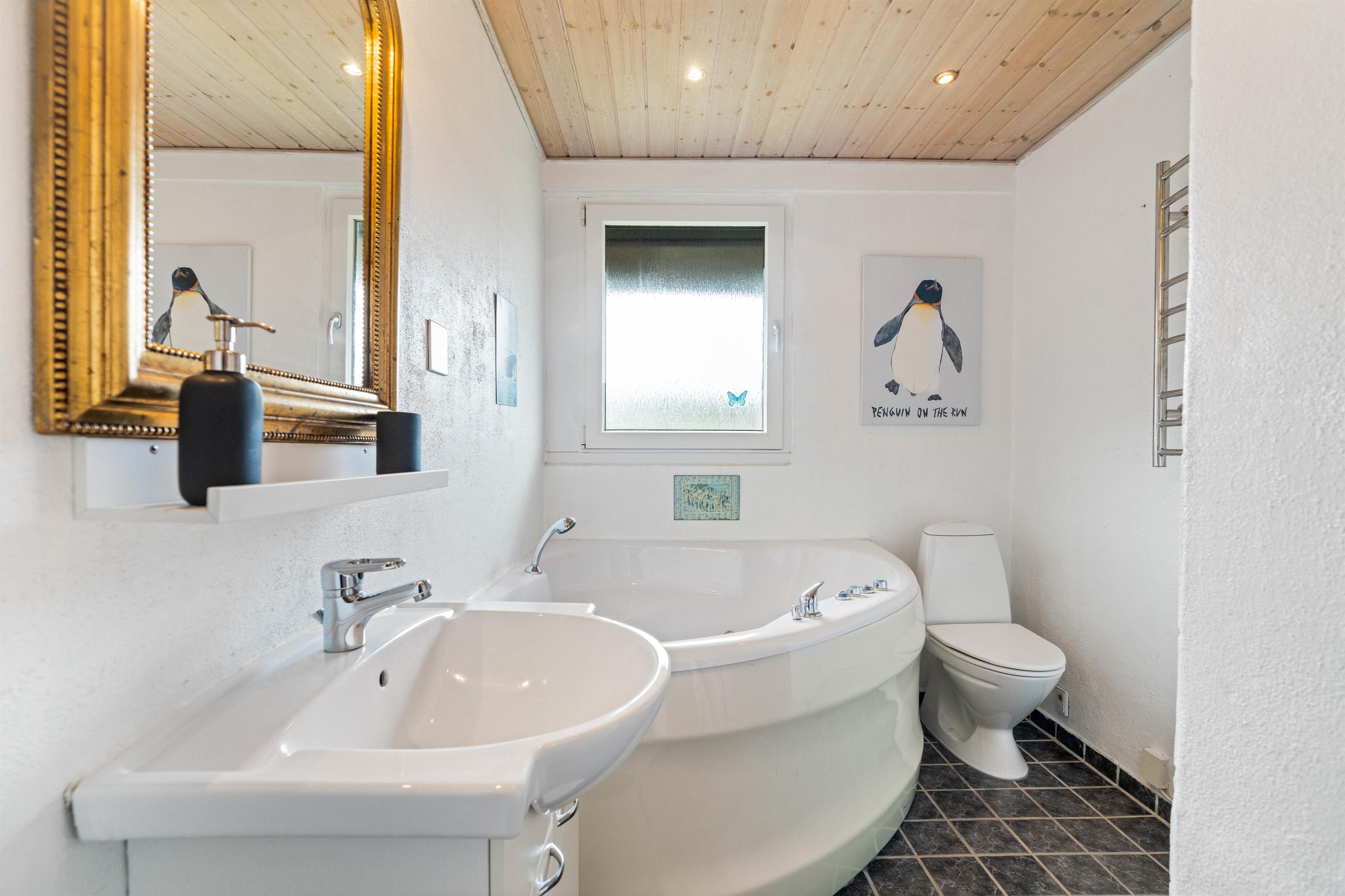 På badeværelset står hjørnespaen og indbyder til et par timers ren afslapning, hvor I kan geare helt ned og blive varmet godt igennem. Og har I børn med, vil de sikkert også elske at få lov til at plaske lidt rundt heri.