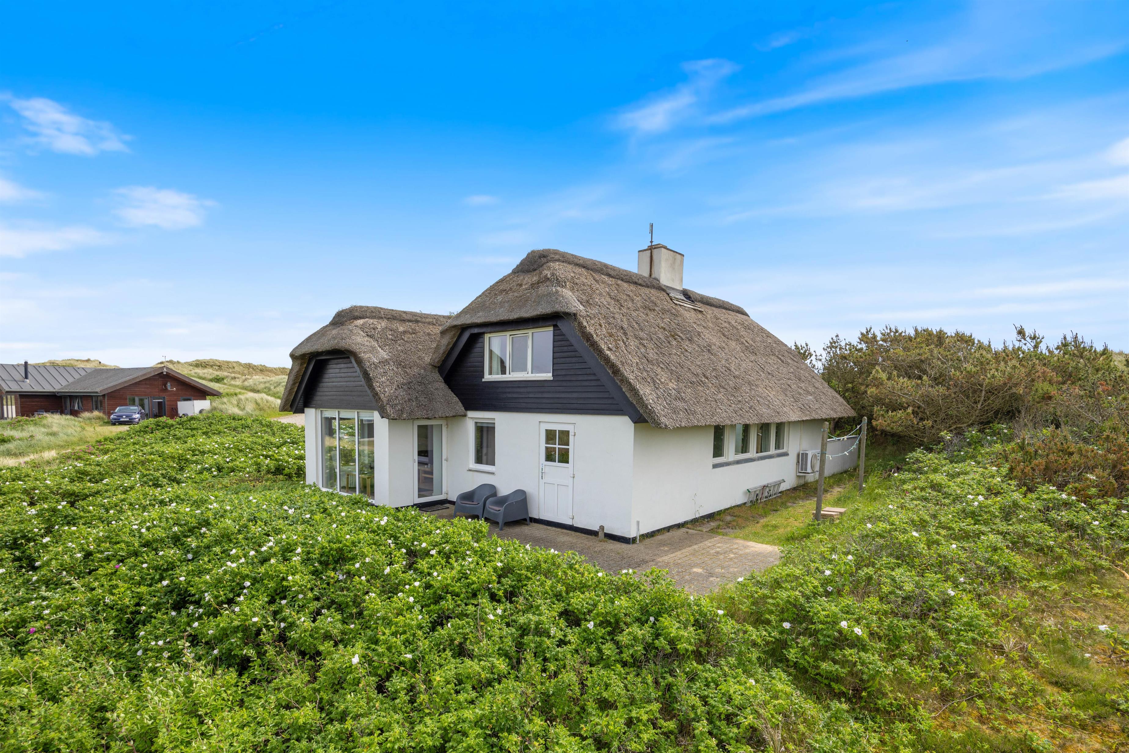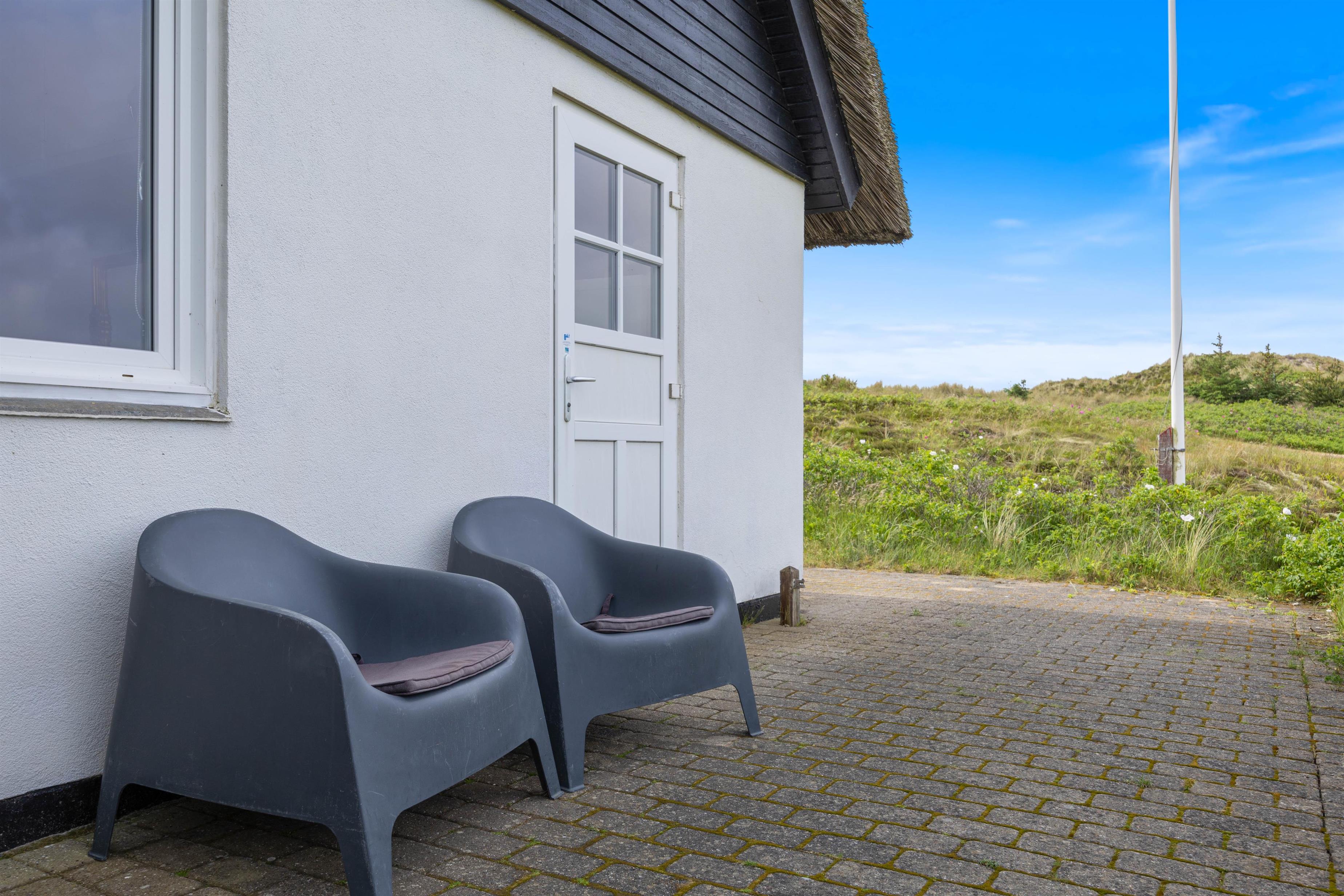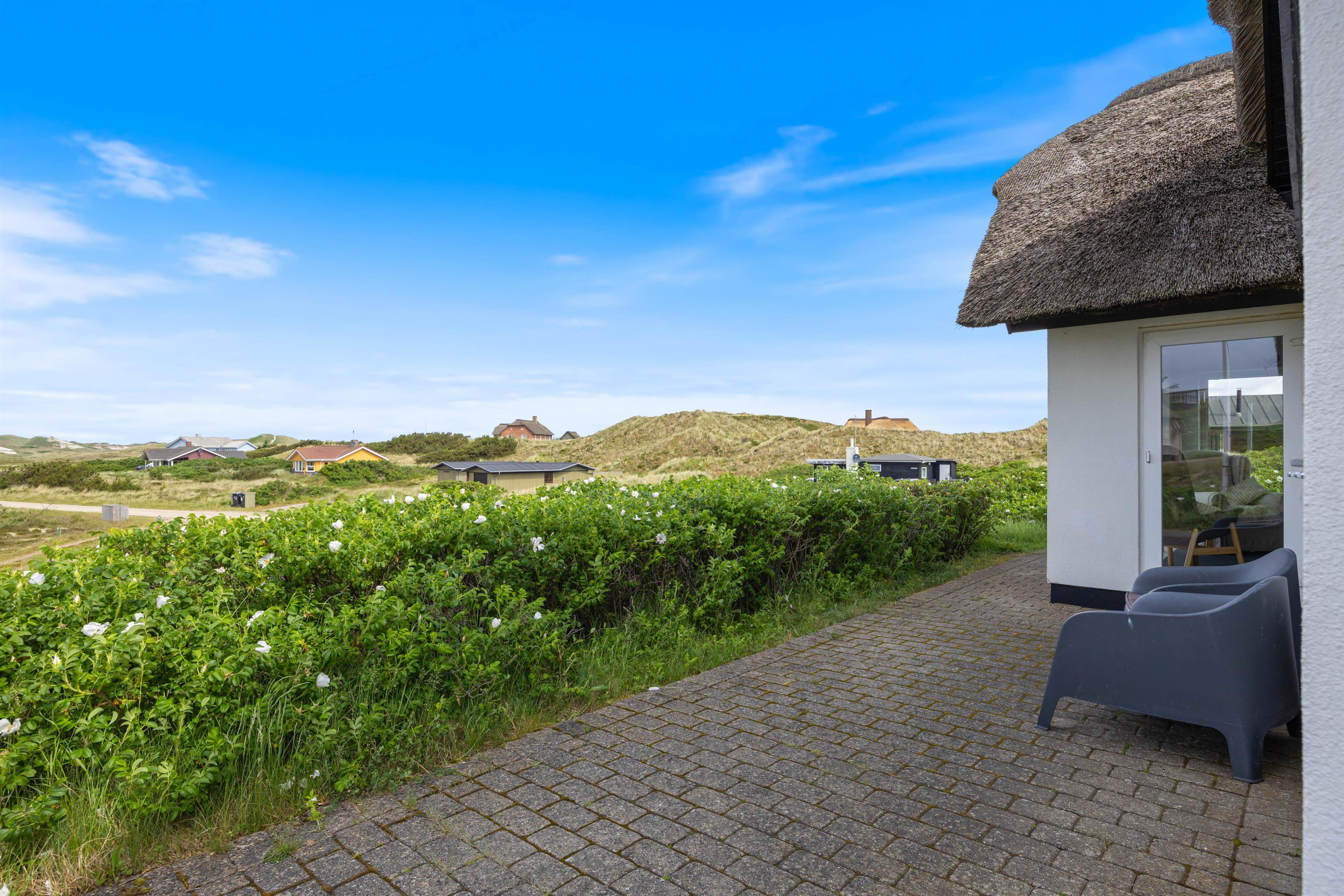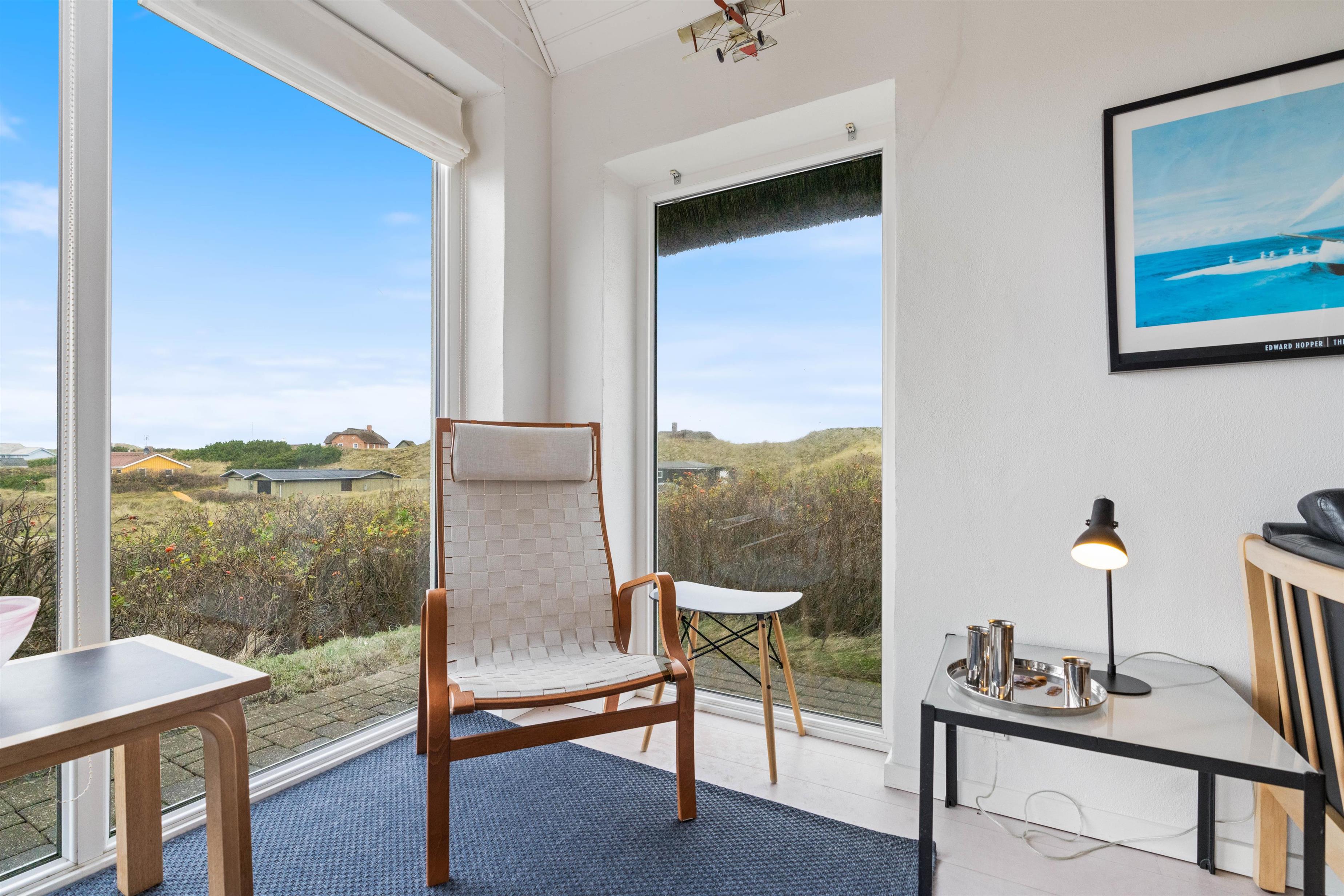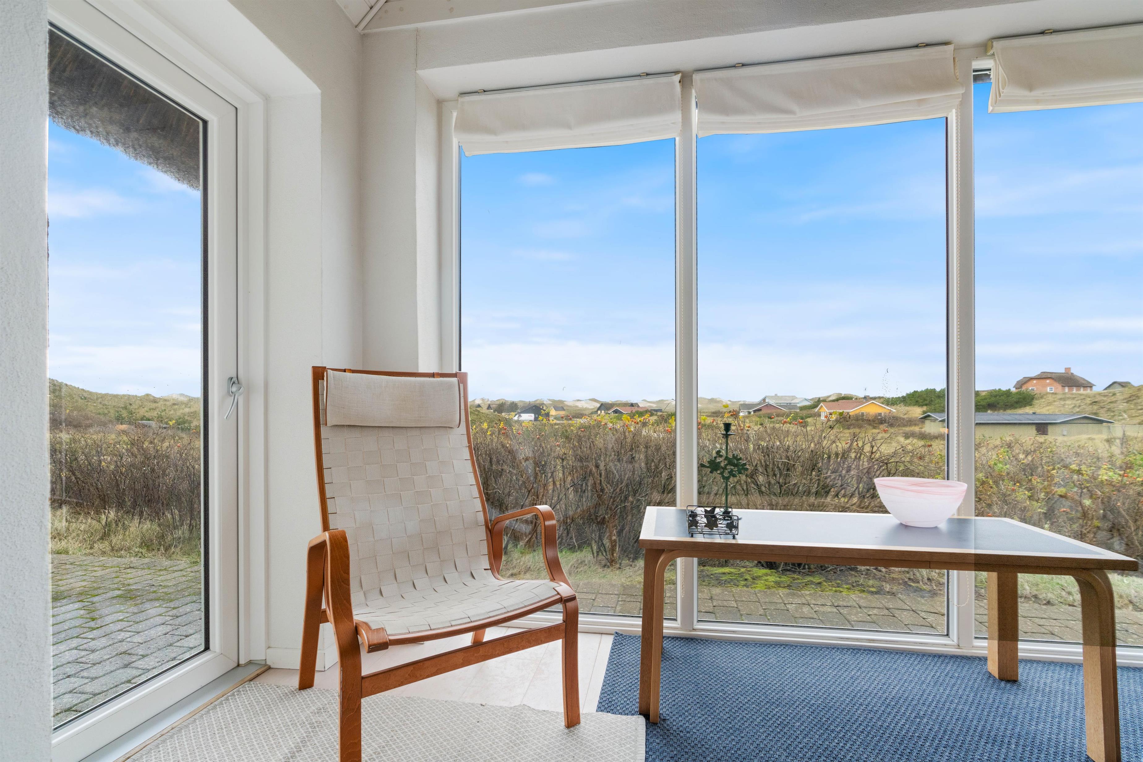 Feriehus med dejlig indretning og udsigt til smukke naturomgivelser. Omkring sommerhuset findes flere gode terrasser, så I kan nyde den smukke udsigt, den friske salte havluft, og hyggelige grillaftener. Og området med klitterne, stranden og Vesterhavet indbyder til gåture og udflugter. Det er ikke tilladt at have kat med i sommerhuset, men jeres 2 hunde er meget velkomne.