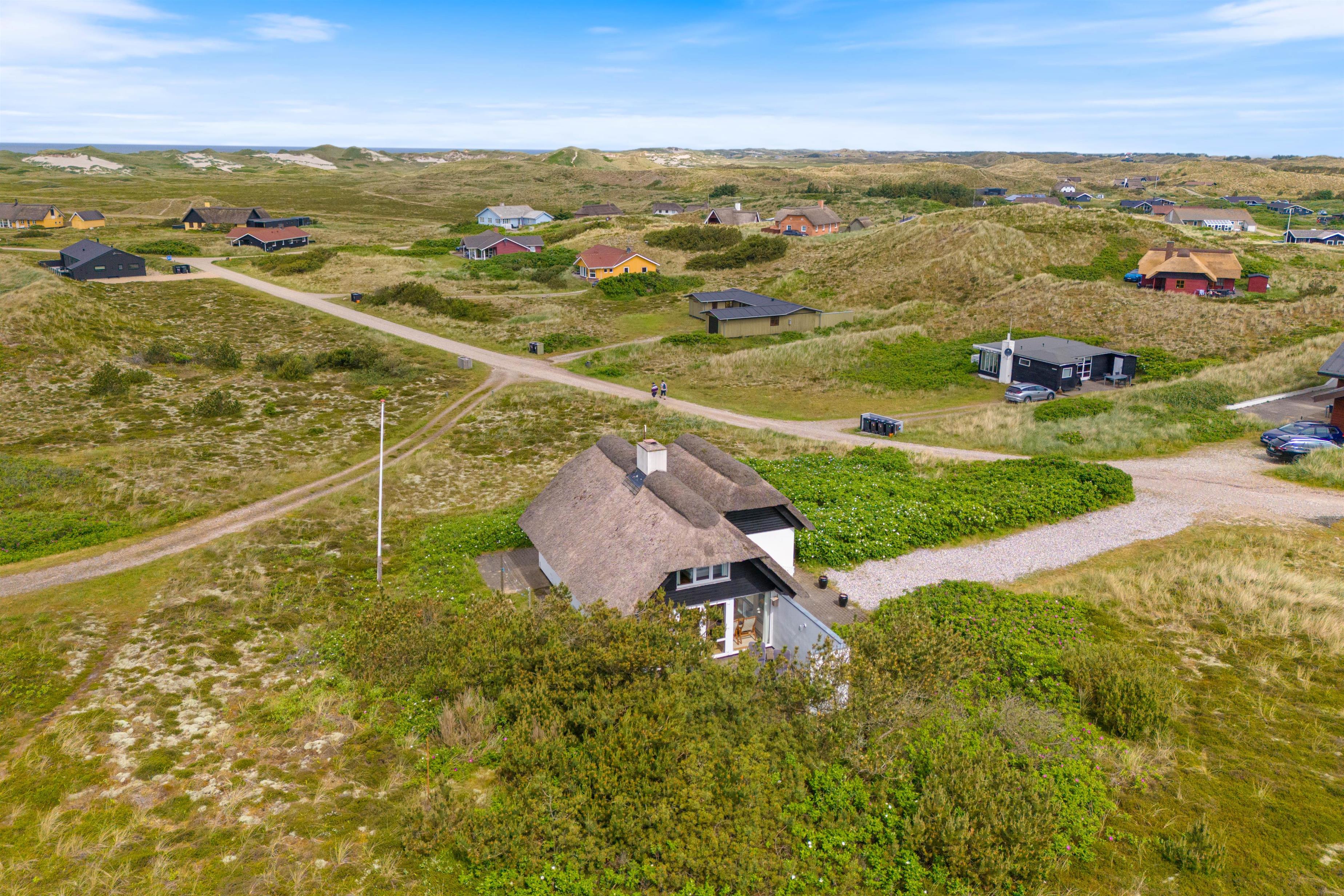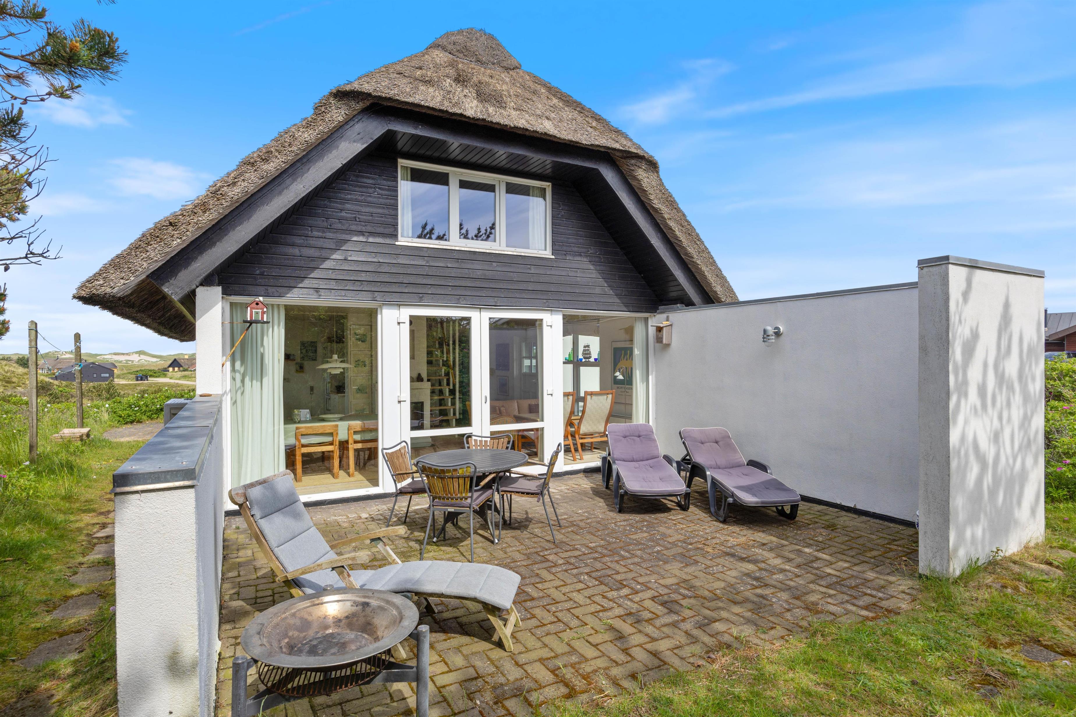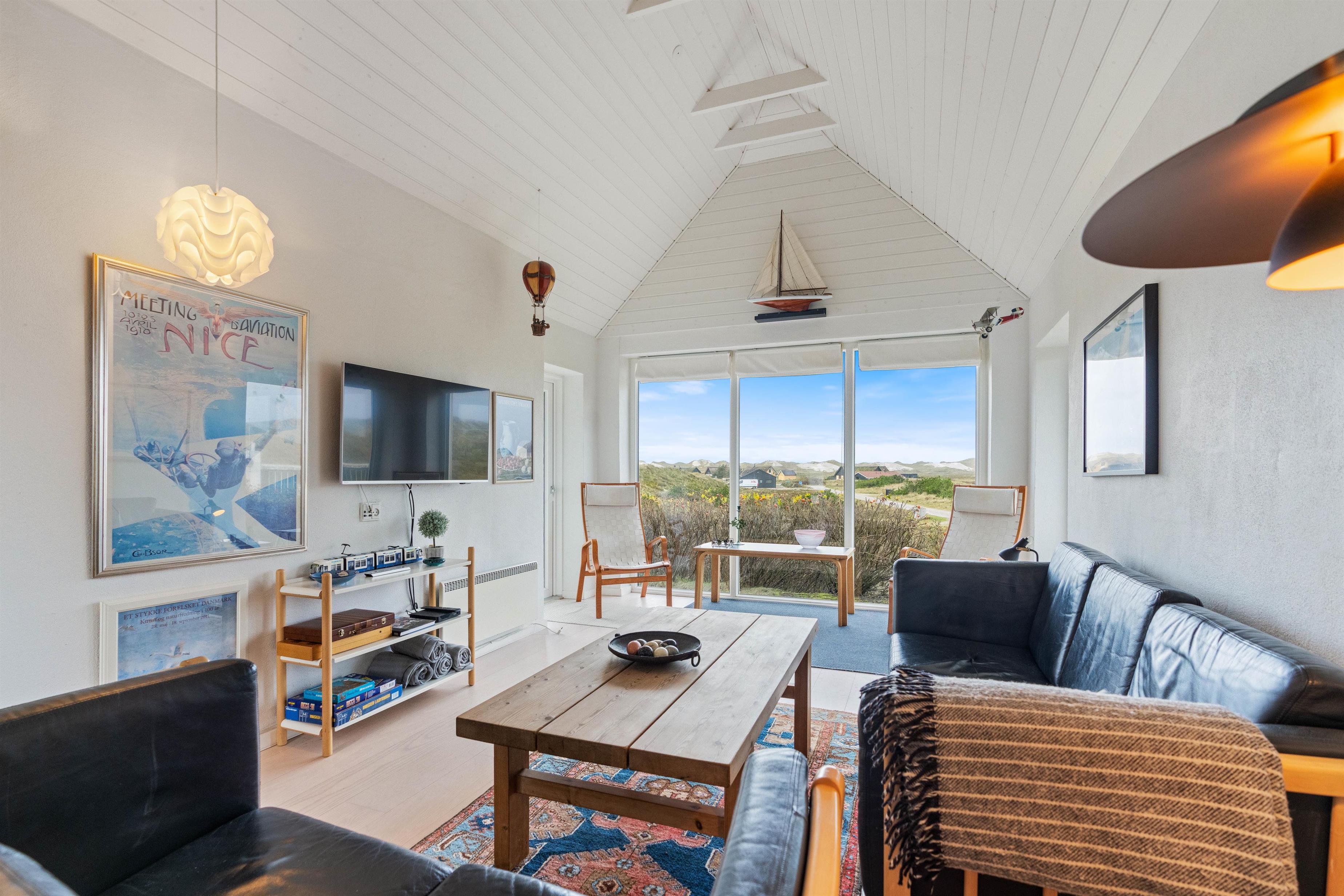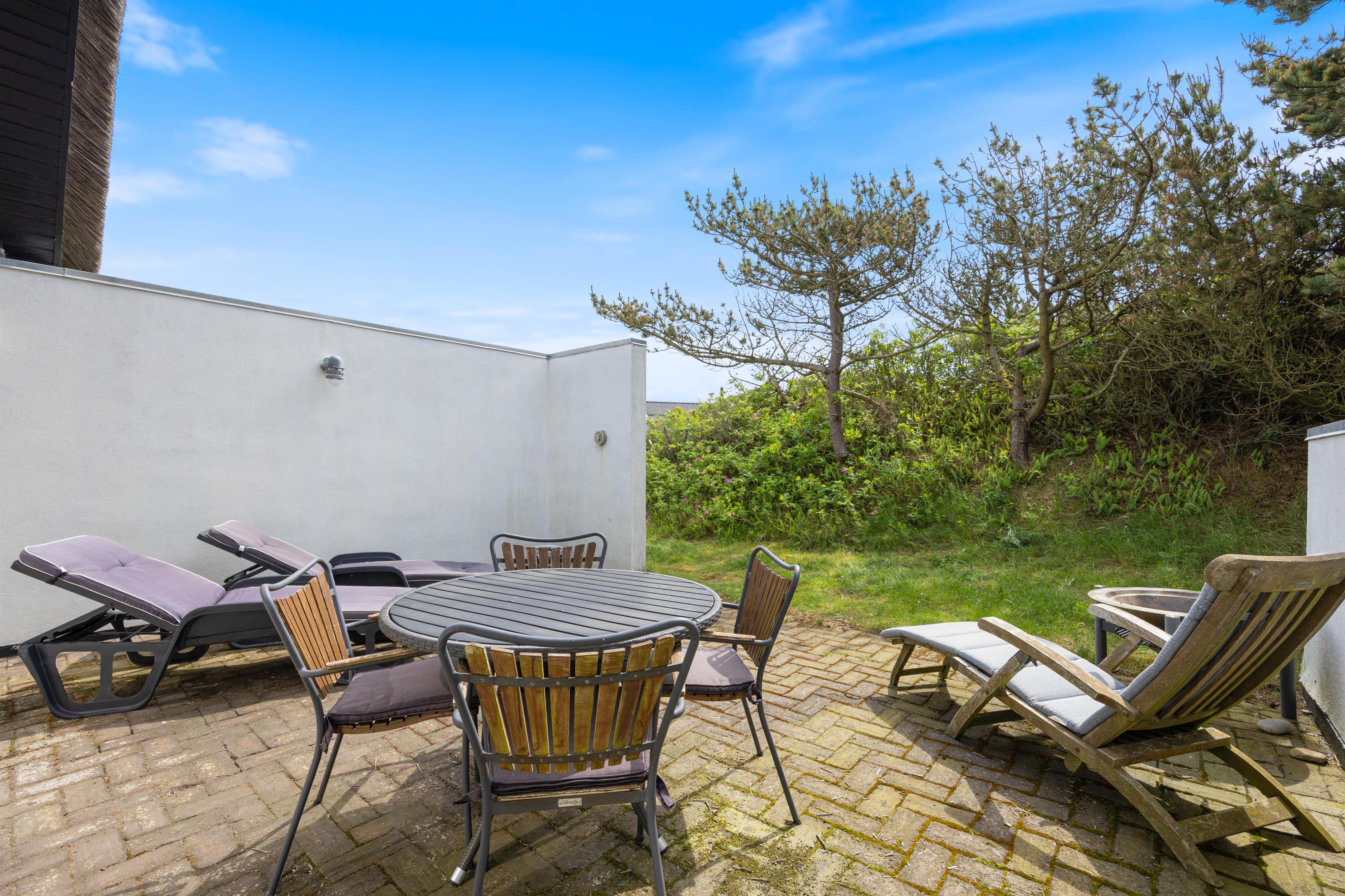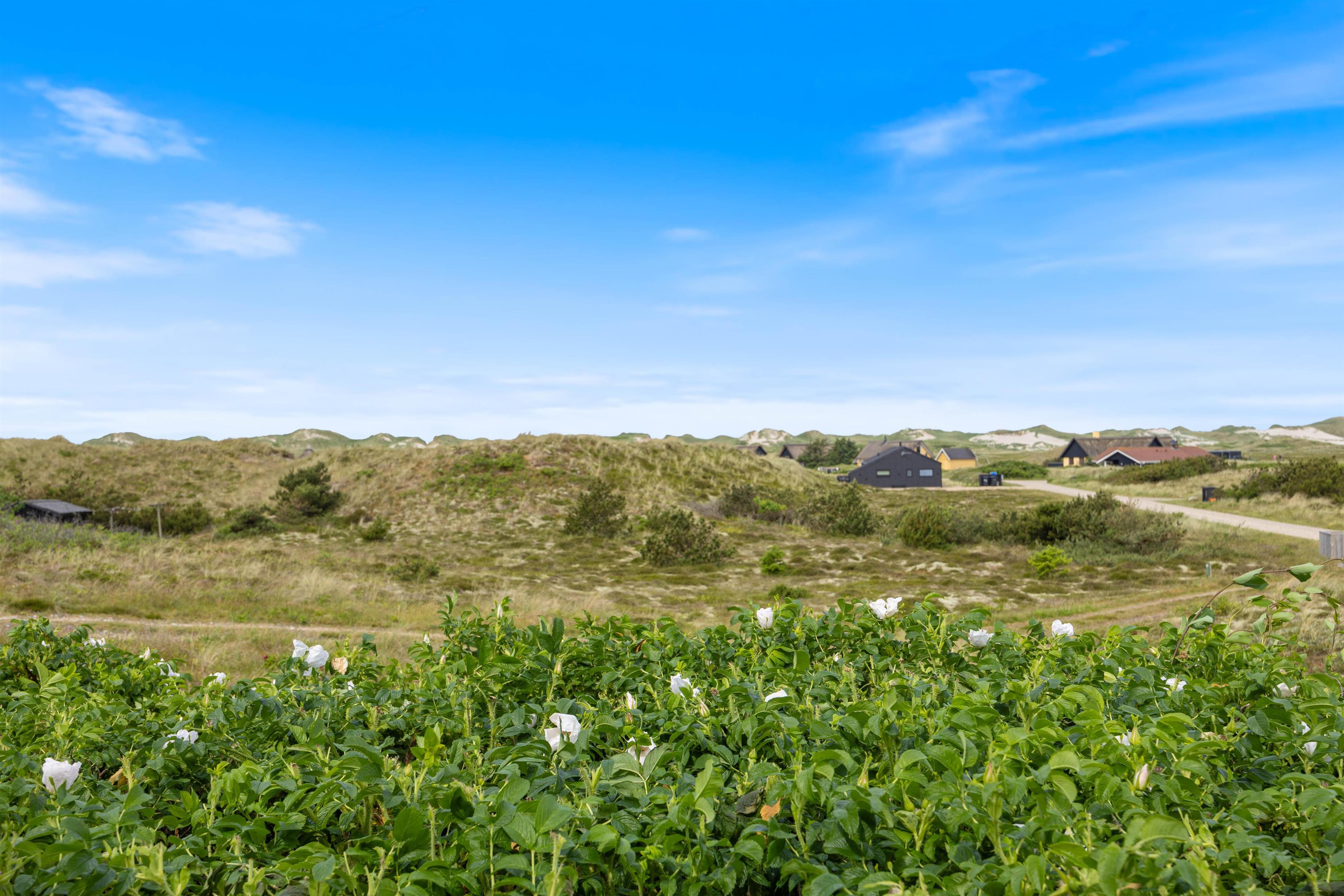 Feriehus med dejlig indretning og udsigt til smukke naturomgivelser. Omkring sommerhuset findes flere gode terrasser, så I kan nyde den smukke udsigt, den friske salte havluft, og hyggelige grillaftener. Og området med klitterne, stranden og Vesterhavet indbyder til gåture og udflugter. Det er ikke tilladt at have kat med i sommerhuset, men jeres 2 hunde er meget velkomne.