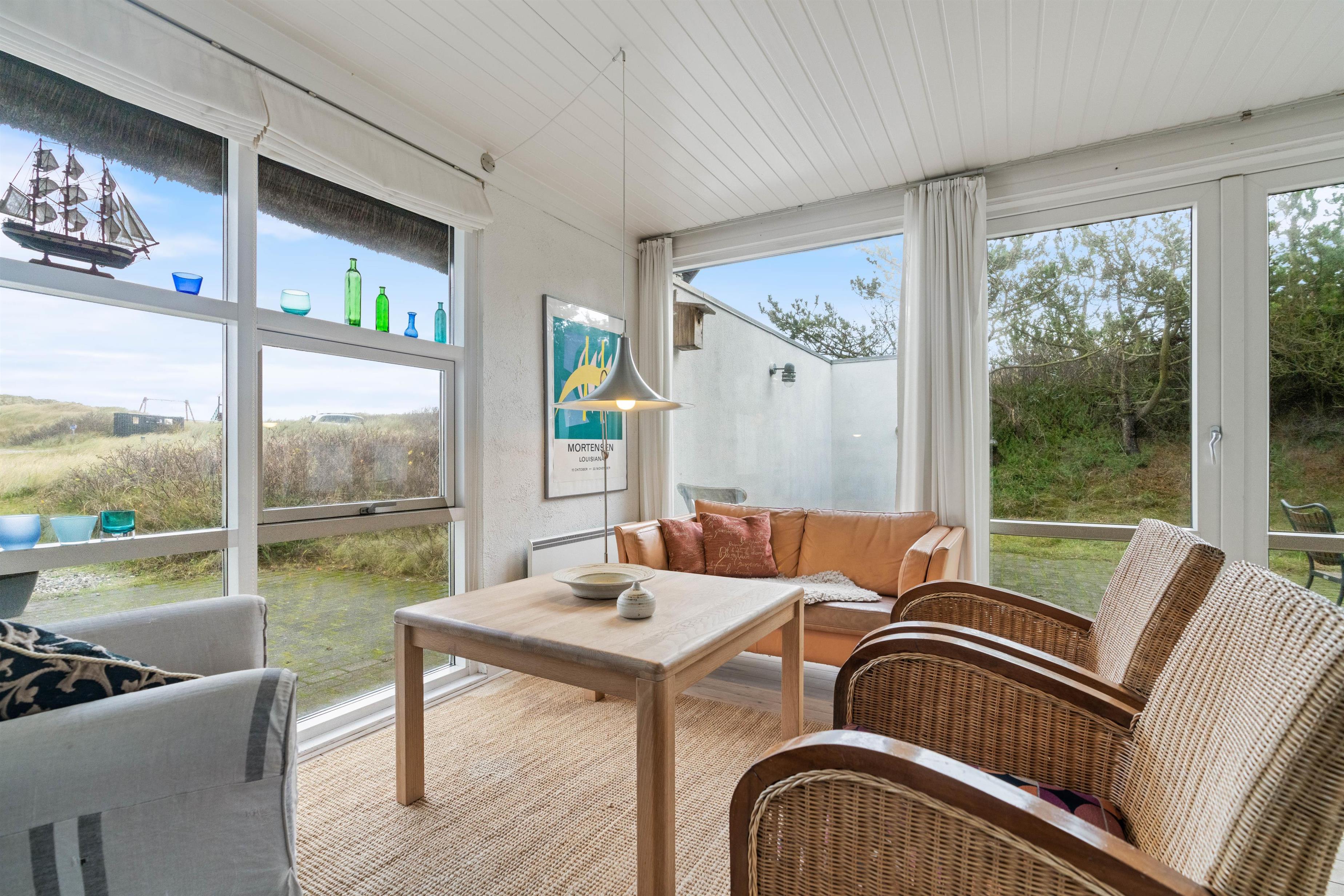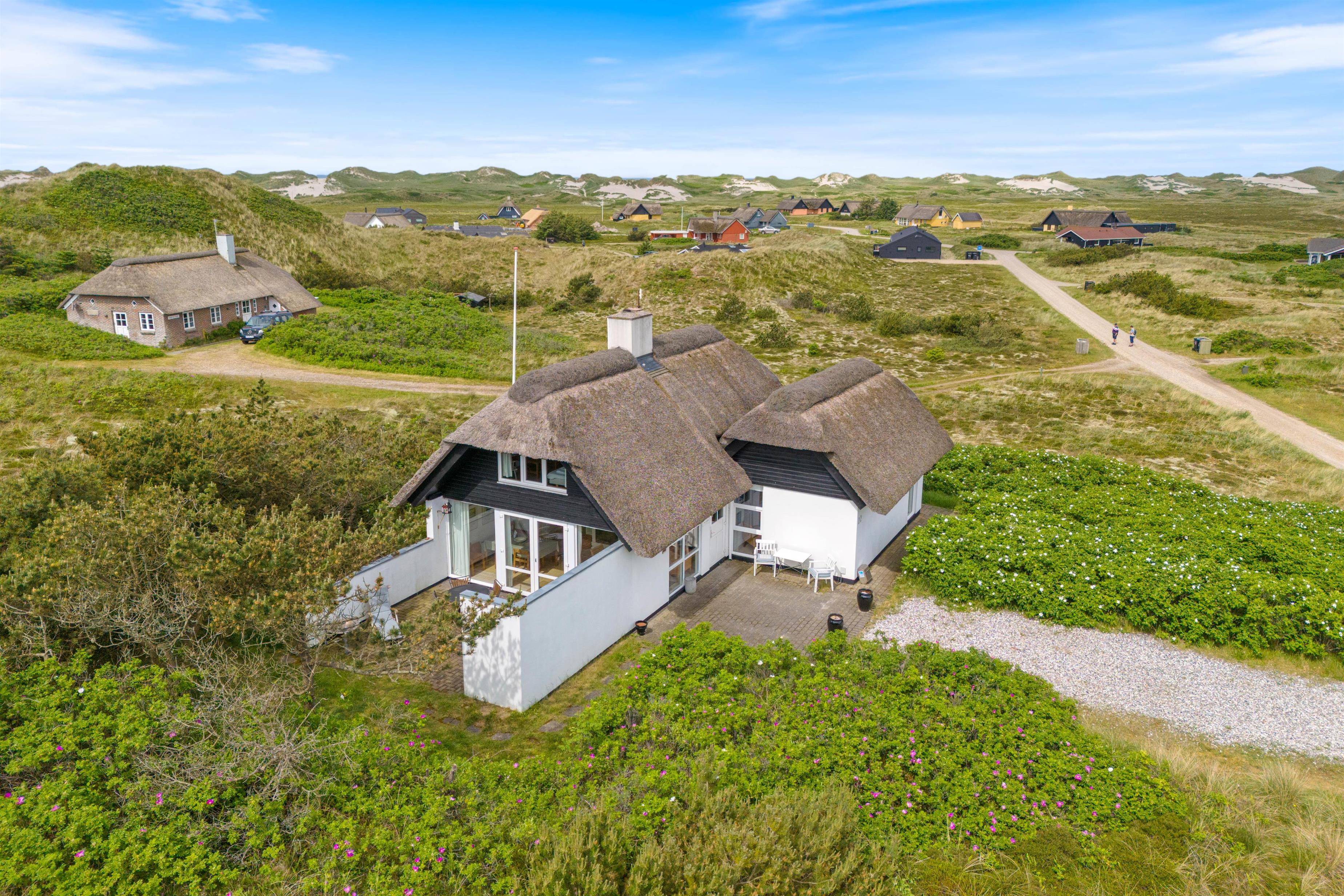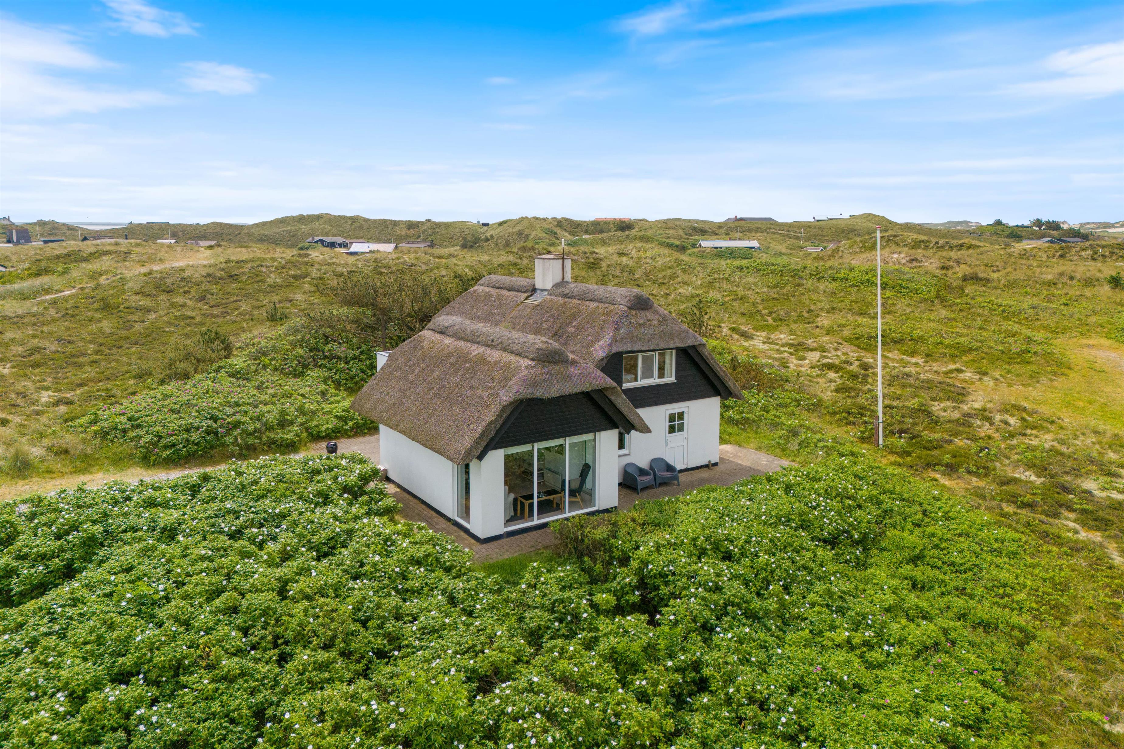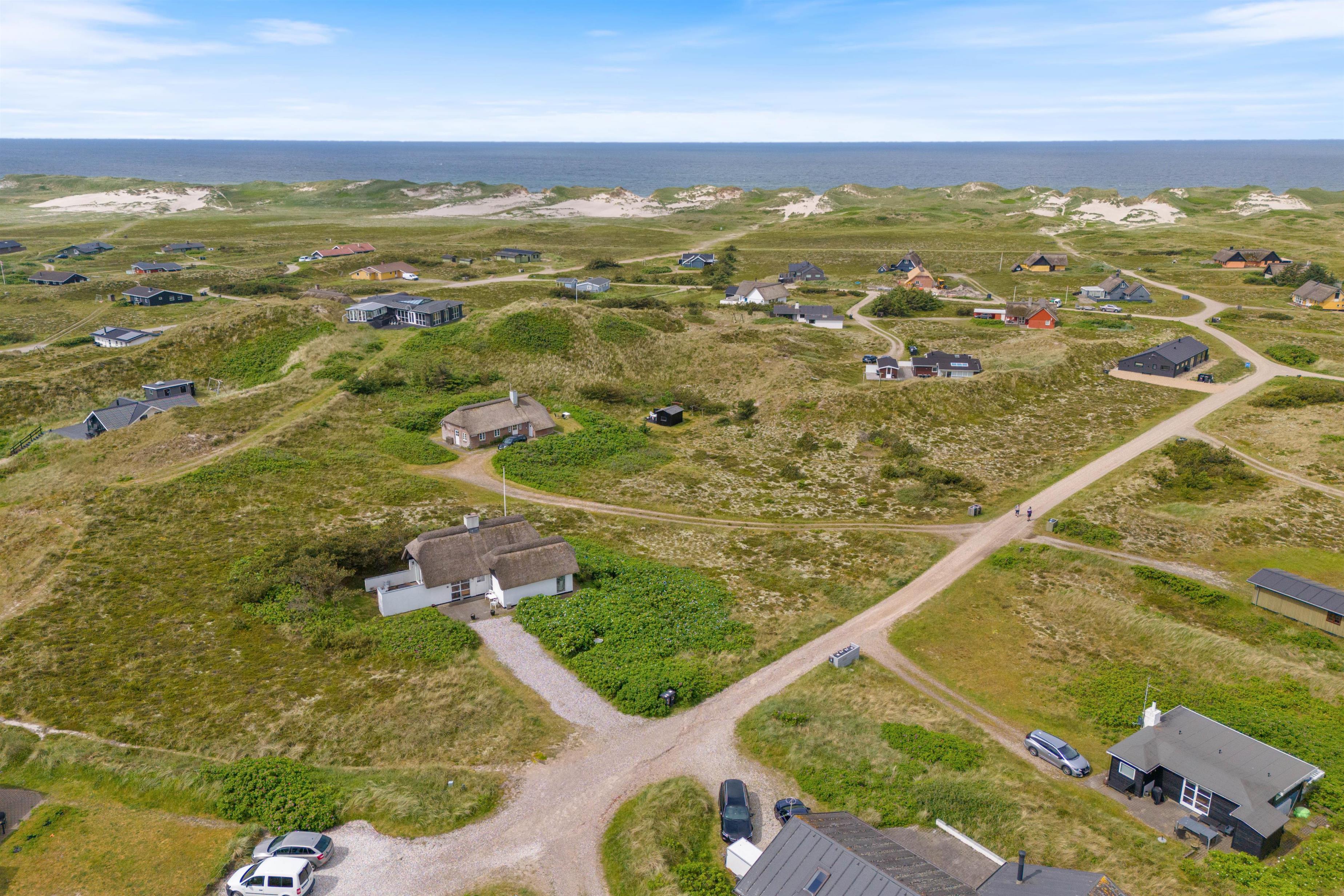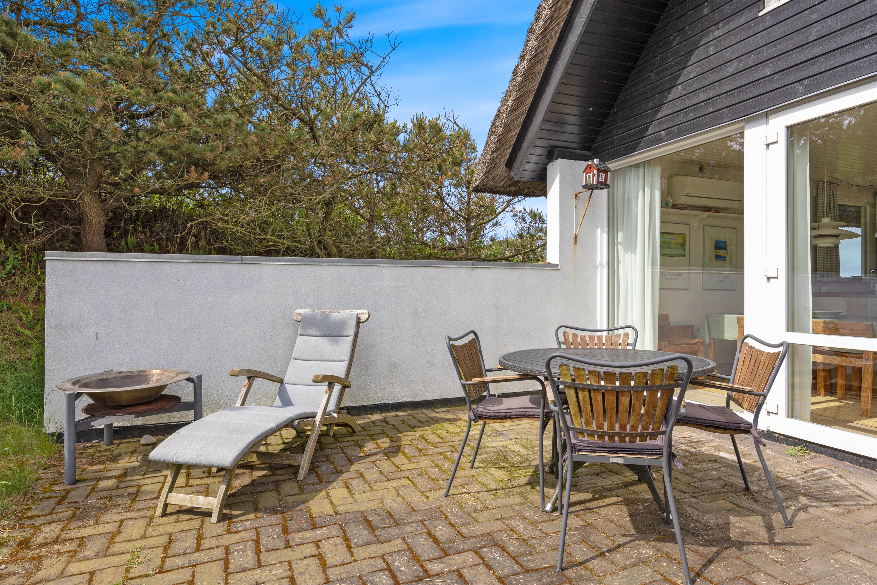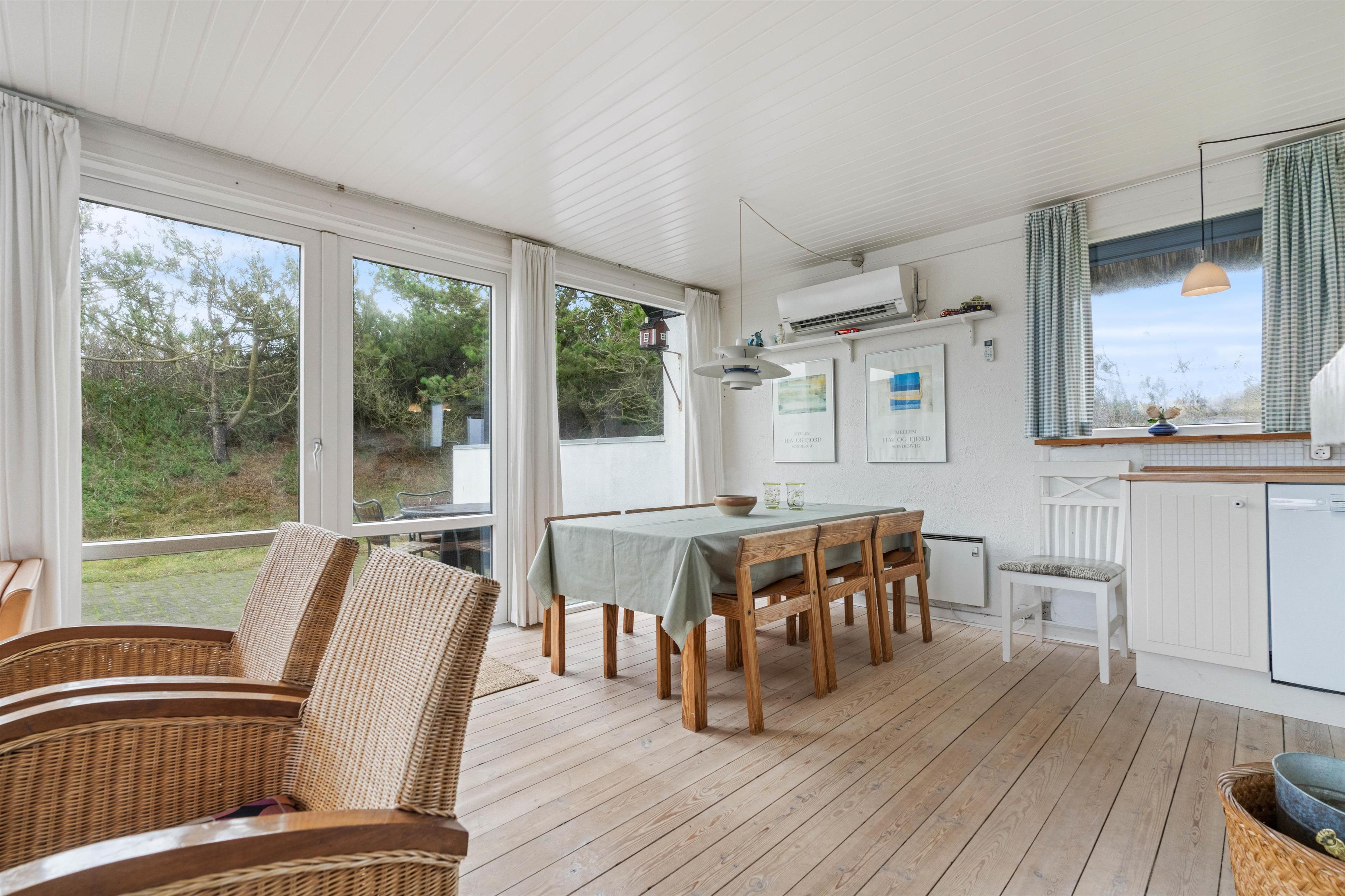 Feriehus med dejlig indretning og udsigt til smukke naturomgivelser. Omkring sommerhuset findes flere gode terrasser, så I kan nyde den smukke udsigt, den friske salte havluft, og hyggelige grillaftener. Og området med klitterne, stranden og Vesterhavet indbyder til gåture og udflugter. Det er ikke tilladt at have kat med i sommerhuset, men jeres 2 hunde er meget velkomne.
