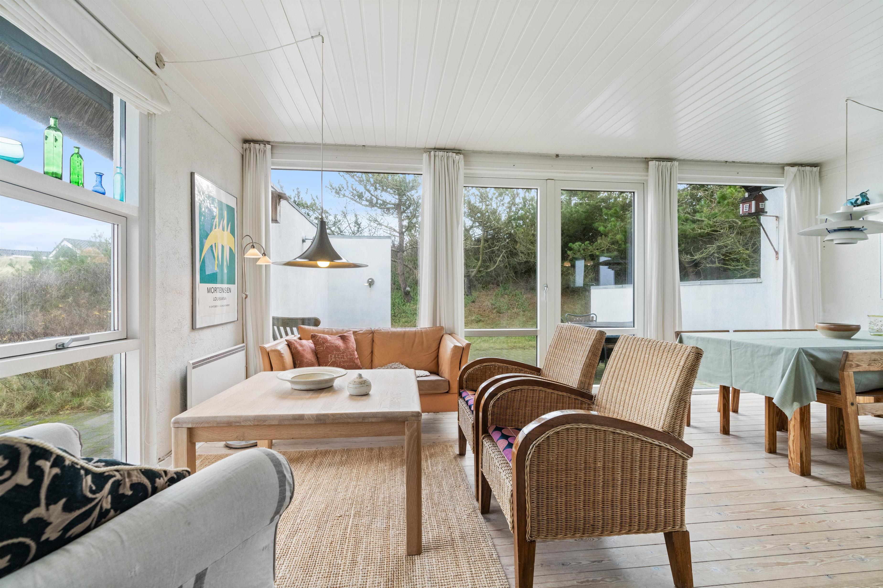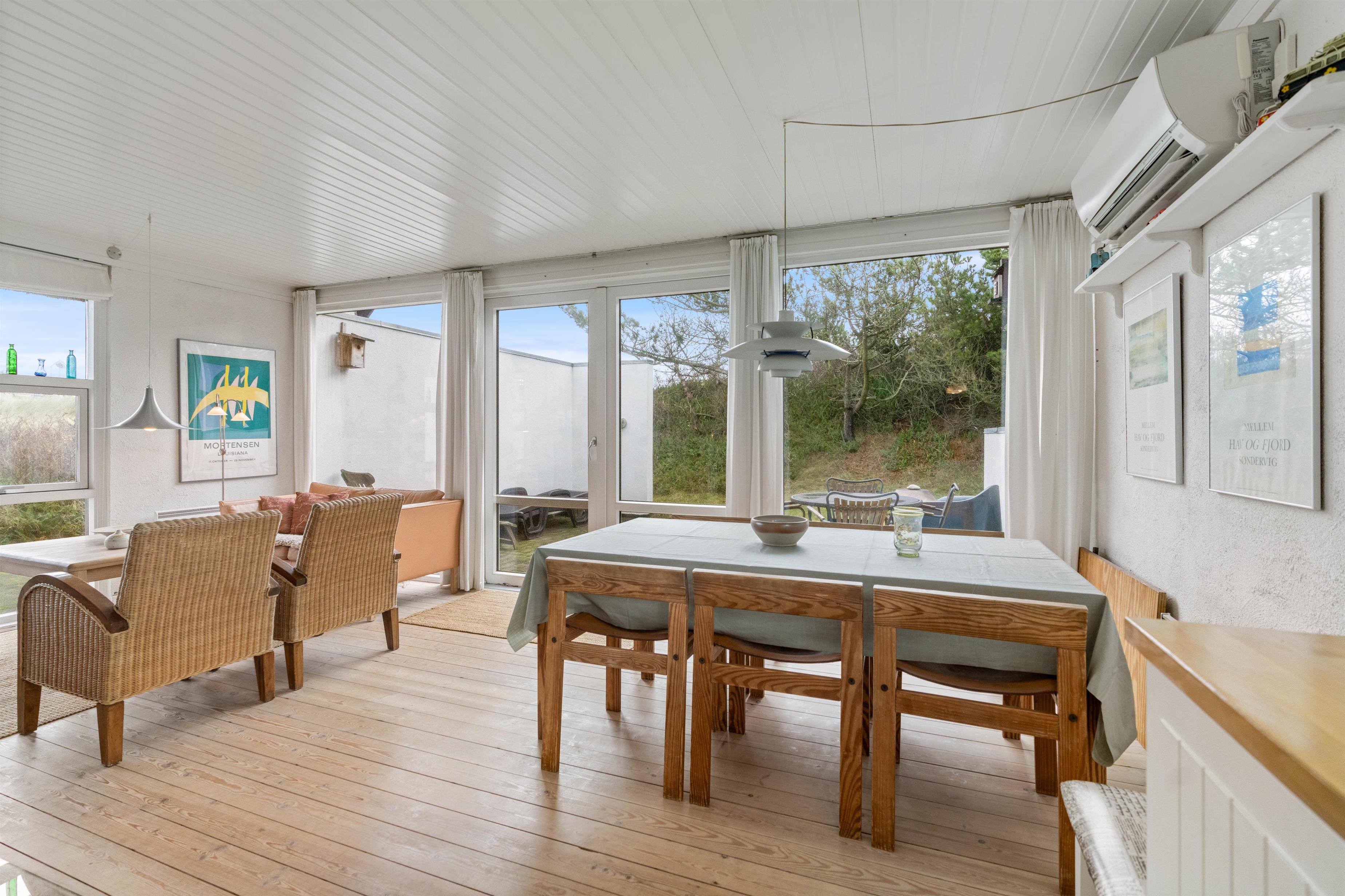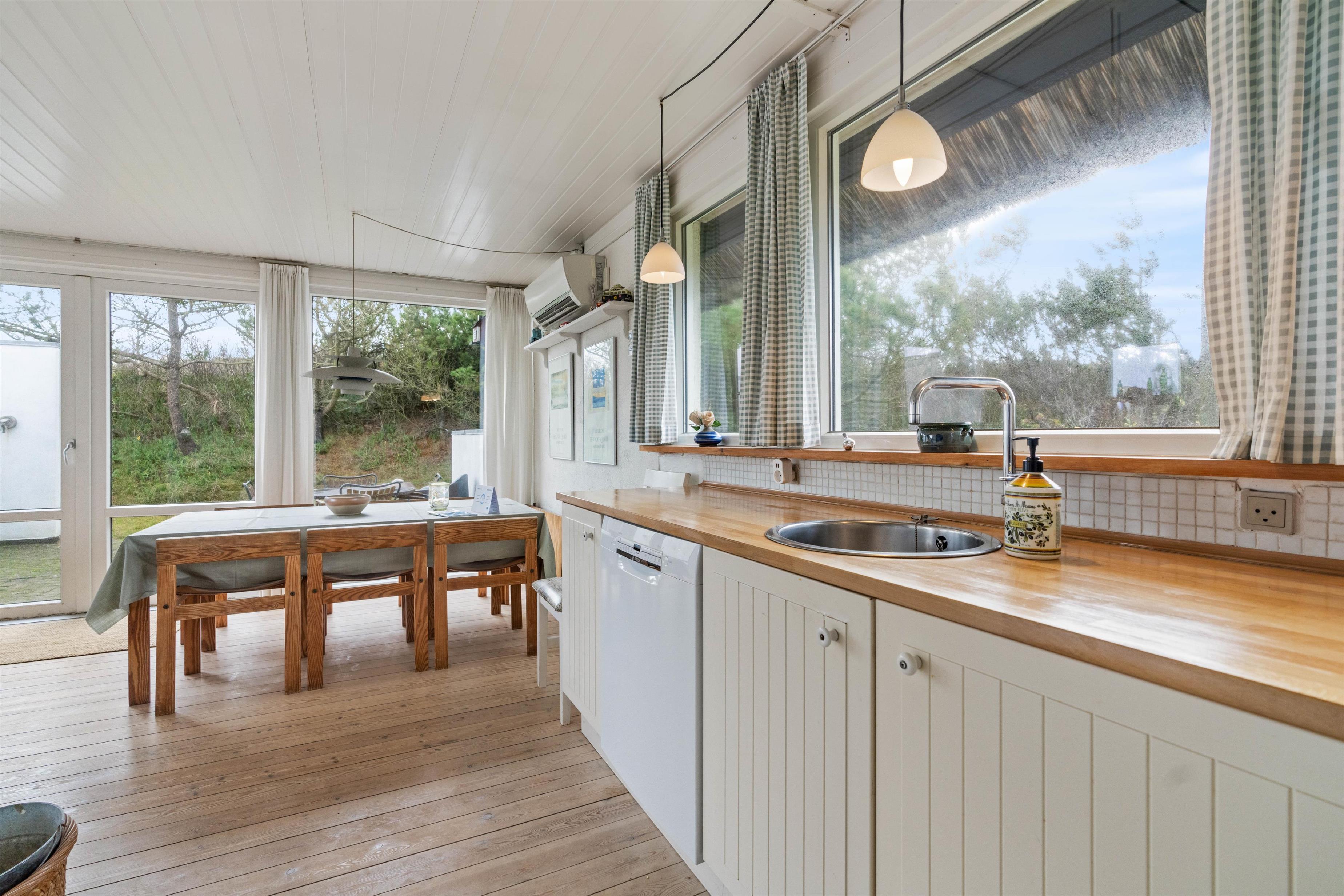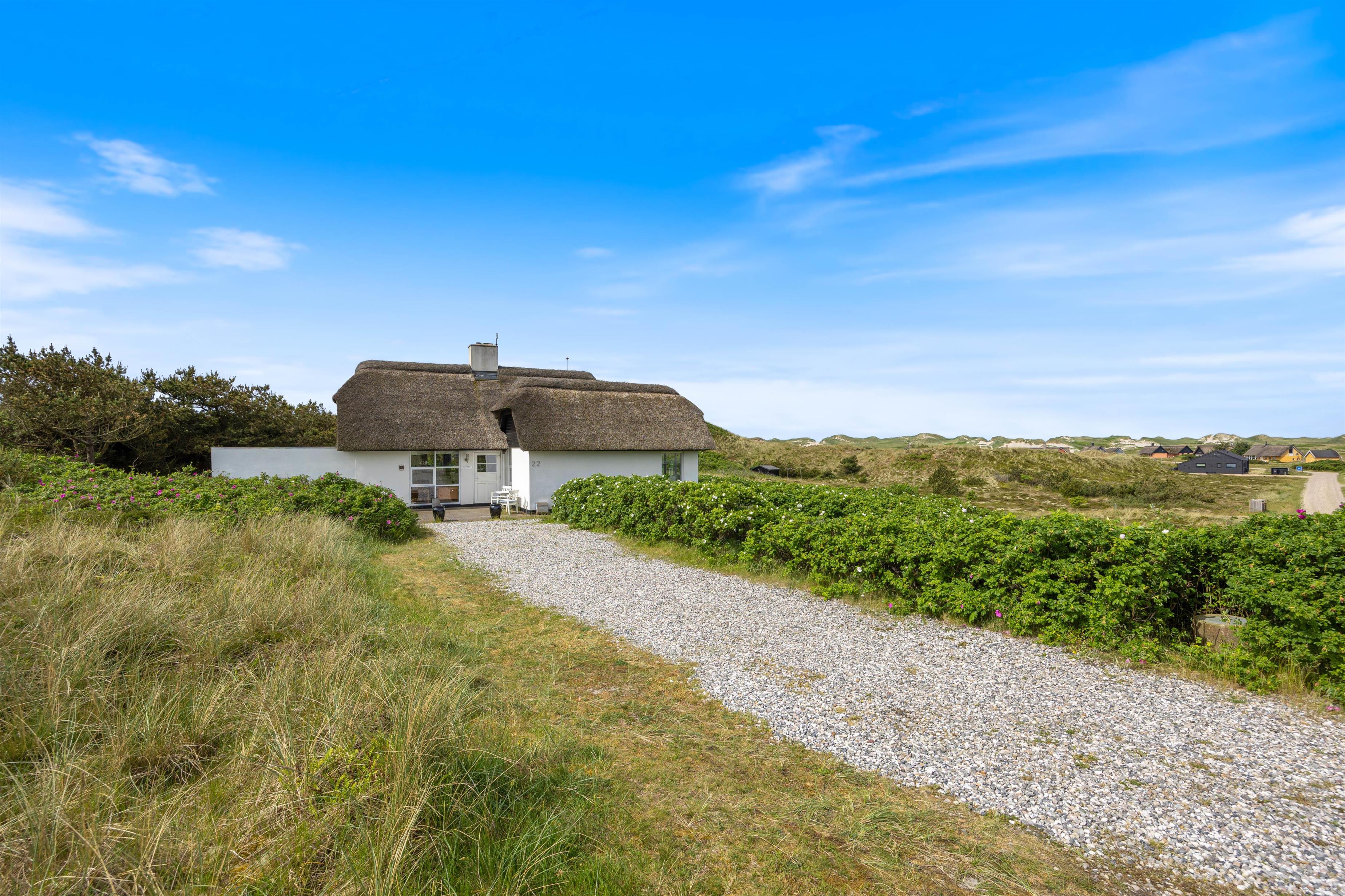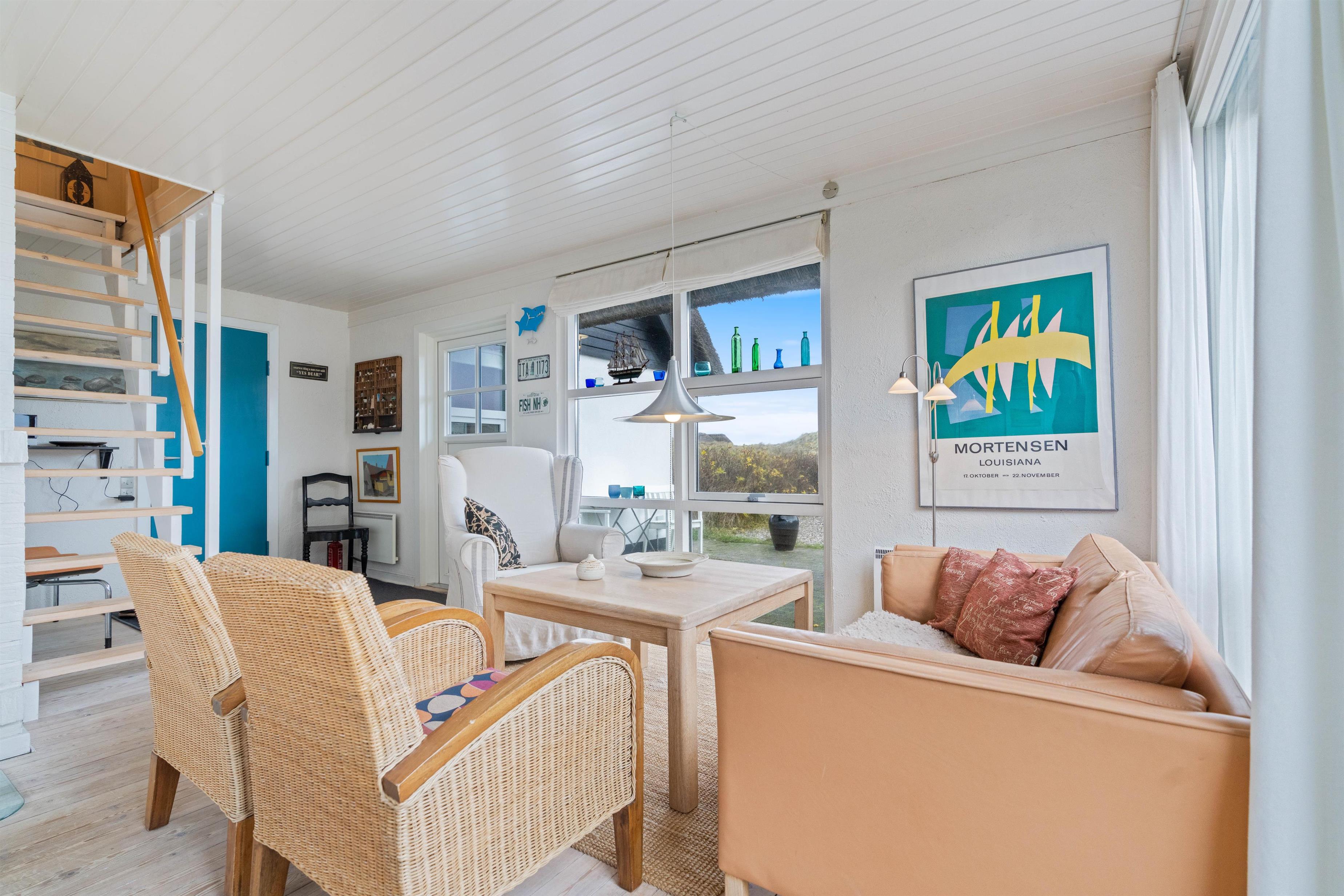 Feriehus med dejlig indretning og udsigt til smukke naturomgivelser. Omkring sommerhuset findes flere gode terrasser, så I kan nyde den smukke udsigt, den friske salte havluft, og hyggelige grillaftener. Og området med klitterne, stranden og Vesterhavet indbyder til gåture og udflugter. Det er ikke tilladt at have kat med i sommerhuset, men jeres 2 hunde er meget velkomne.