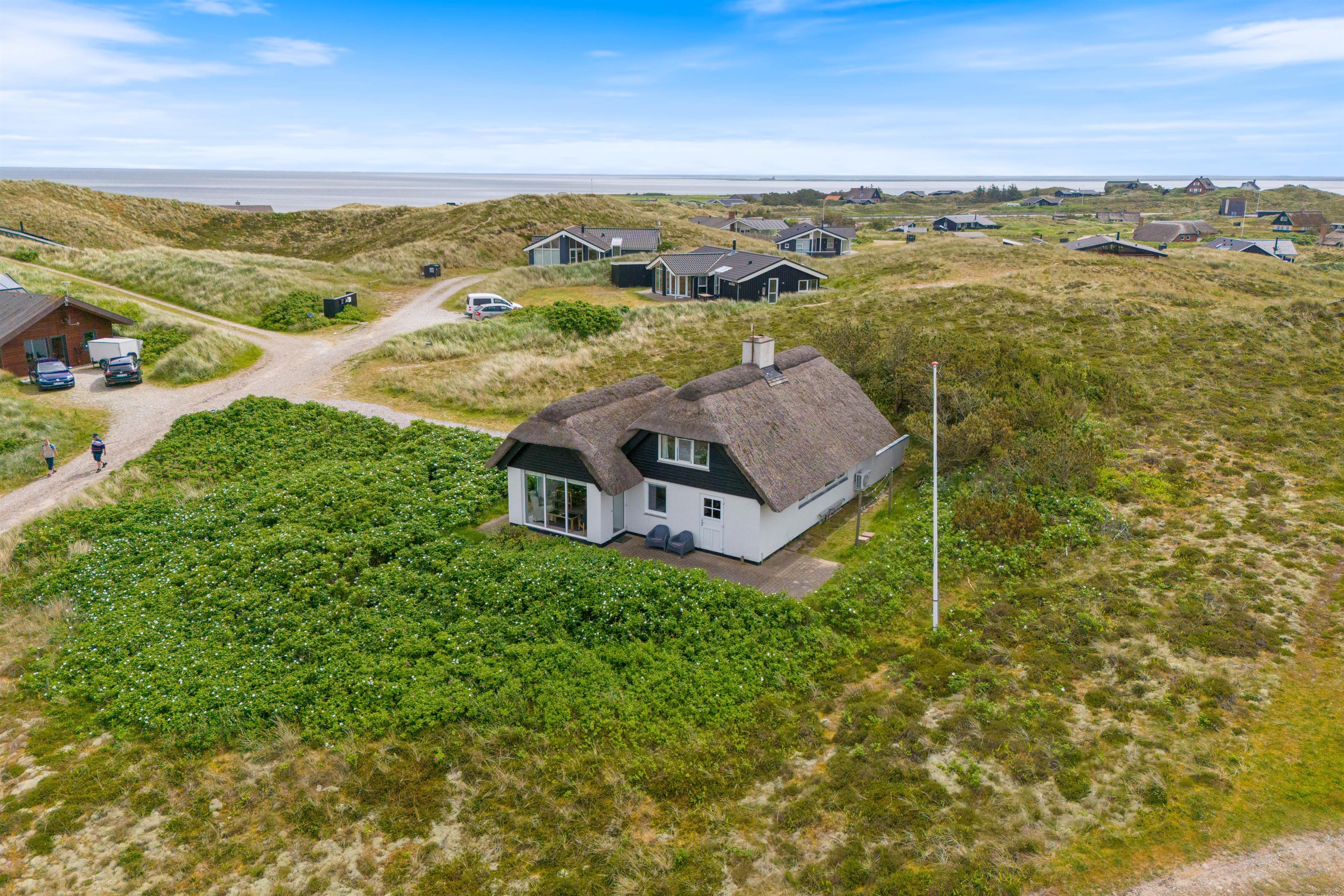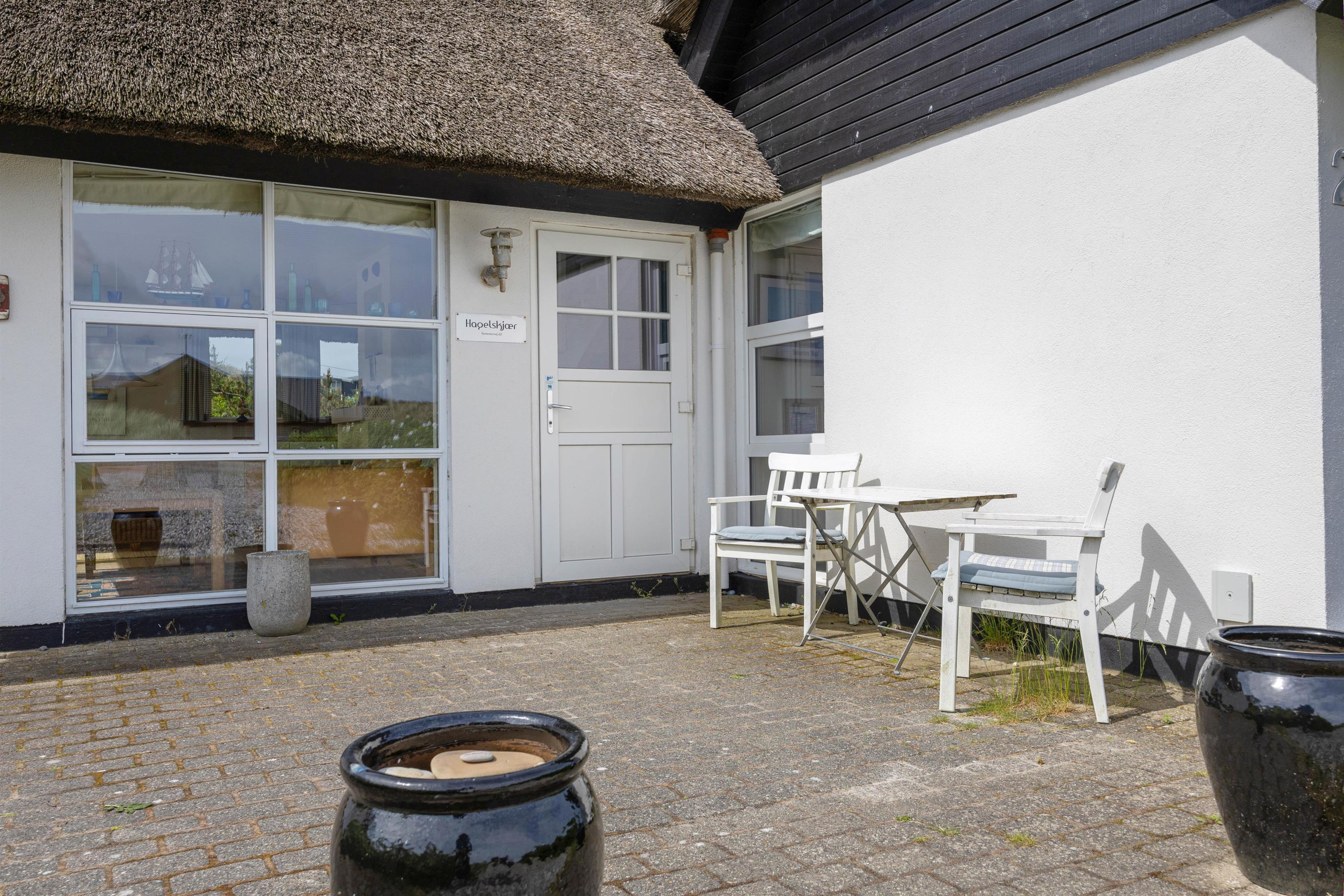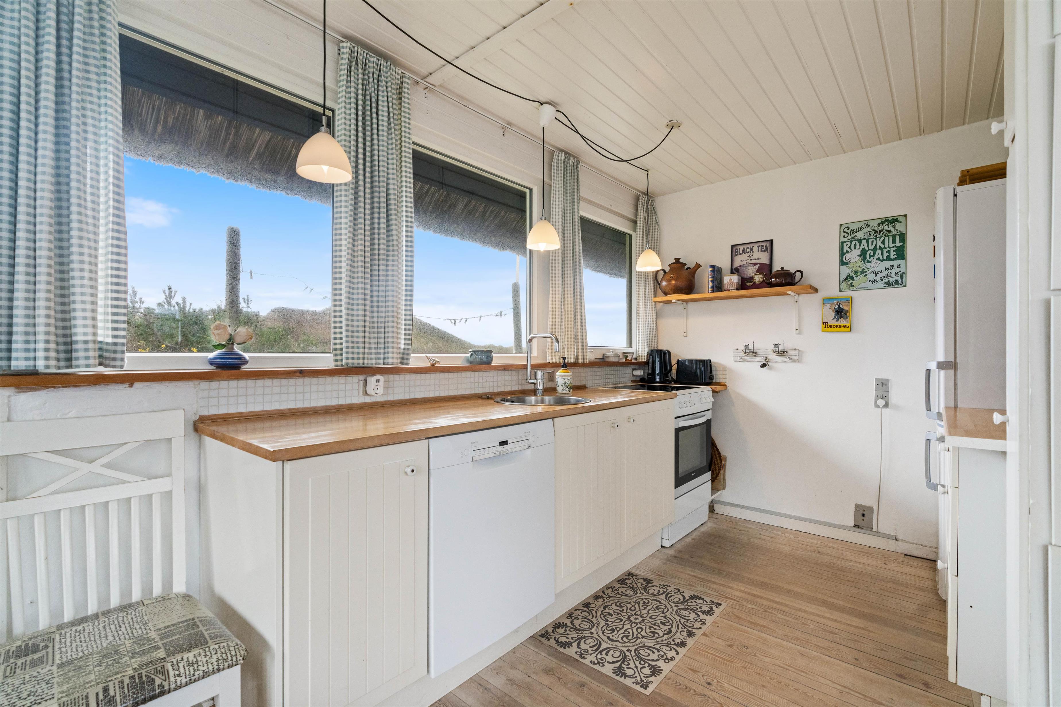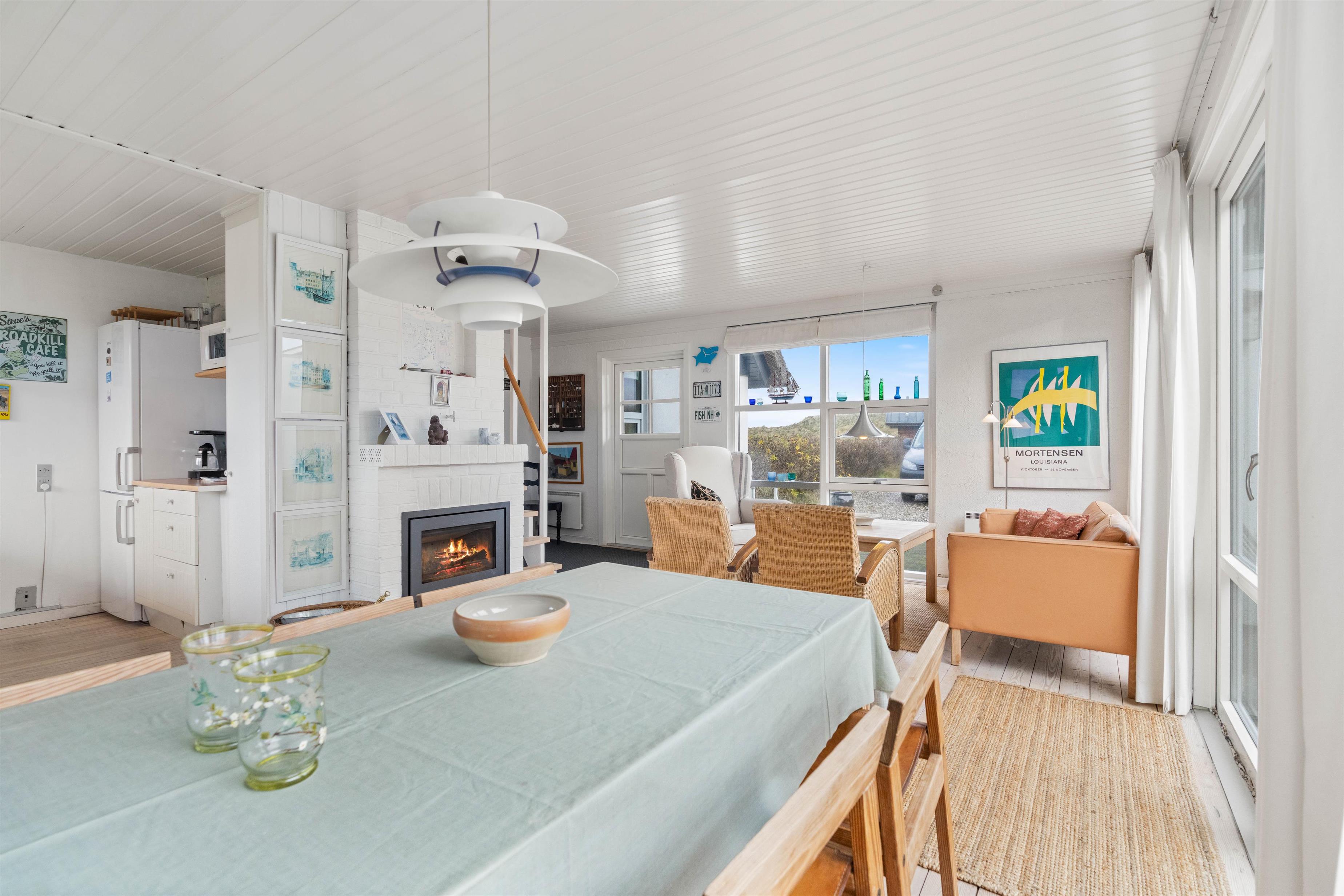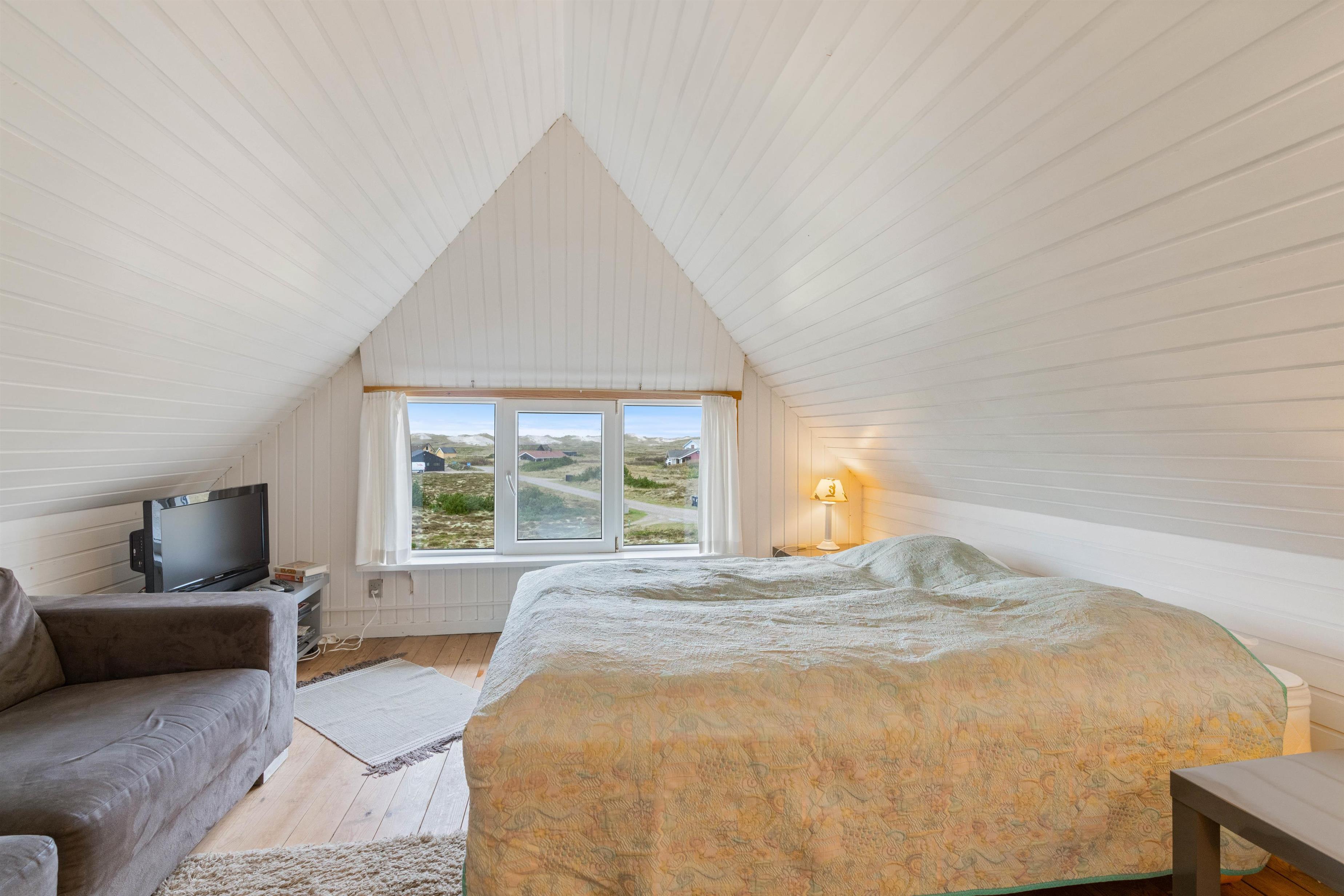 Feriehus med dejlig indretning og udsigt til smukke naturomgivelser. Omkring sommerhuset findes flere gode terrasser, så I kan nyde den smukke udsigt, den friske salte havluft, og hyggelige grillaftener. Og området med klitterne, stranden og Vesterhavet indbyder til gåture og udflugter. Det er ikke tilladt at have kat med i sommerhuset, men jeres 2 hunde er meget velkomne.