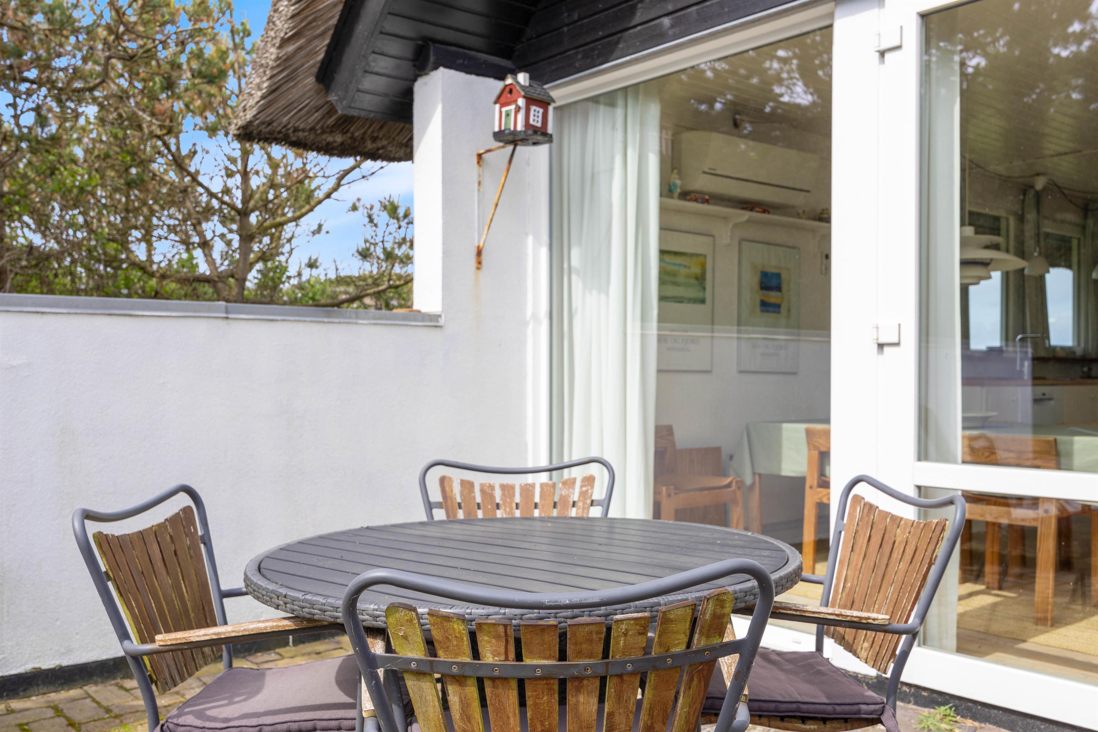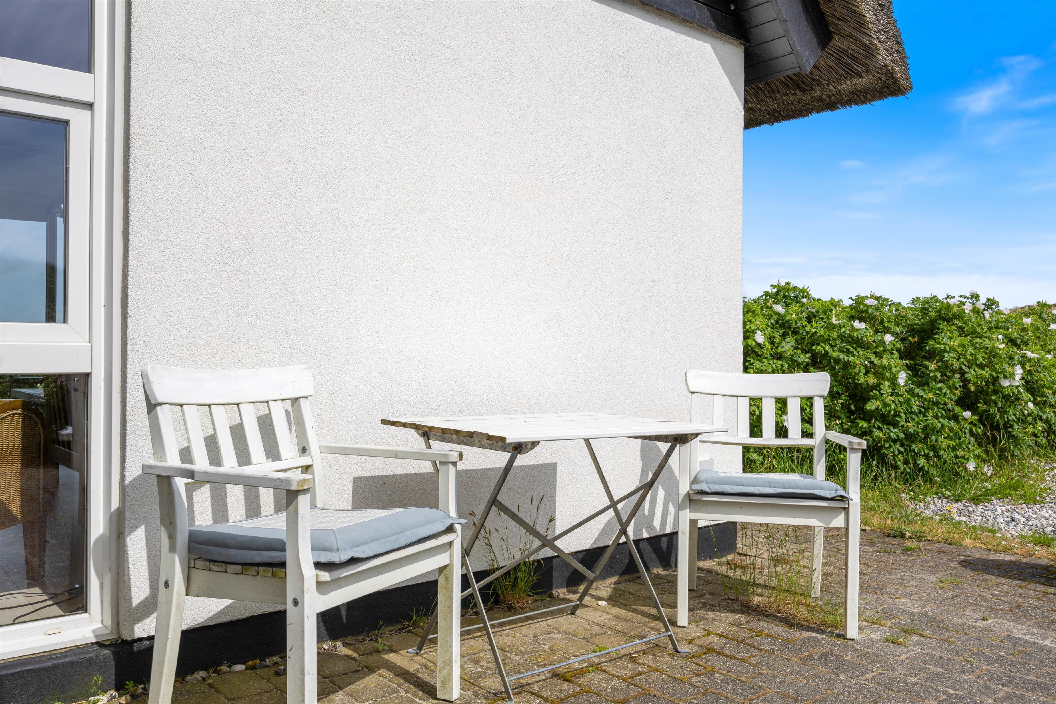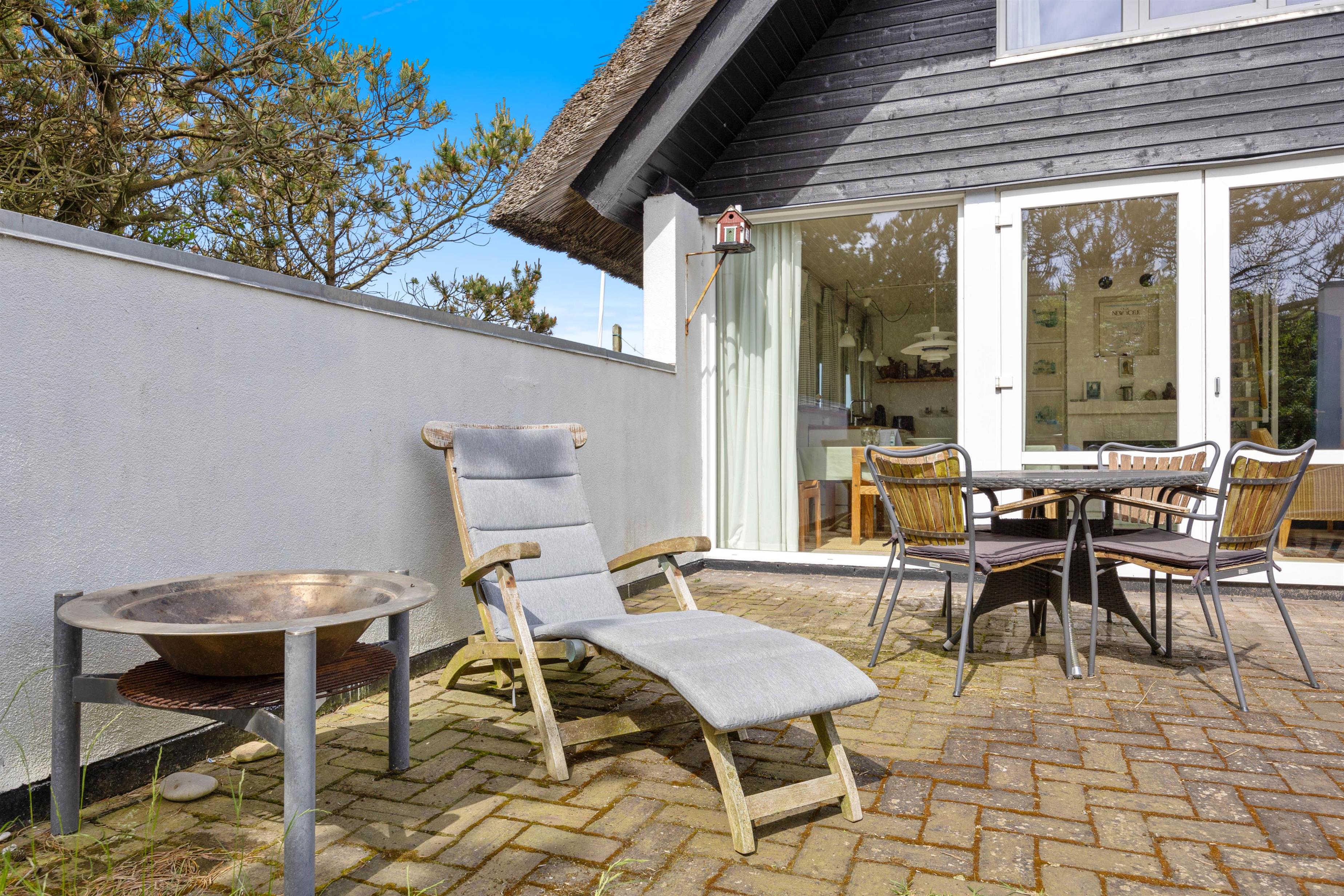 Omkring feriehuset er der tre terrasser, så det nærmest altid er muligt at finde et sted med læ, så I kan sidde ude og nyde naturen. To af terrasserne er åbne, mens den tredje er så godt afskærmet, at det nærmest opleves som en lille gårdhave. Her kan I sidde helt uforstyrret i god læ og nyde solens varme stråler og slutte dagen af med et lækkert måltid tilberedt på grillen.