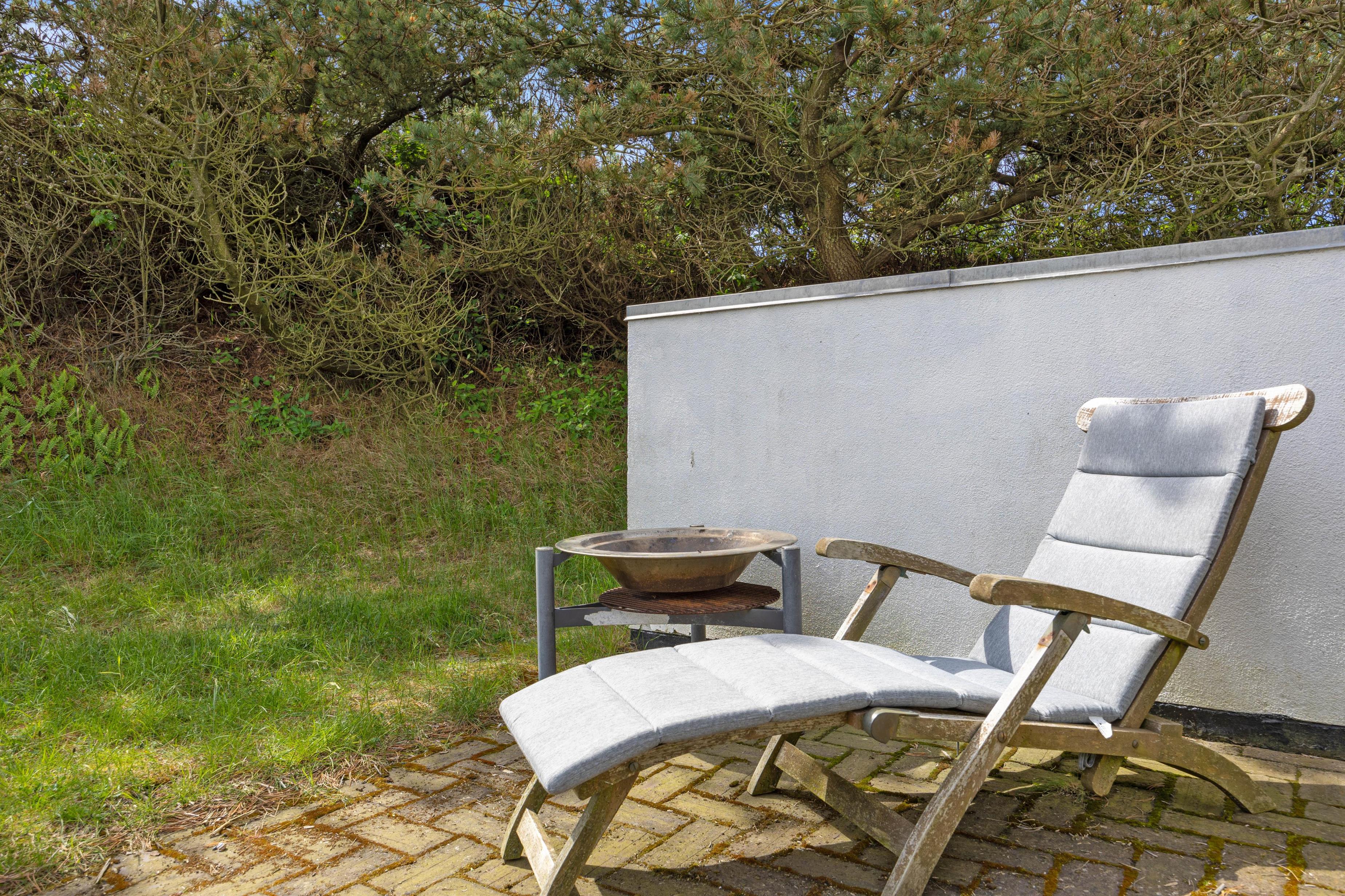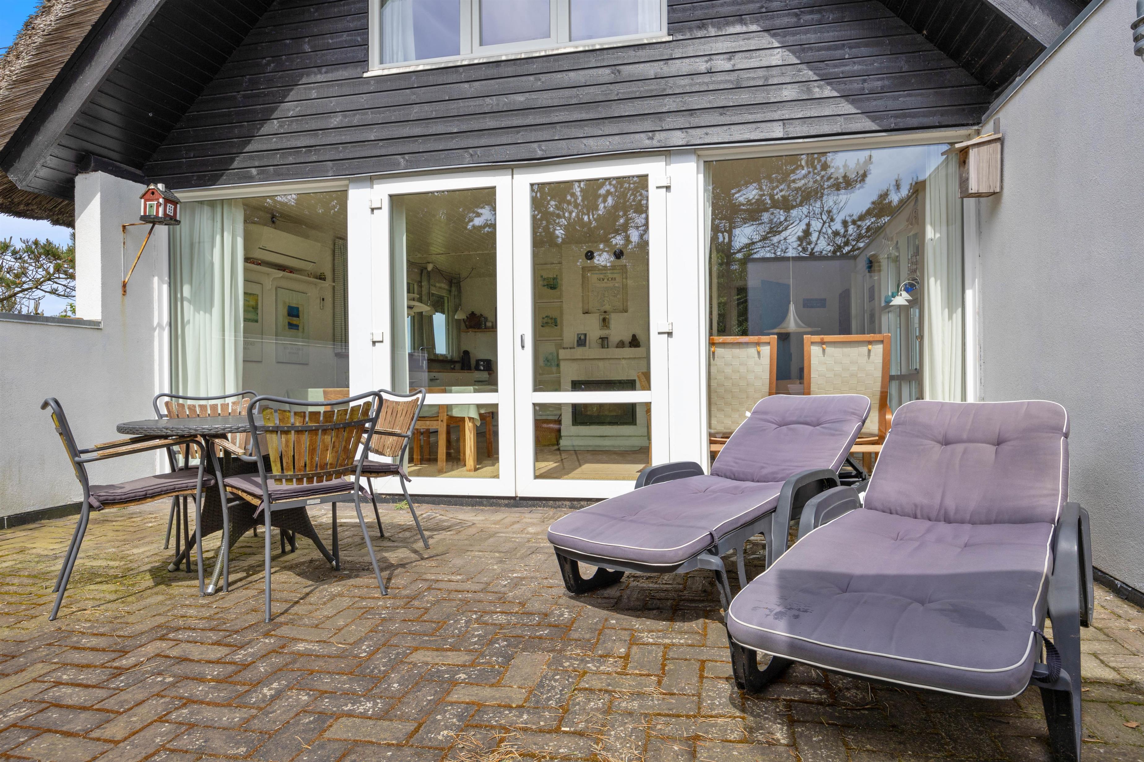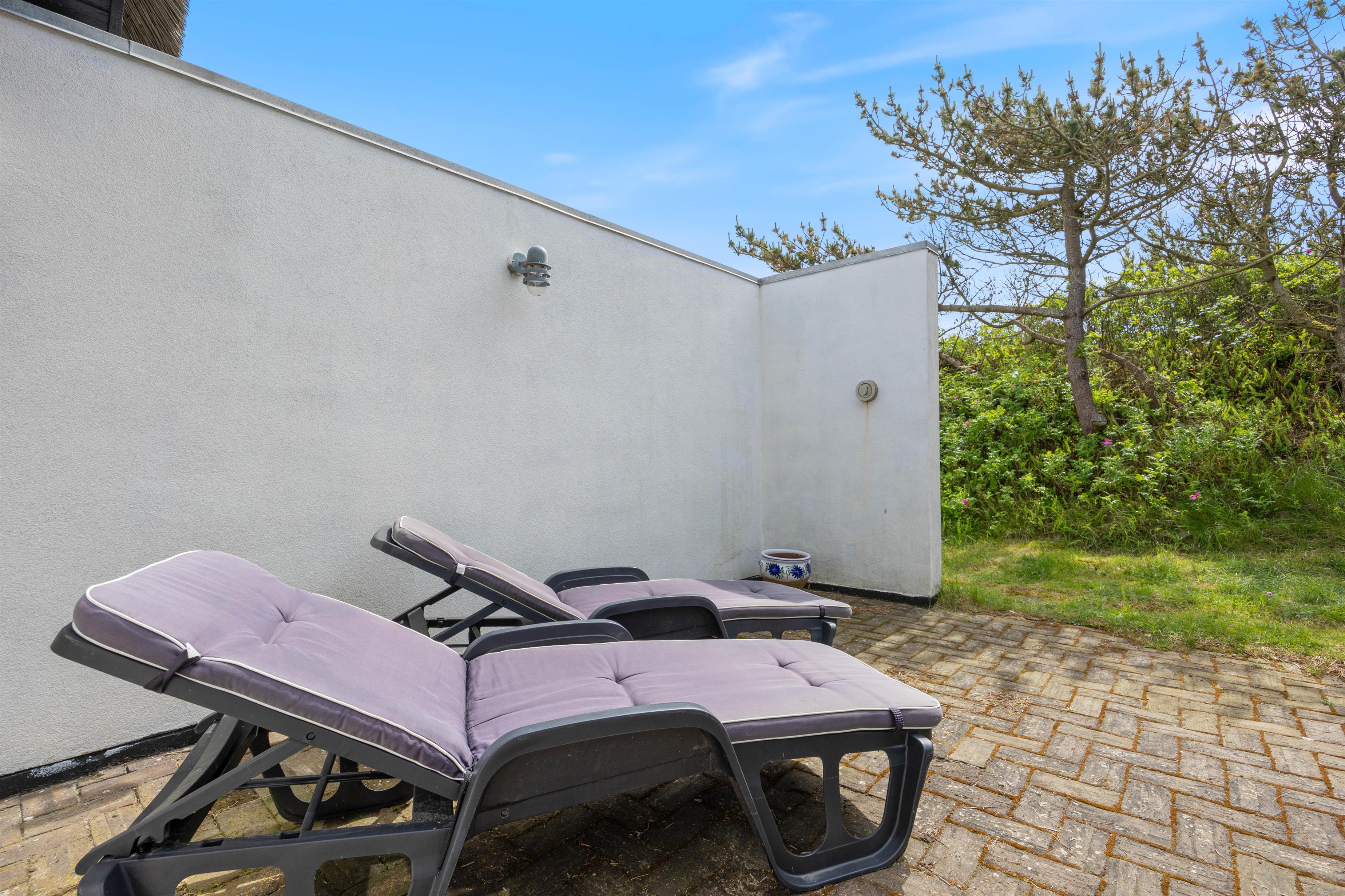 Omkring feriehuset er der tre terrasser, så det nærmest altid er muligt at finde et sted med læ, så I kan sidde ude og nyde naturen. To af terrasserne er åbne, mens den tredje er så godt afskærmet, at det nærmest opleves som en lille gårdhave. Her kan I sidde helt uforstyrret i god læ og nyde solens varme stråler og slutte dagen af med et lækkert måltid tilberedt på grillen.