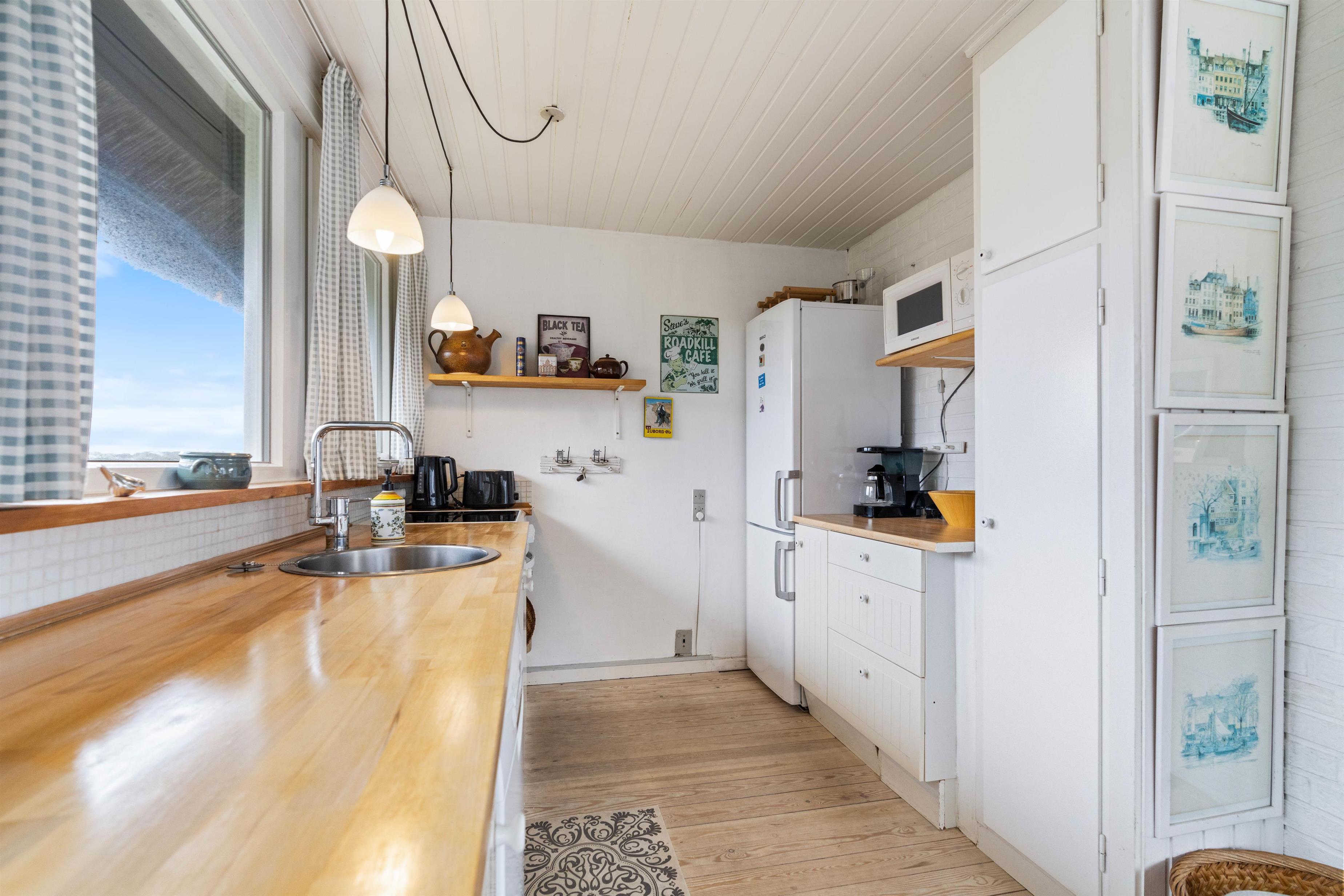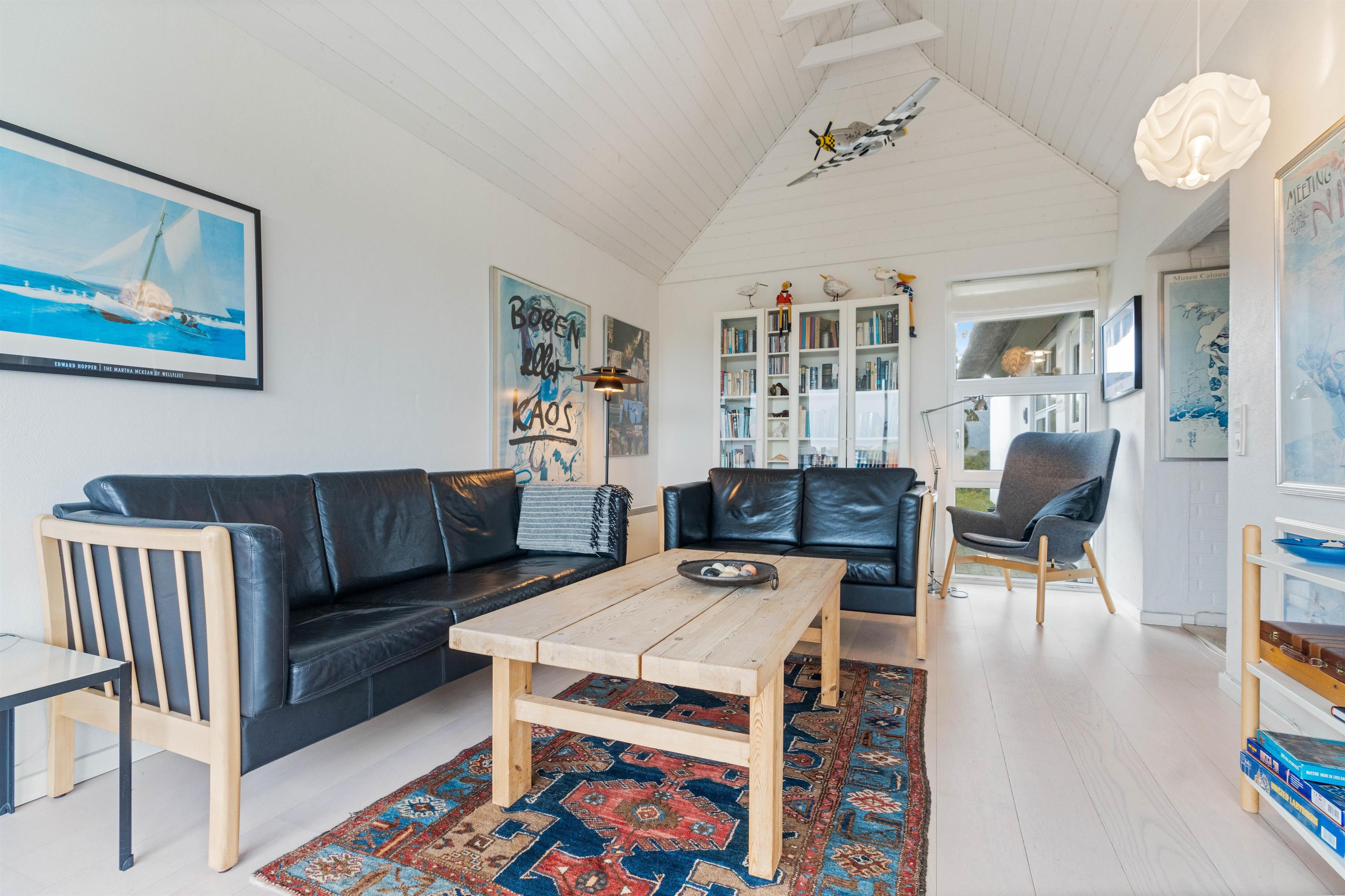 Feriehuset fremstår lyst og venligt. Og i den flotte rummelige stue med loft til kip og et stort vinduesparti kan I sidde og nyde udsigten over området eller hygge Jer med en god film foran fladskærms-tv'et.