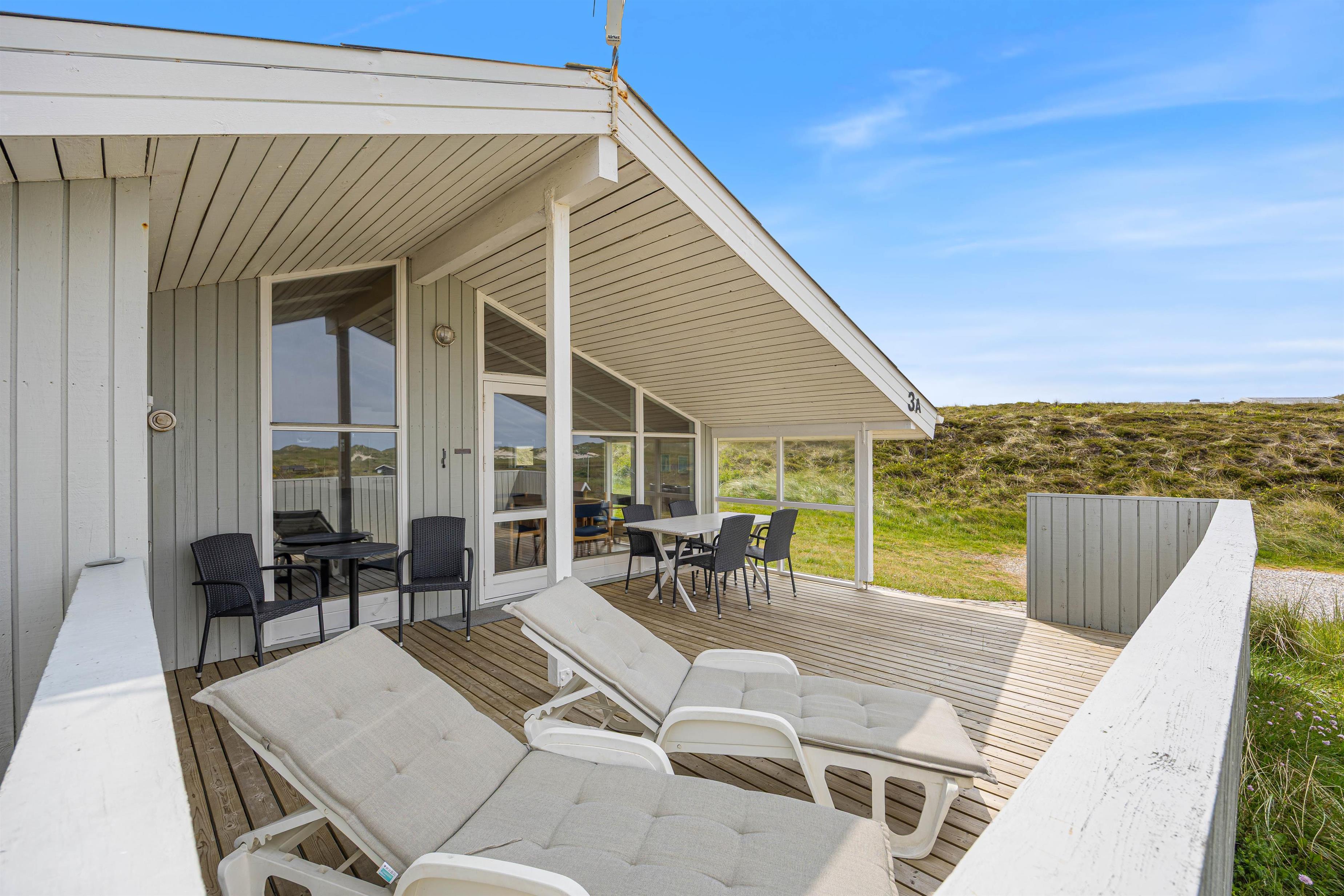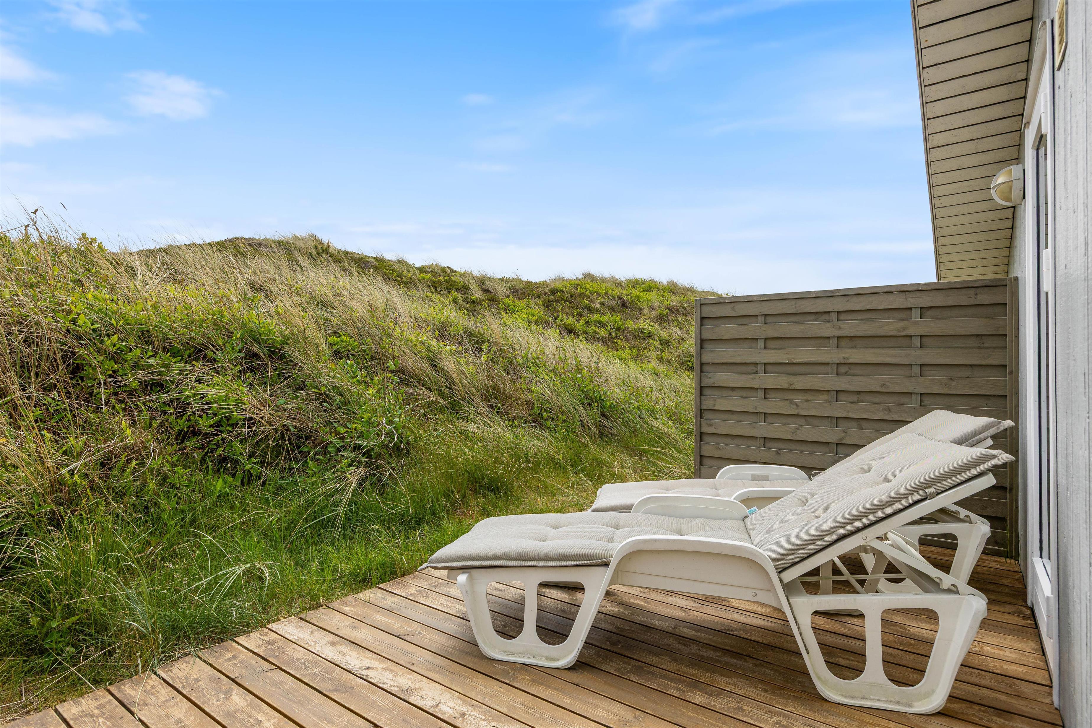 Feriehuset er placeret på en højtbeliggende klitgrund, og når I har parkeret bilen, vil en lille trappe føre jer op på den ene af terrasserne. Terrassen her ligger mod vest, er stor og delvist overdækket. Her kan I nyde morgenkaffen, en god bog på liggestolene under solens varme stråler eller i skyggen. Til en rigtig sommeraften hører sig grillmad til – det er derfor oplagt at sidde her og nyde en god bøf eller fisk, stegt på grillen.
