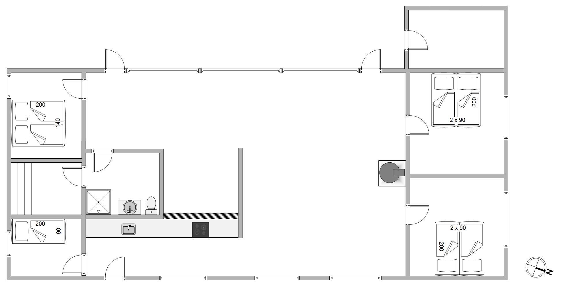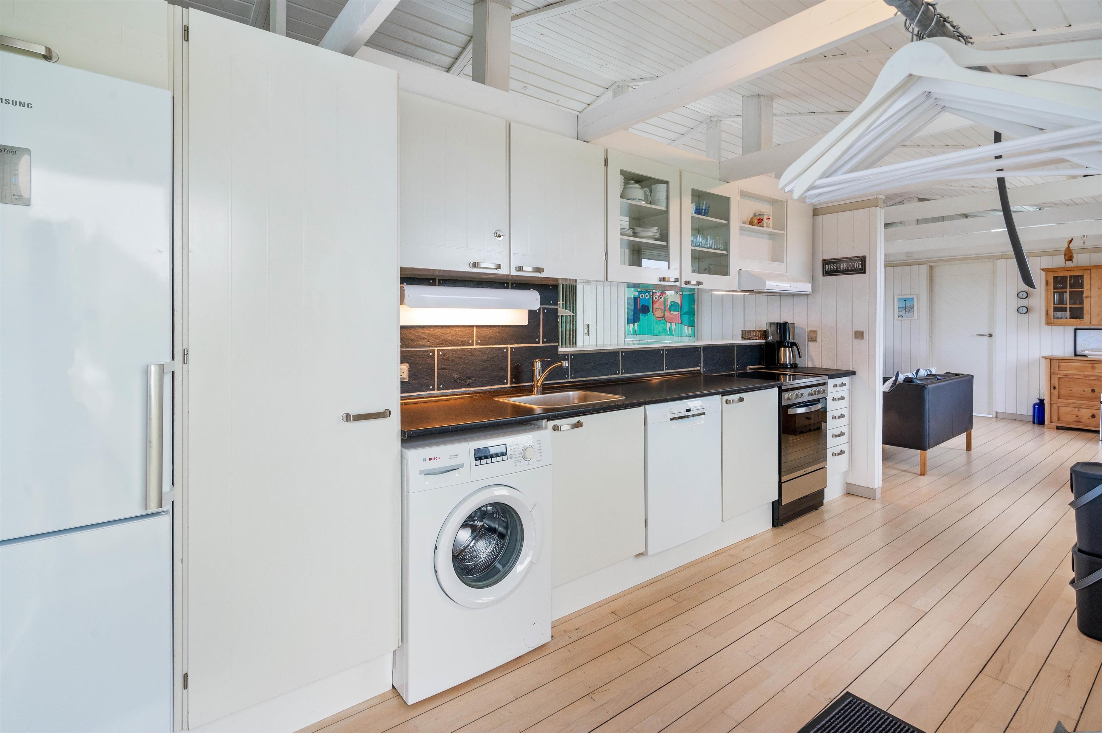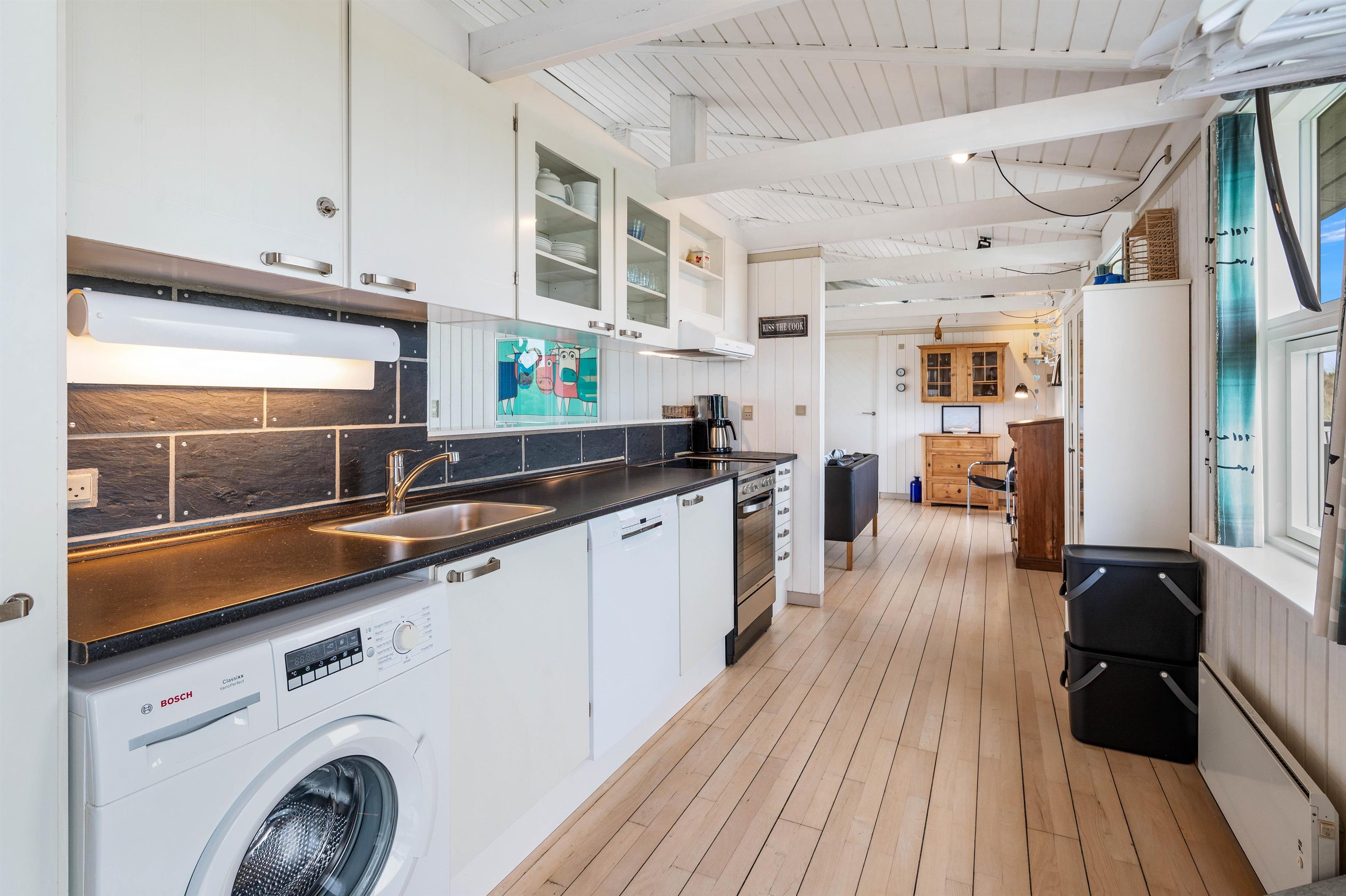 Sommerhuset er på 114 m2 fordelt på 4 værelser, køkken/stue og et badeværelse med sauna. Fra køkkenet er der en skøn udsigt mod øst og vest, ligesom der fra stuen er en vidunderlig udsigt mod vest. De lyse trægulve er flotte og passer godt ind i sommerhusets arkitektur. Sommerhuset indeholder bl.a. gratis trådløst internet, vaskemaskine, brændeovn og varmepumpe.