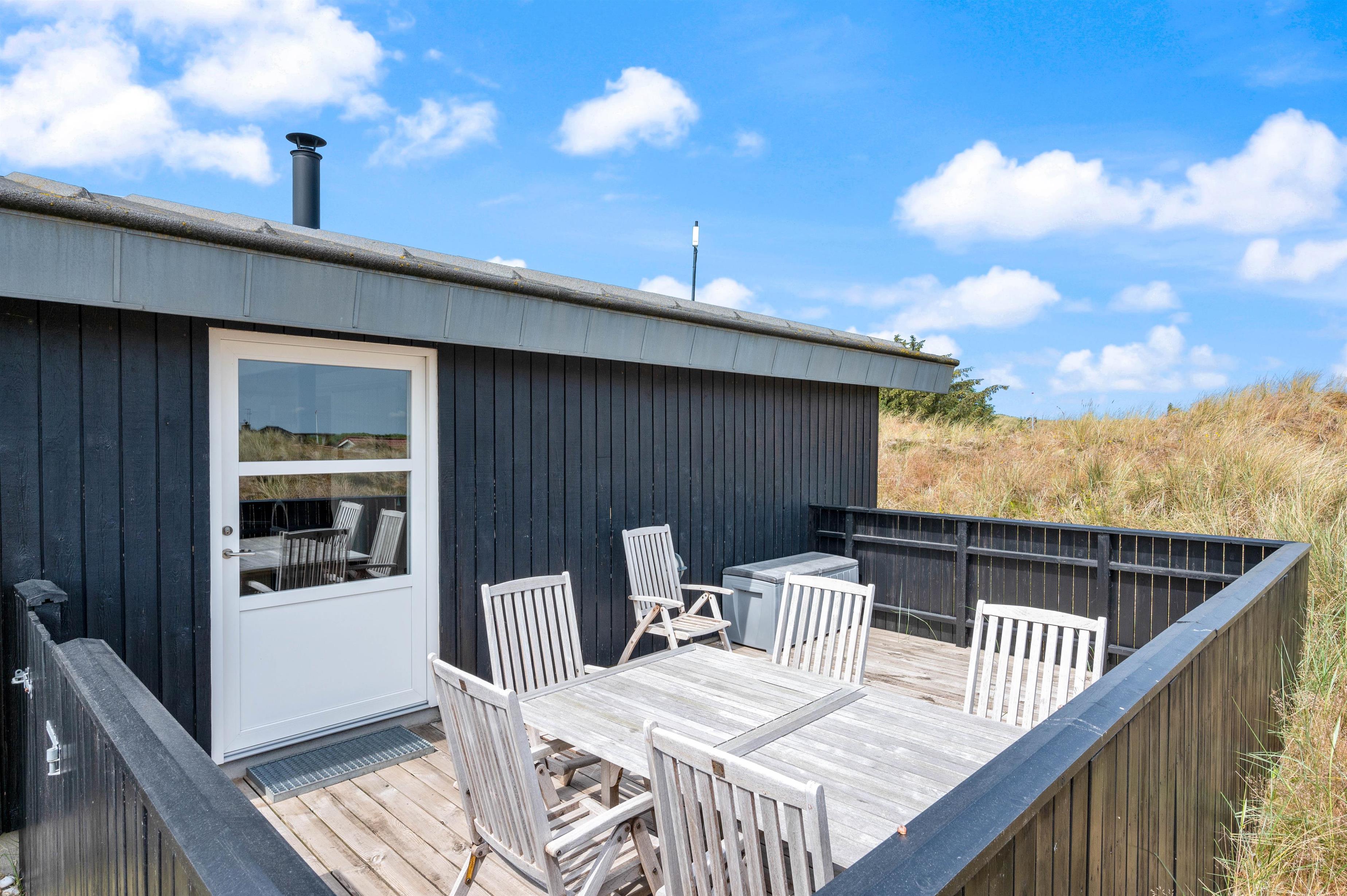 Der er skønne terrasser tilhørende sommerhuset. Mod øst er der en helt lukket terrasse, som er særdeles anvendelig i morgen og formiddagstimerne, og herfra kan I også se over Ringkøbing Fjord. Mod syd og mod vest er terrassen sammenhængende, og klitterne danner samtidig en god afskærmning, især mod vest.