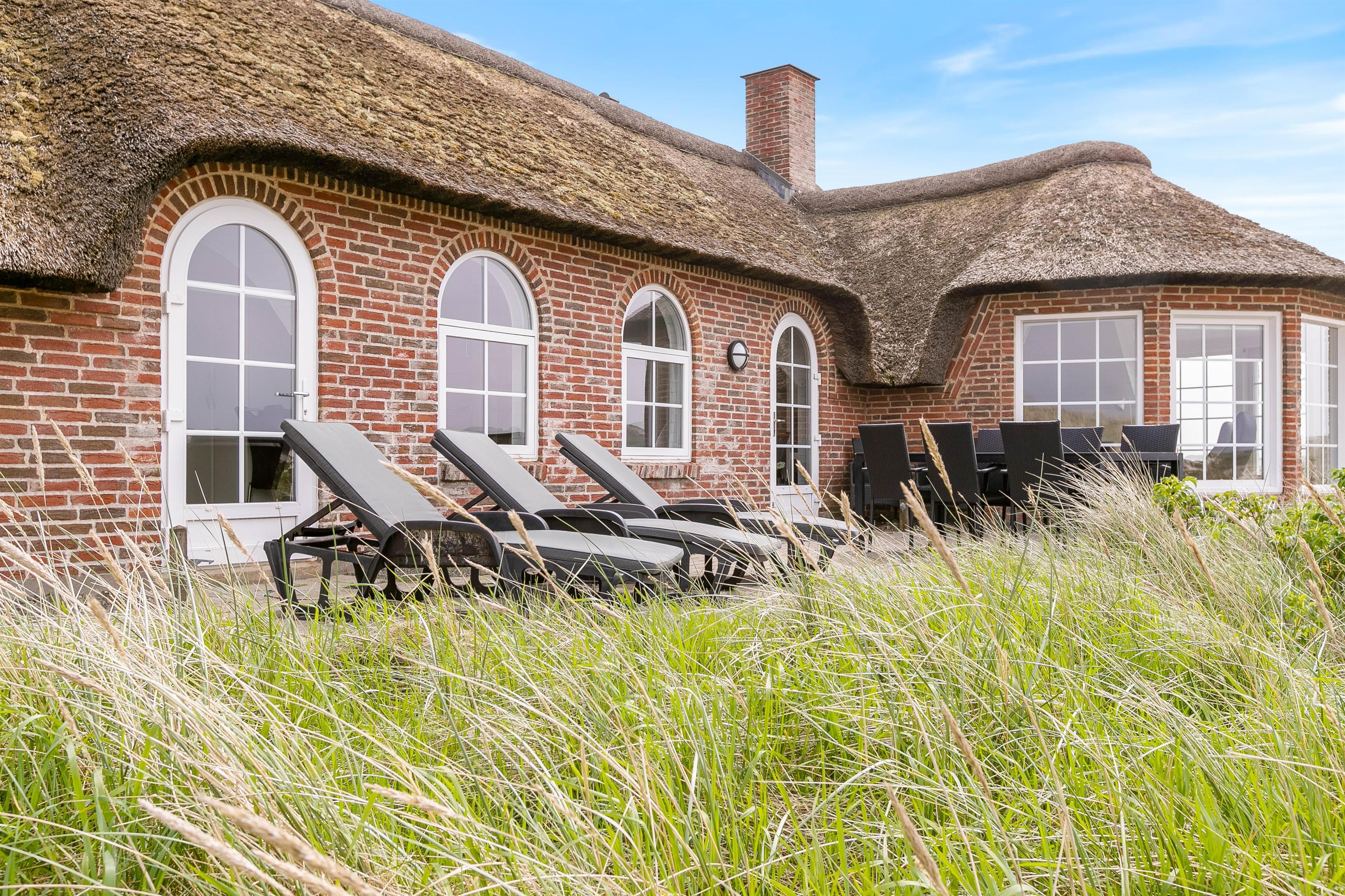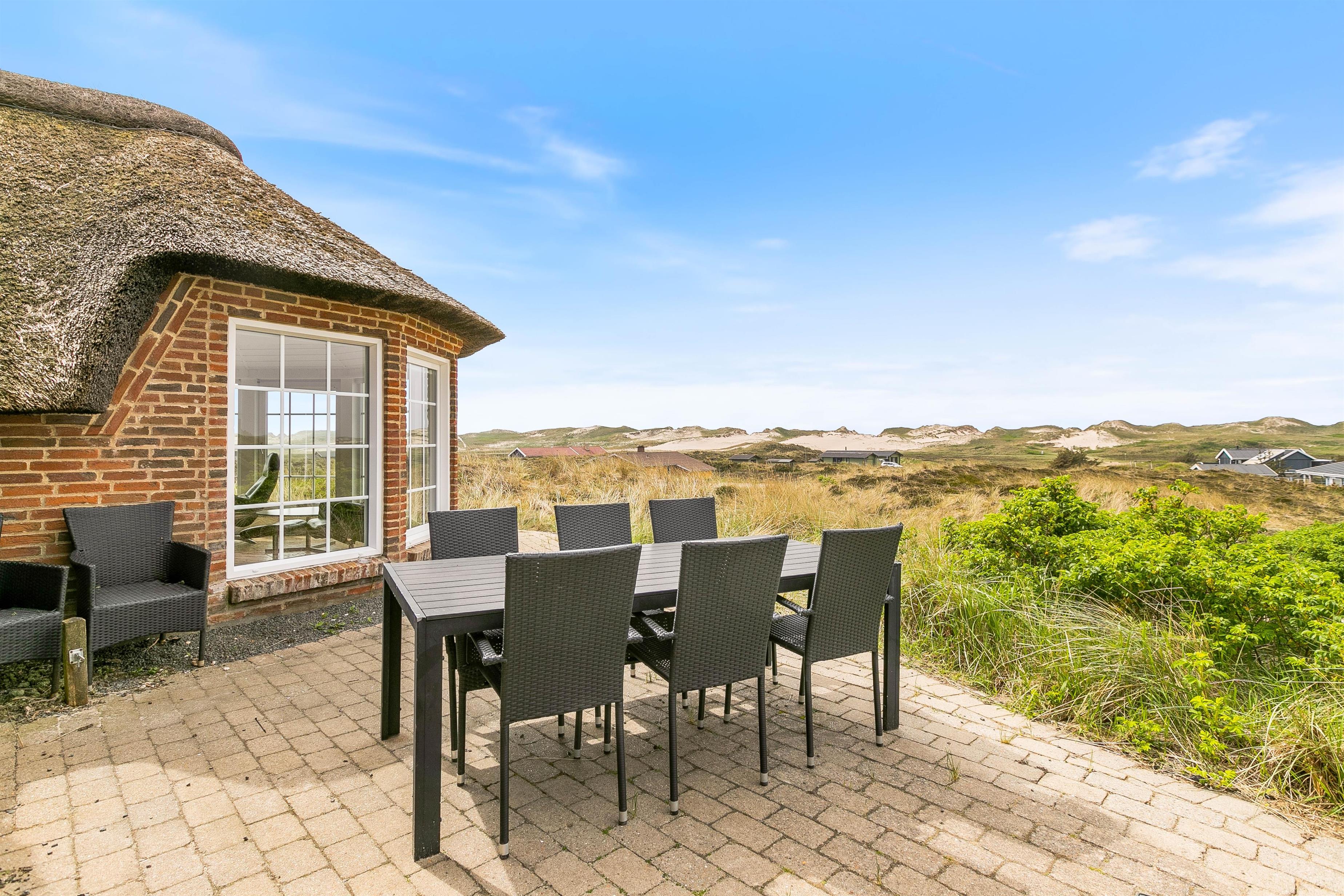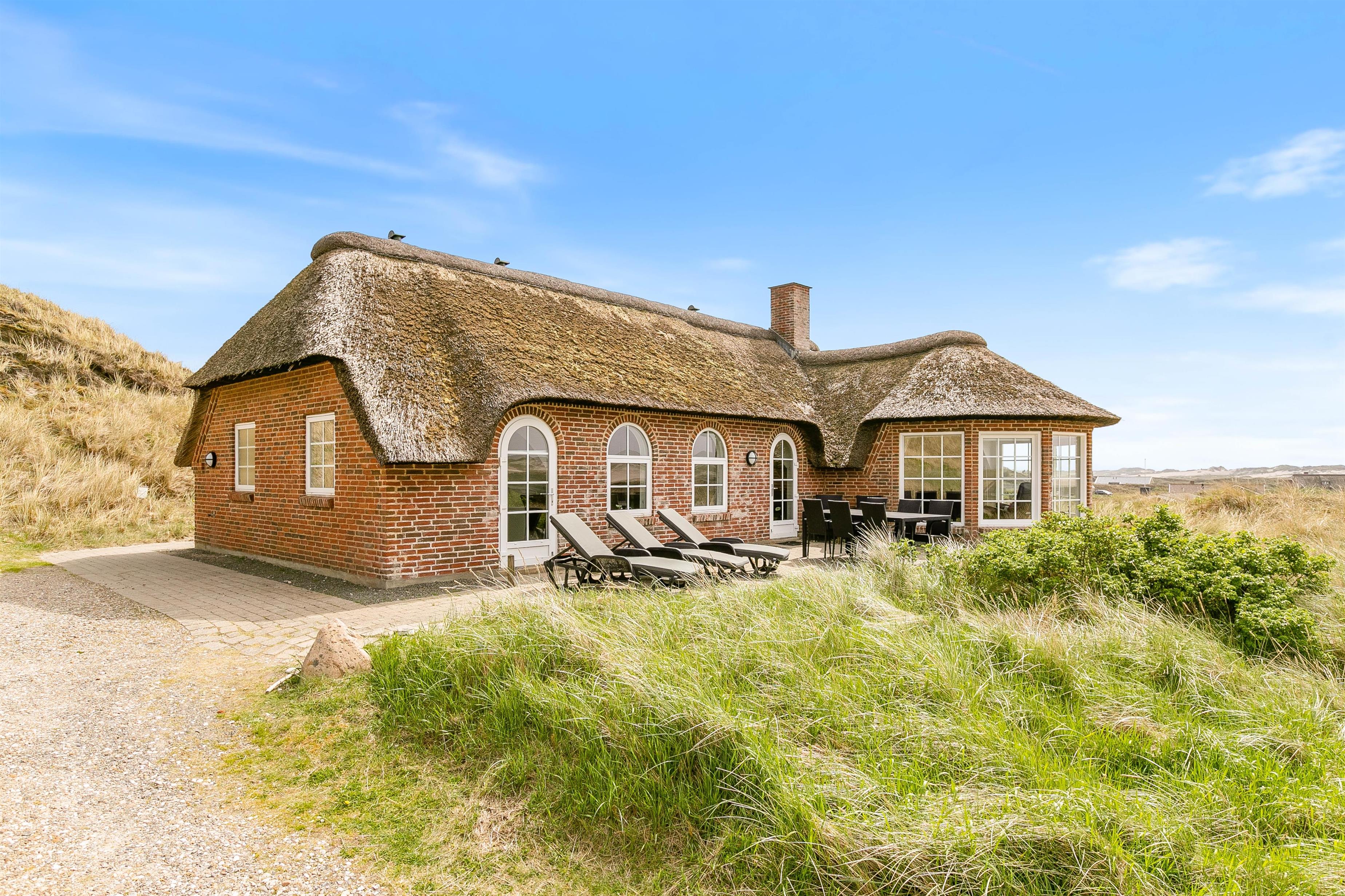 Her kan I holde ferie i et skønt stråtækt sommerhus med dejlig rolig beliggenhed på en kuperet klitgrund i Skodbjerge. Feriehuset er højt placeret på en 2.030 m2 naturgrund med den smukkeste udsigt udover klitterne. Her er plads til 8 gæster, og sommerhuset ligger kun 350 meter fra Vesterhavet.