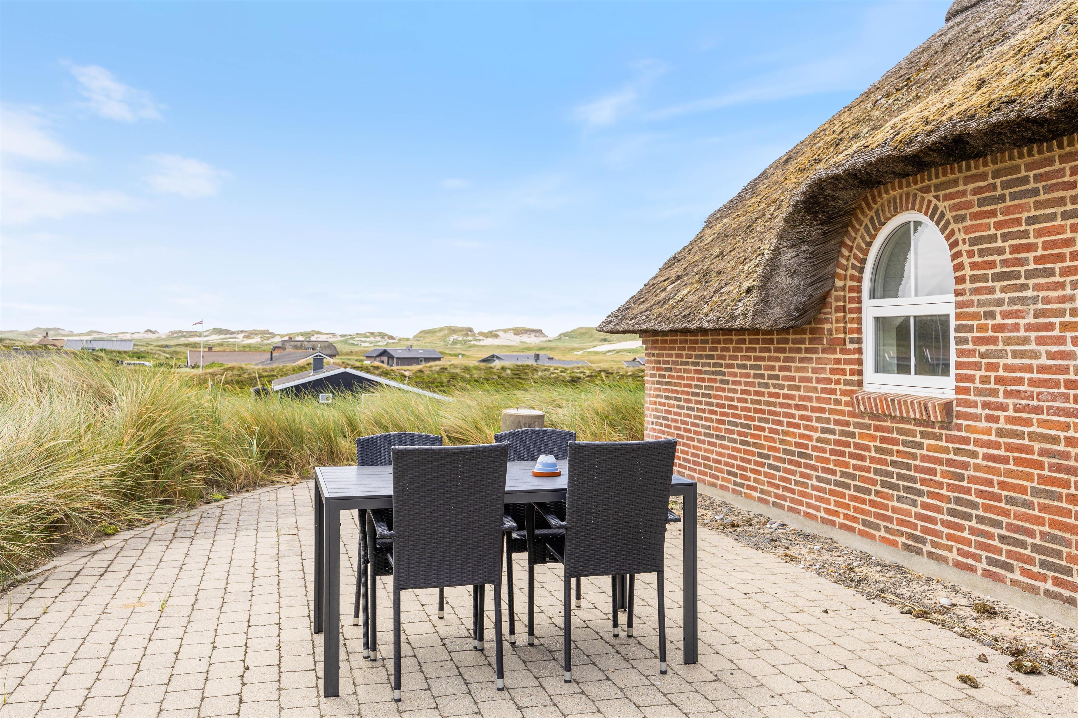 Sommerhuset ligger højt placeret på en kuperet klitgrund, hvorfra der er en skøn udsigt mod syd og vest. Der er fliser hele vejen rundt med særlig god terrasseplads mod øst og vest. Her er der rig mulighed for at nyde solen hele dagen lang. For de små er der en sandkasse.