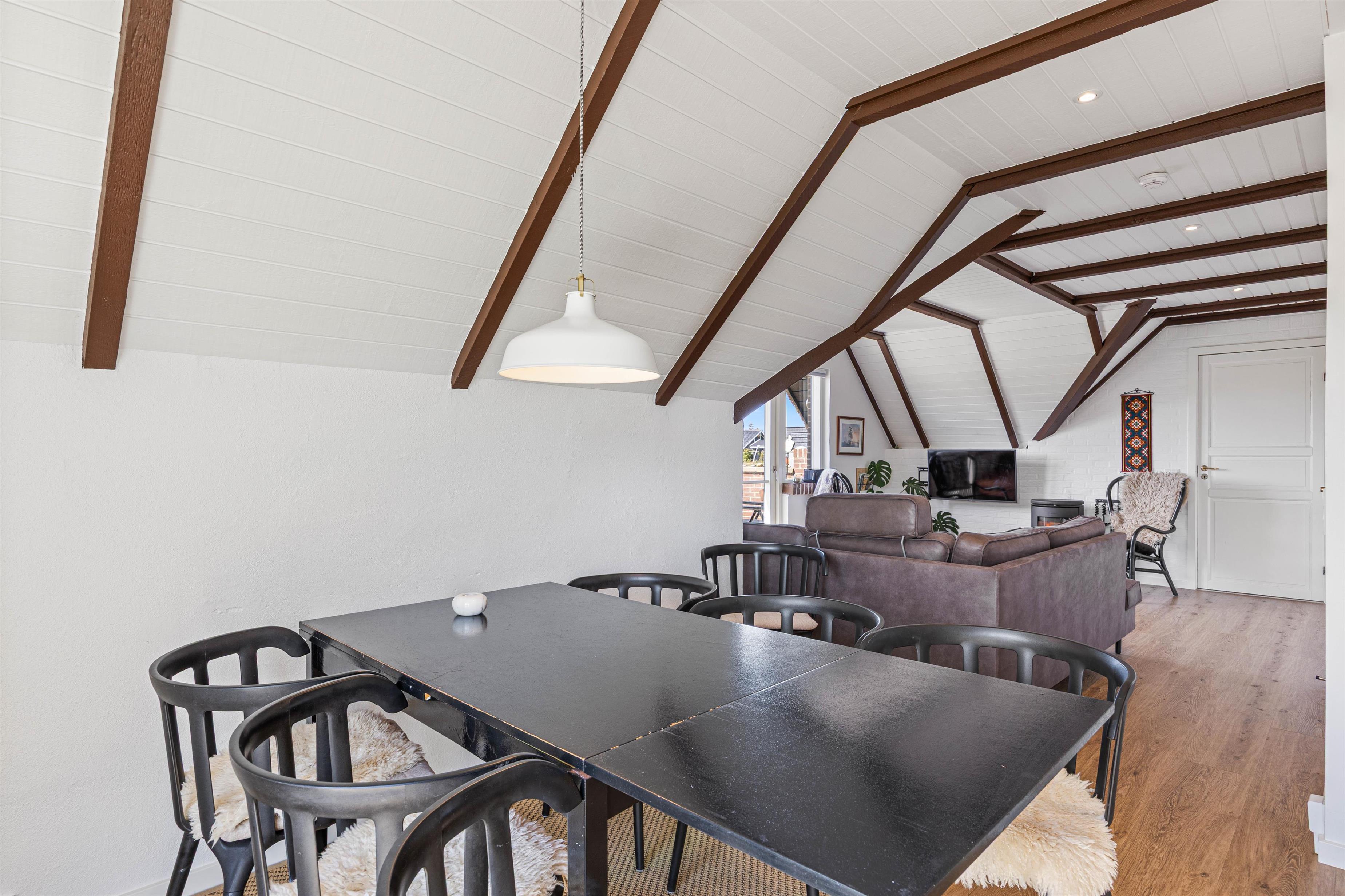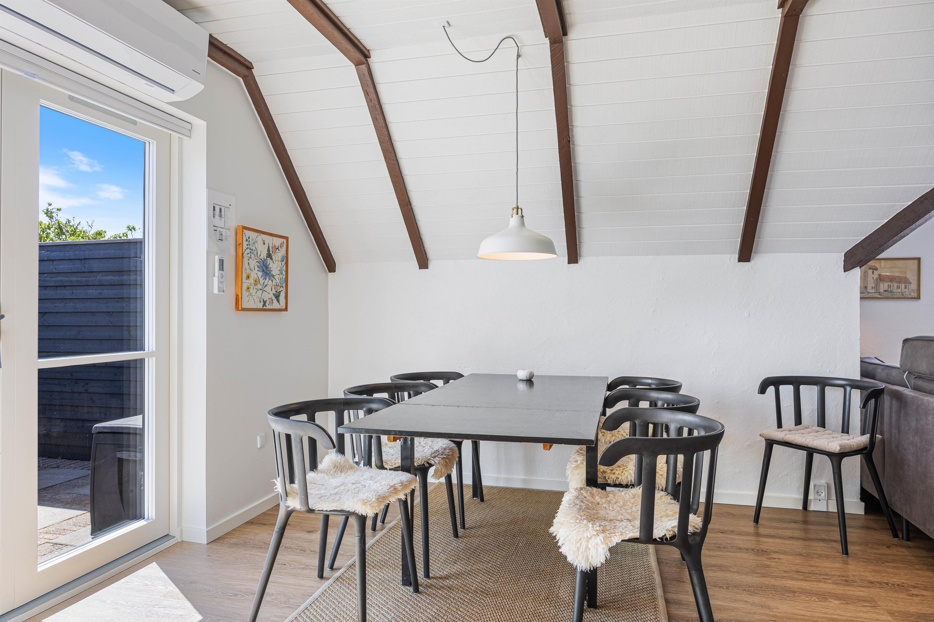 Det moderne og komfortable sommerhus er blevet renoveret i 2024 og er lyst og venligt indrettet. Det åbne køkken i forbindelse med stuen indeholder alt, hvad I behøver for at tilberede lækre måltider til hinanden, herunder induktionskomfur, separat fryser på 80 l og opvaskemaskine. Stuen er hyggeligt indrettet med synlige bjælker, og her kan I nyde samværet foran ilden i brændeovnen. Bemærk, at der er et trin op fra entré til stue-/køkkenområde.