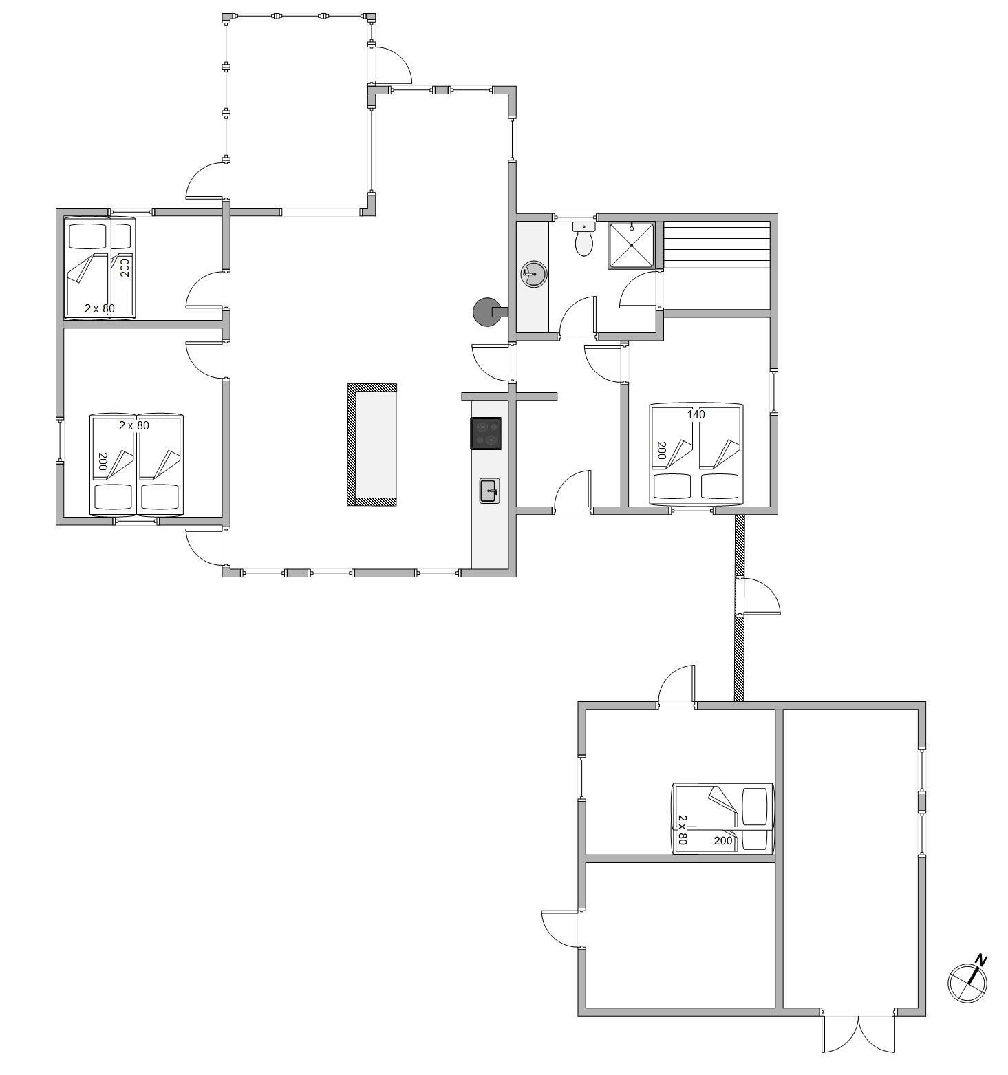 I midten af feriehuset har du et skønt fællesrum med en hyggelige stue og spiseafdeling samt et åbent, veludstyret køkken, hvor der kan laves mad i fællesskab. Ved behov kan I tænde for varmepumpen.