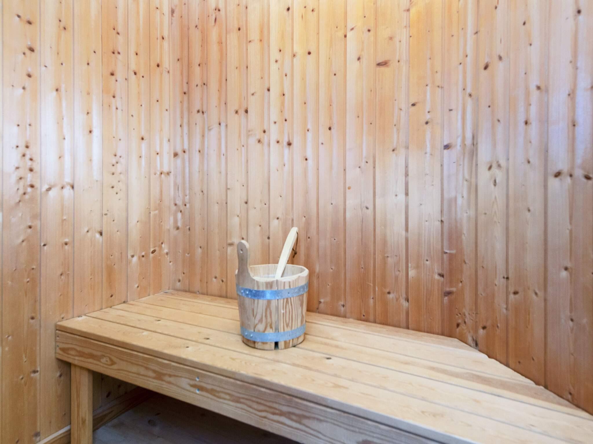 I det store badeværelse er der badekar og sauna, som kan bruges efter en dukkert ved den skønne strand, som ligger få minutters gang væk.