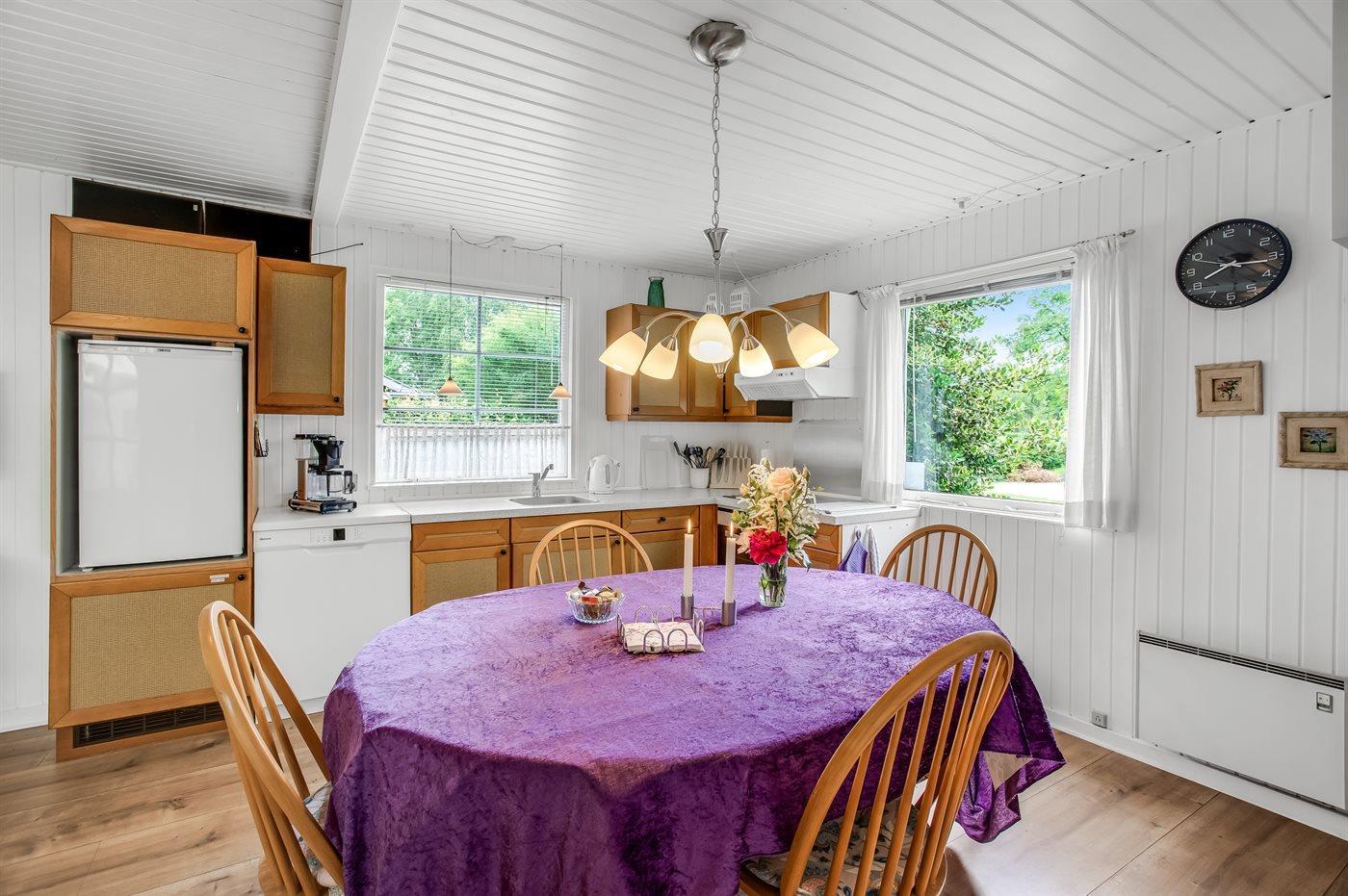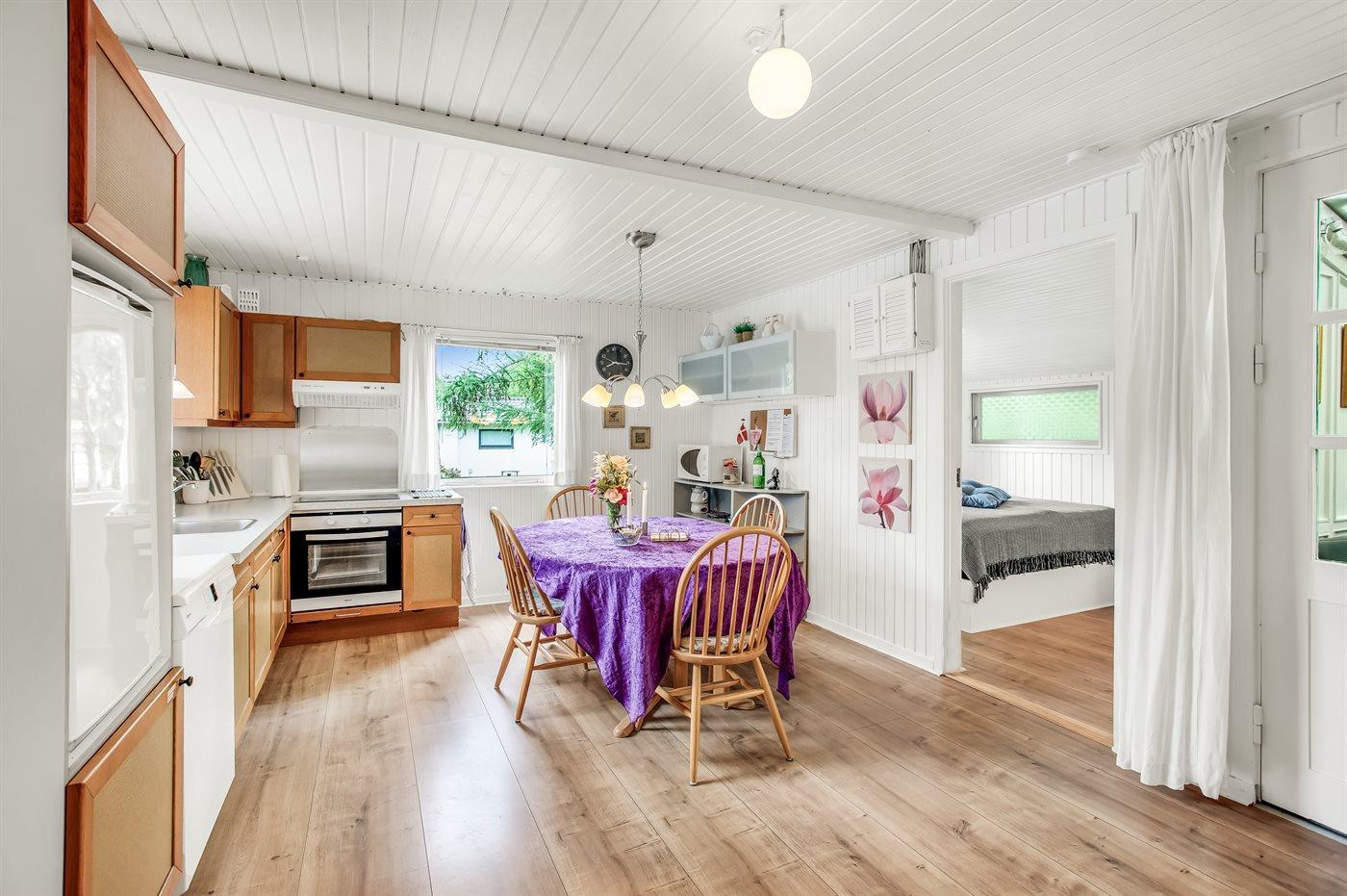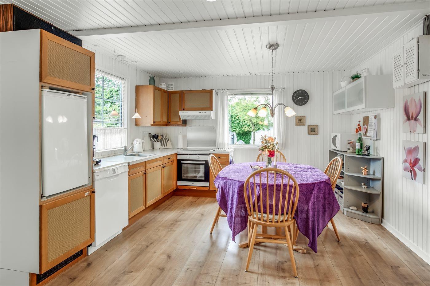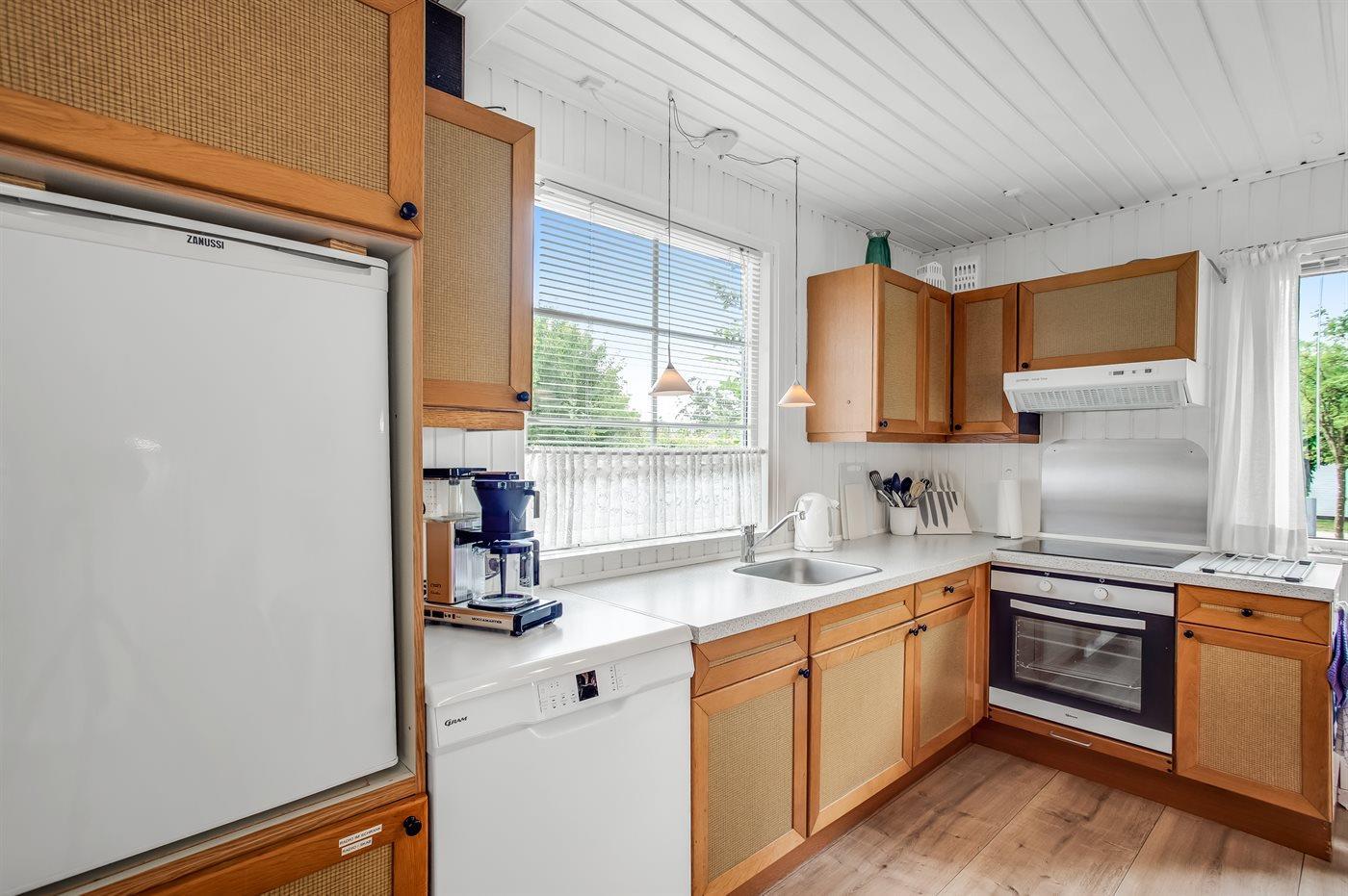 Køkkenet er udstyret med 1 køleskab. Der er 4 keramiske kogeplader, varmluftovn, mikrobølgeovn samt opvaskemaskine.
