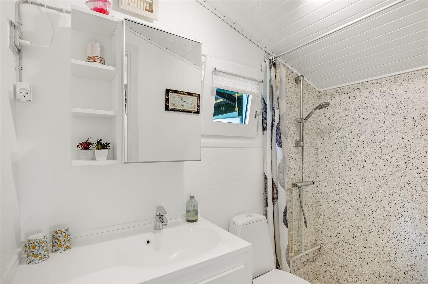 Der er 1 badeværelse med bruser og 1 toilet.