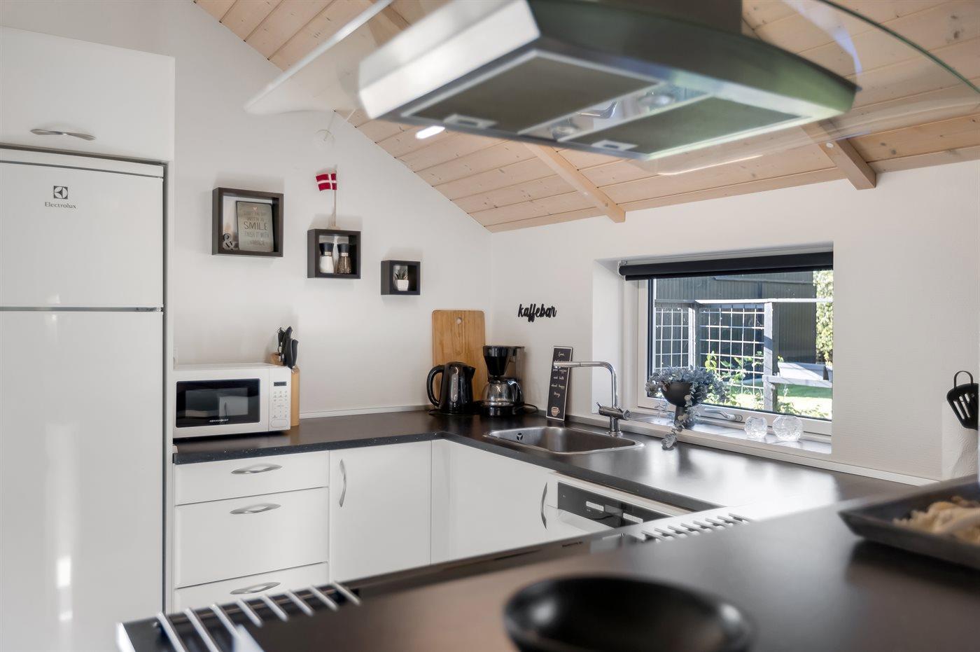 Køkkenet er udstyret med 1 køleskab. Der er 4 induktionskogeplader, varmluftovn, mikrobølgeovn samt opvaskemaskine.
