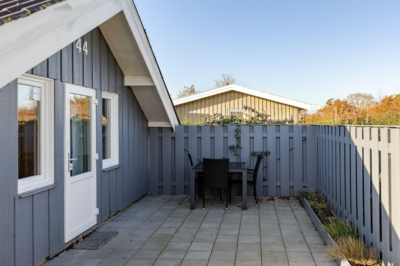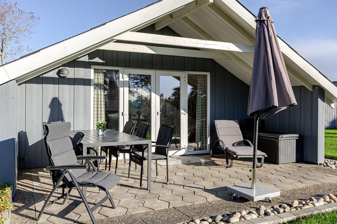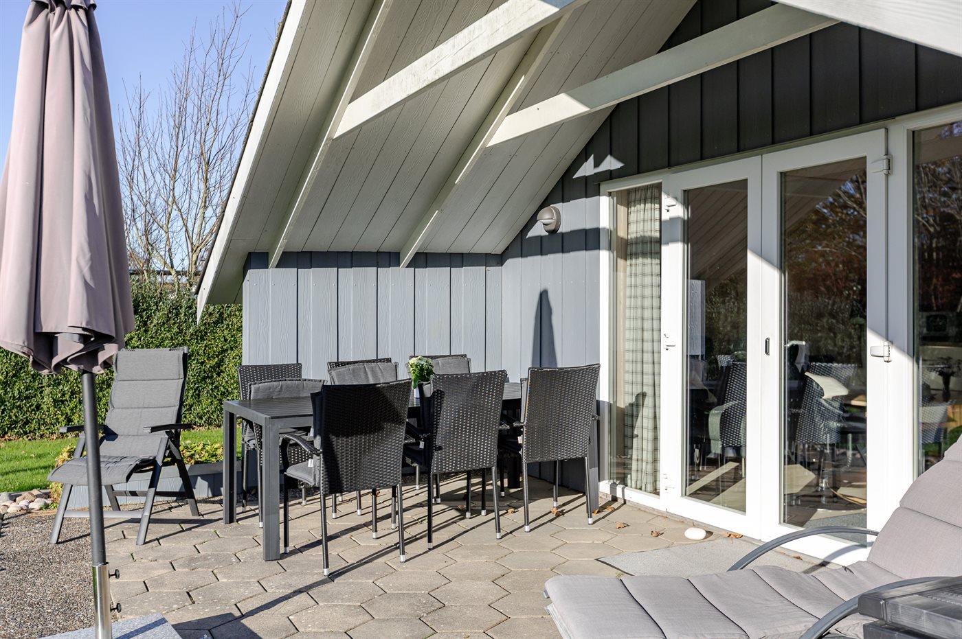 Udendørs venter et dejligt, overdækket terrasseområde, som giver mulighed for at nyde opholdet under åben himmel – også på dage, hvor solen bager fra en skyfri himmel.
