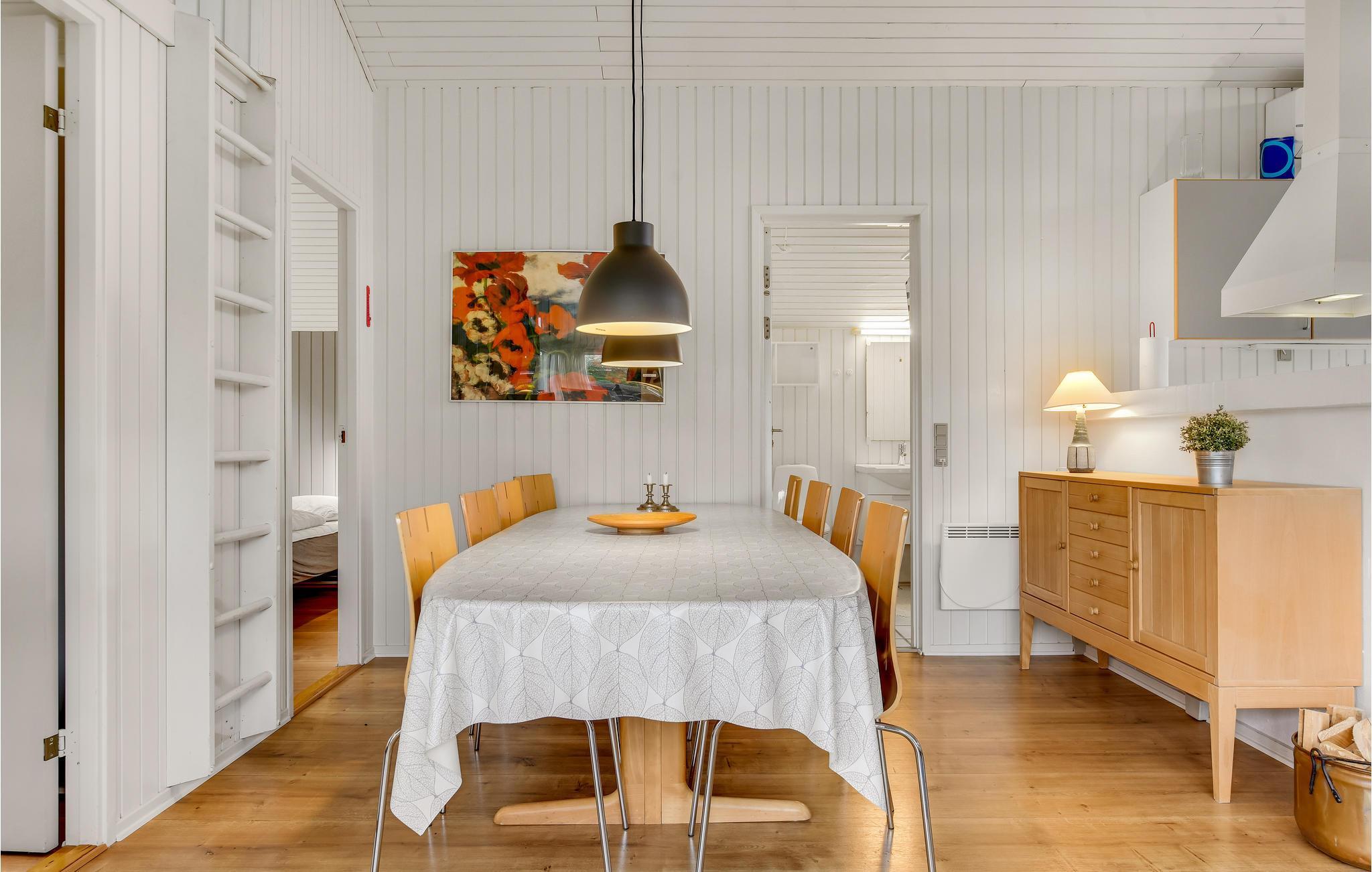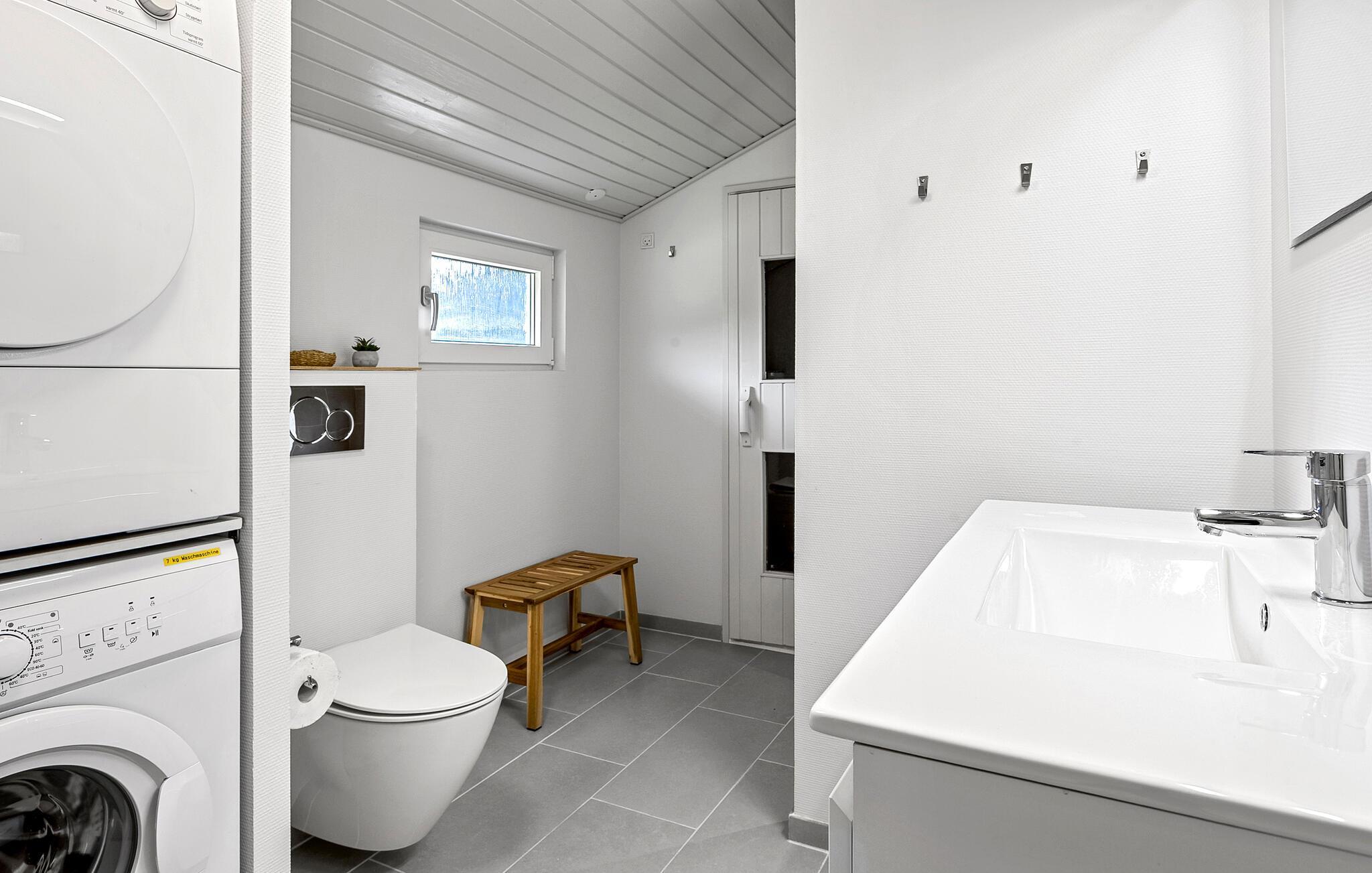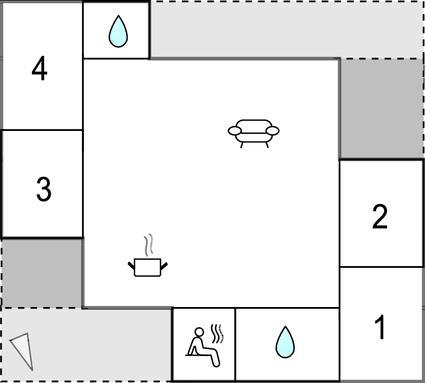 Huset har to sovefløje, der er forbundet med et centralt opholdsrum. Det er derfor ideelt til to familier, der gerne vil holde ferie sammen. Der er også to badeværelser. Et af dem er udstyret med en sauna. Det praktisk udstyrede køkken er åbent mod stuen, så I kan sludre med de andre, mens I laver mad. Ud over de fire soveværelser er der også to hemse.