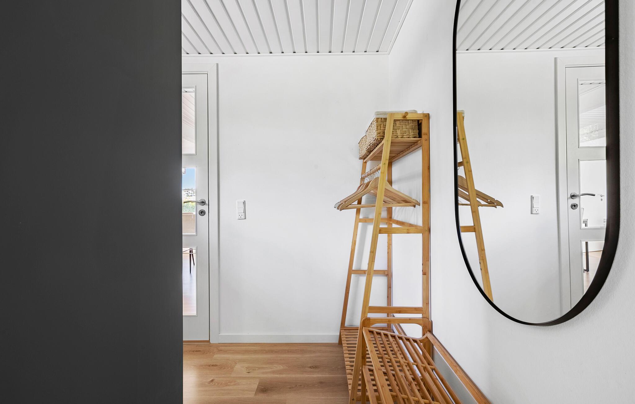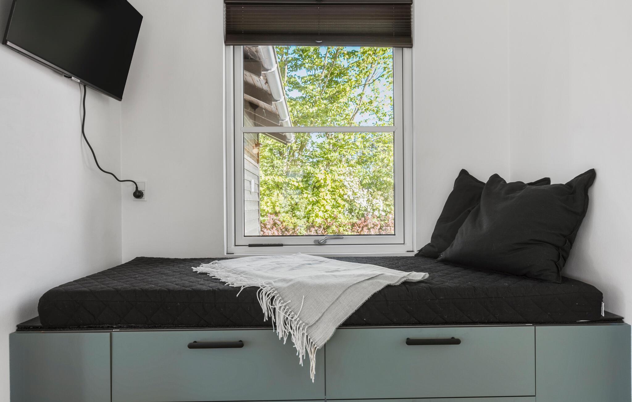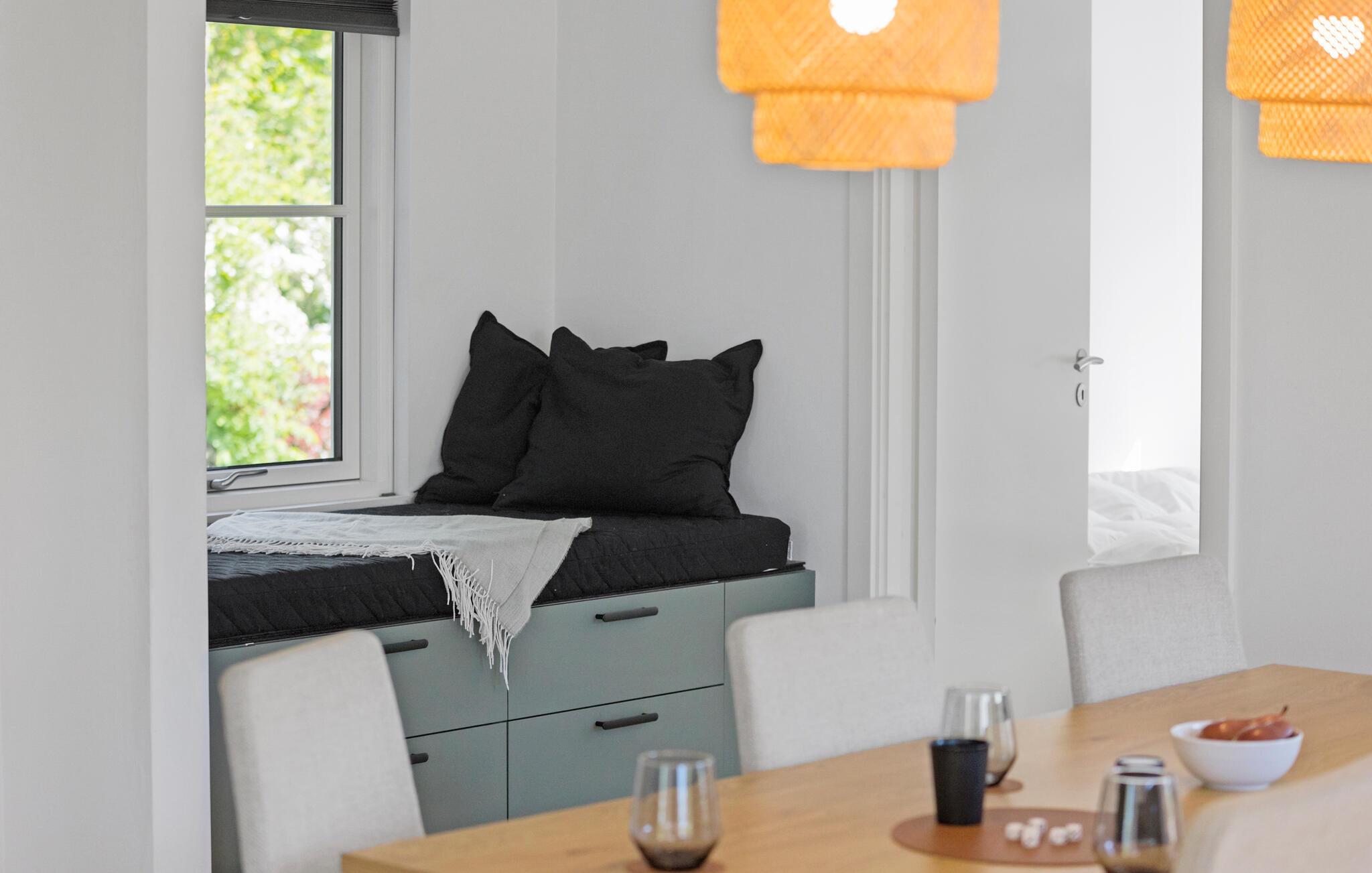 Velkommen til dette lækre hus, der ligger få skridt fra den familievenlige Skovmose Strand, og hvor I får en fremragende ramme om årets familieferie. Indvendigt fremtræder huset yderst flot og stilsikkert. Interiøret får dejlige lysindfald gennem de mange vinduespartier, der samtidig giver en smuk udsigt til haven. Skulle vejret vise lidt tænder, kan I fyre op i brændeovnen og nyde dens knitrende varme til madlavningen i det moderne køkken, boglæsningen i alkoven og hyggelige fællesmåltider ved spisebordet. Lad aftenen gå på hæld med lækre snacks, brætspil og en god film på tv'et, mens I lægger planer for de kommende dage.