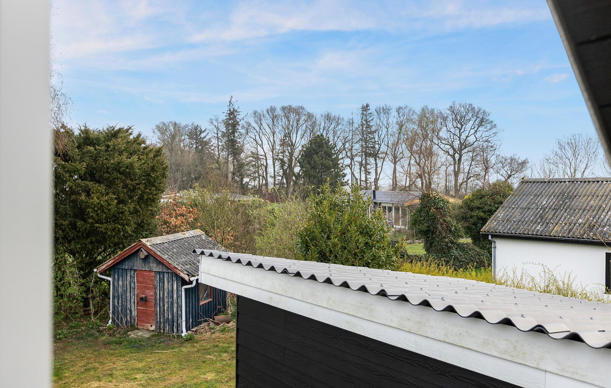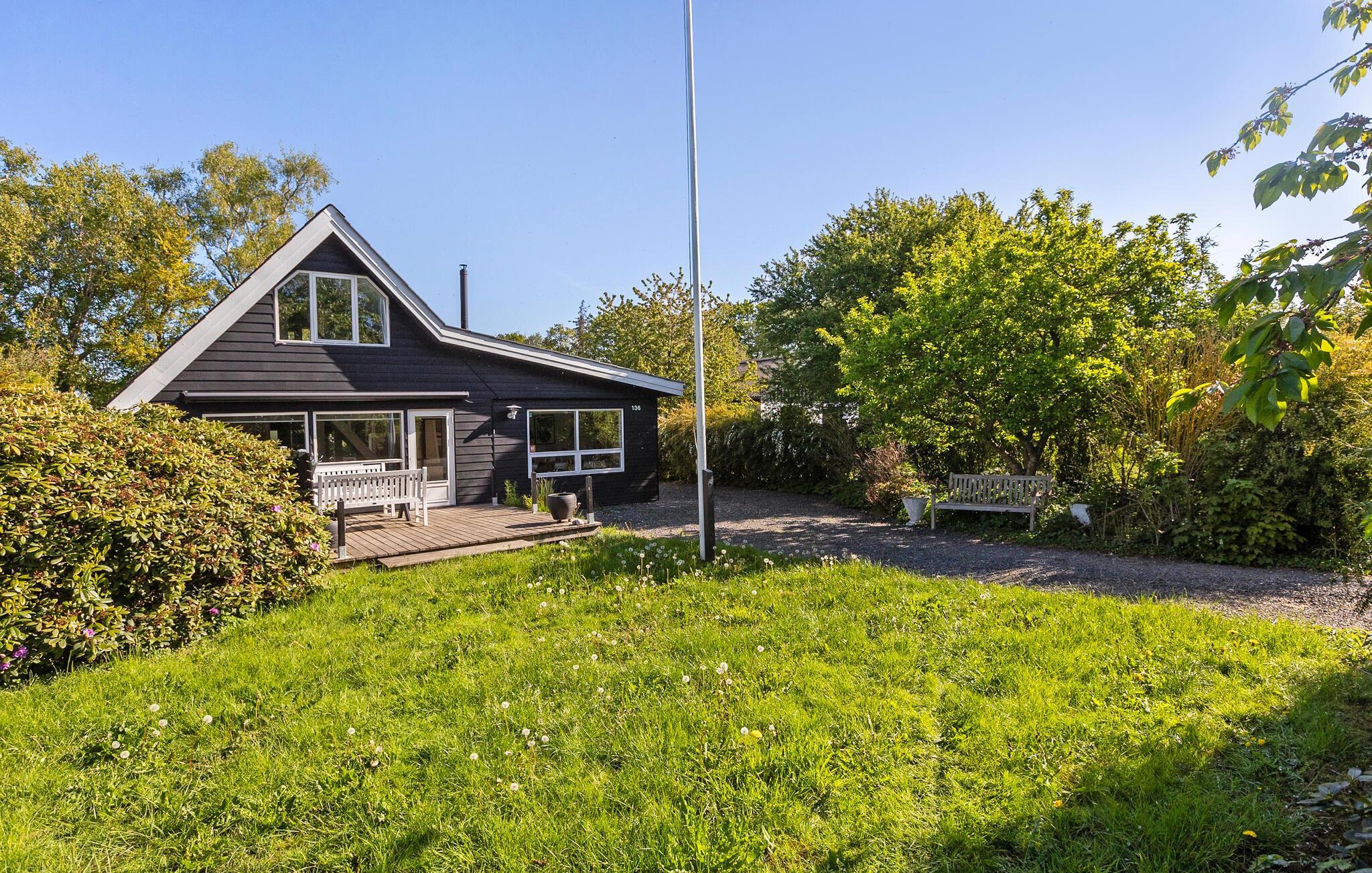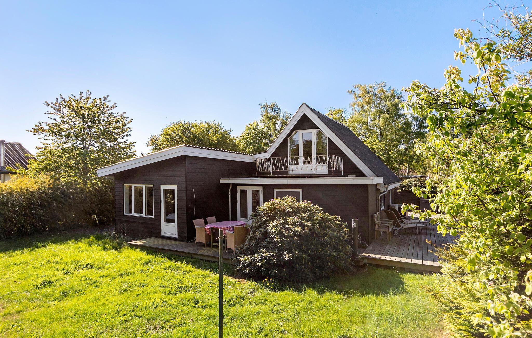 Charmerende træhus med terrasse og have nær Skovmose Strand på Sydals, perfekt til afslapning og naturoplevelser.