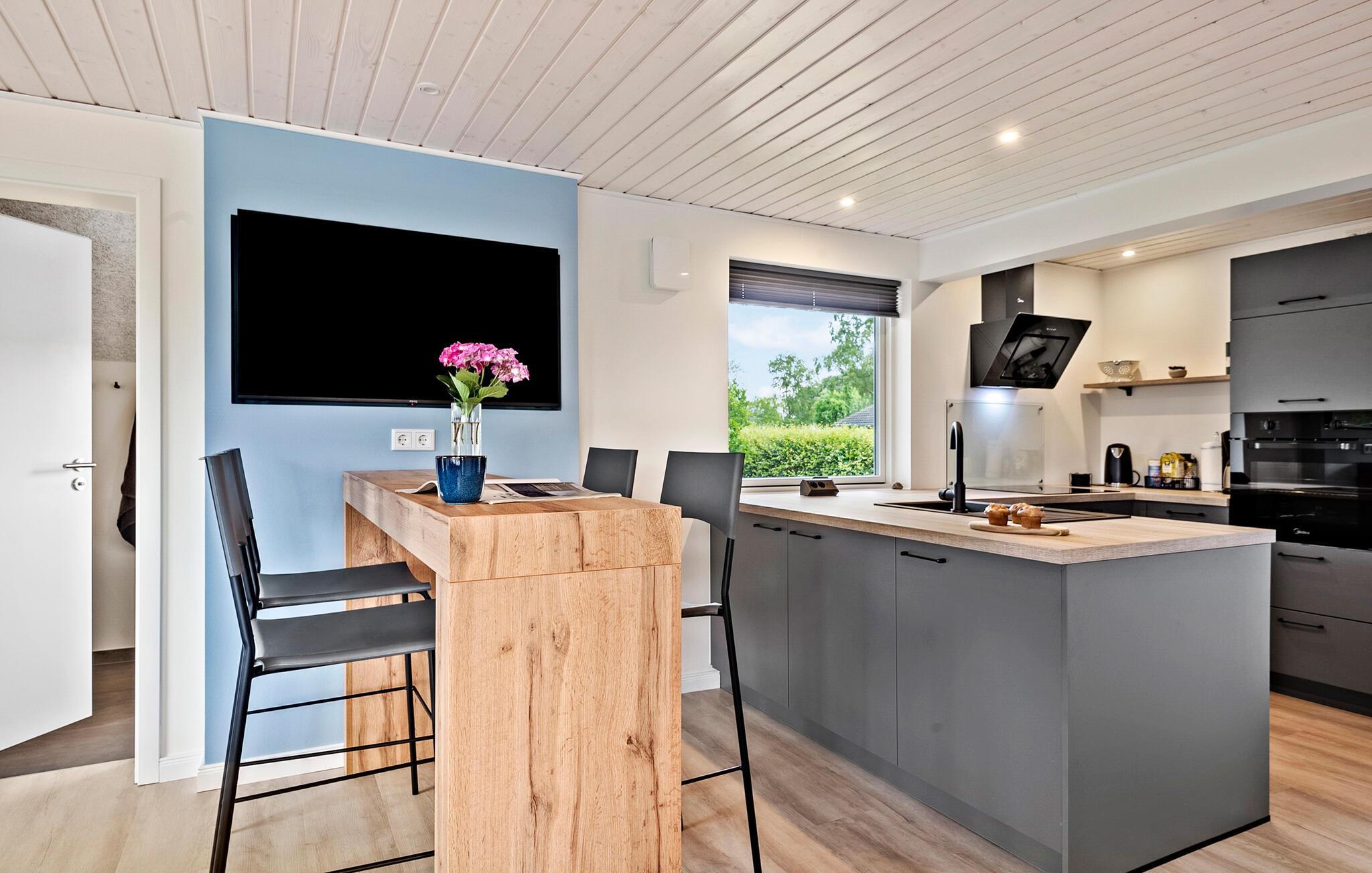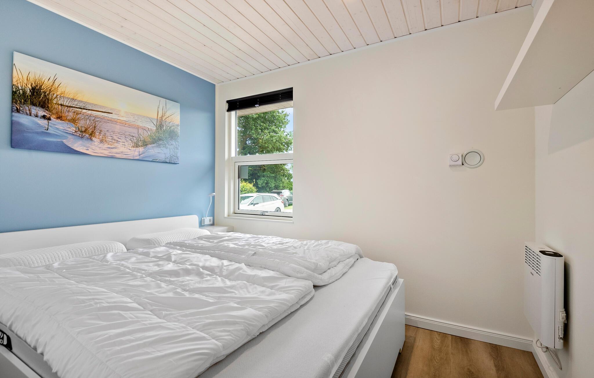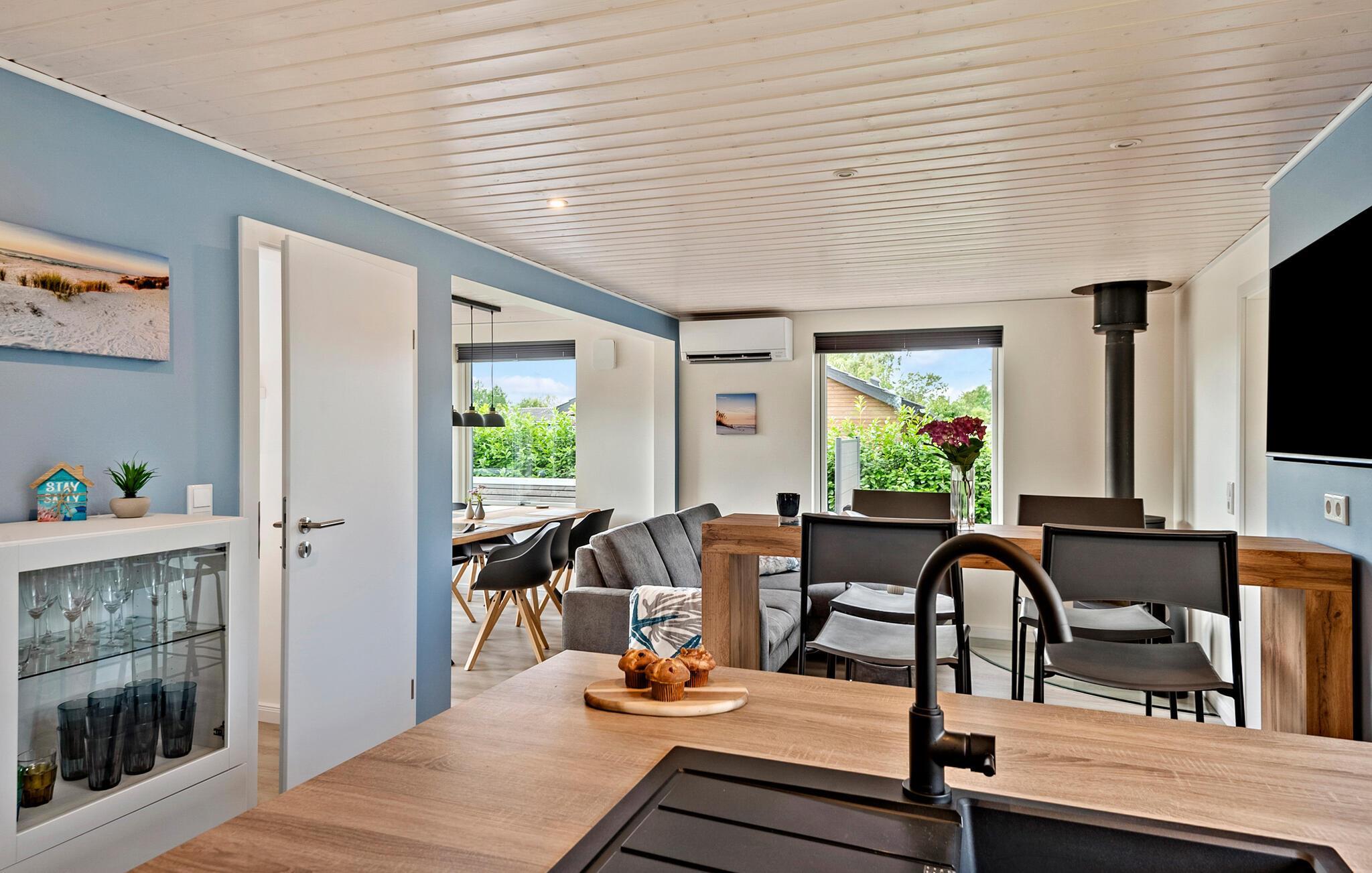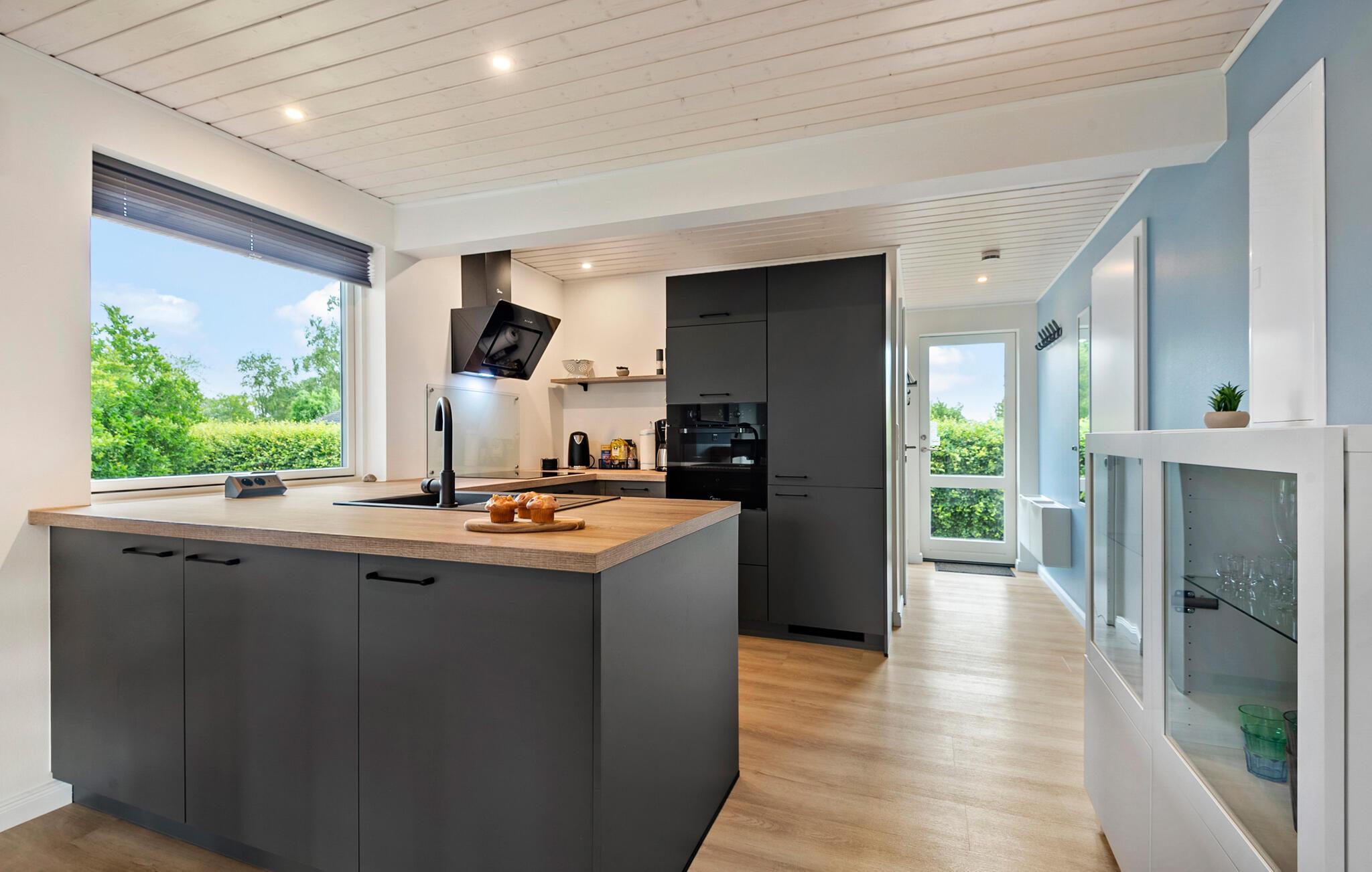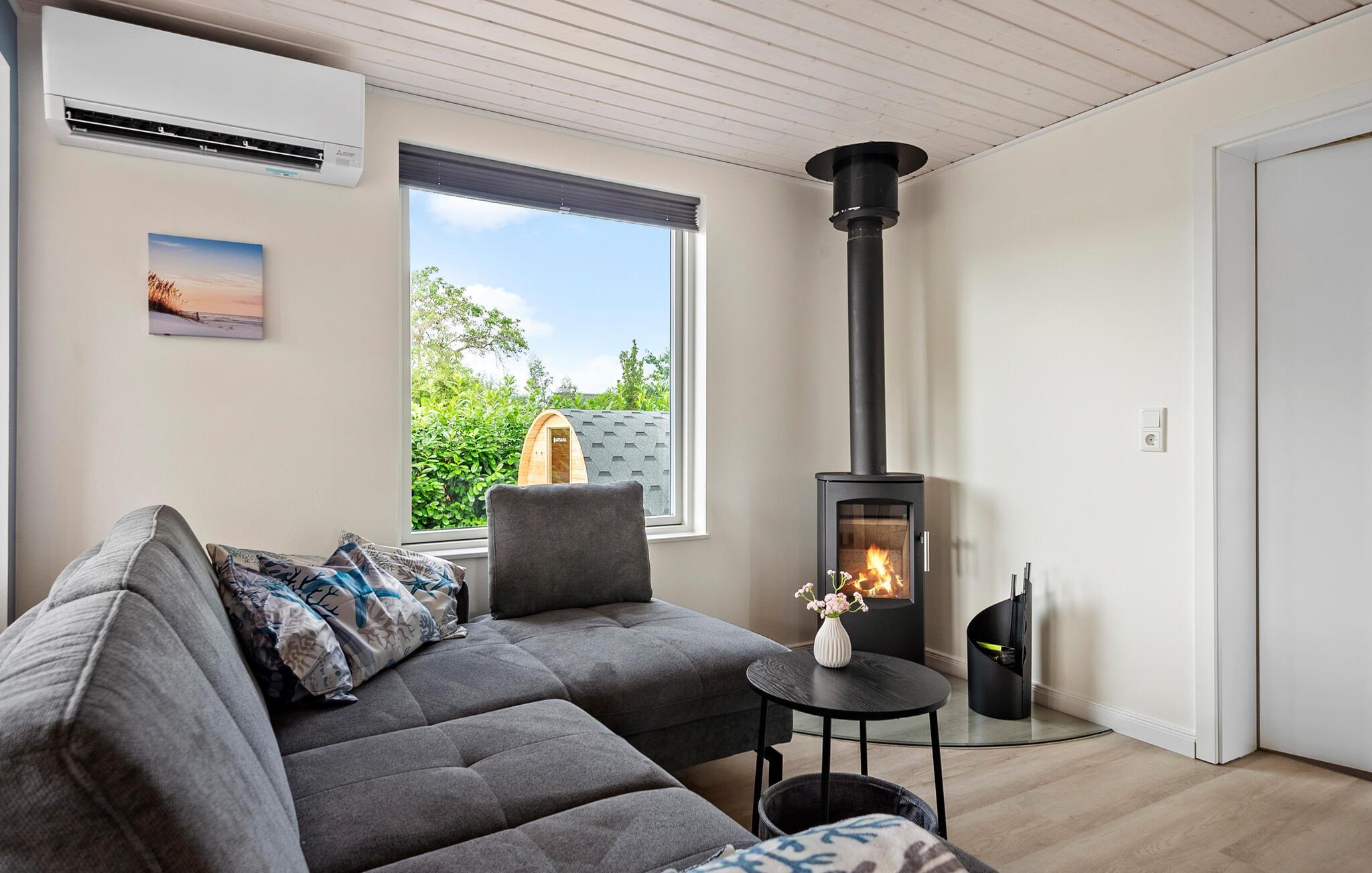 Nyd en afslappende ferie i dette stilfulde feriehus, der giver jer komfort og en indbydende atmosfære. jeres sommerhus ligger kun få minutters gang fra Skovmose Strand, en af ??de bedste og mest familievenlige sandstrande i området. Indenfor finder I en lys, moderne atmosfære med store vinduespartier, der oversvømmer stuen med naturligt lys. Find jer godt til rette i den komfortable hjørnesofa og nyd den hyggelige varme fra brændeovnen. Det åbne køkken lægger op til at lave mad sammen, mens den rummelige spiseplads giver plads til omgængelige måltider. Saunaen sikrer ren afslapning, den perfekte oase efter en aktiv dag.