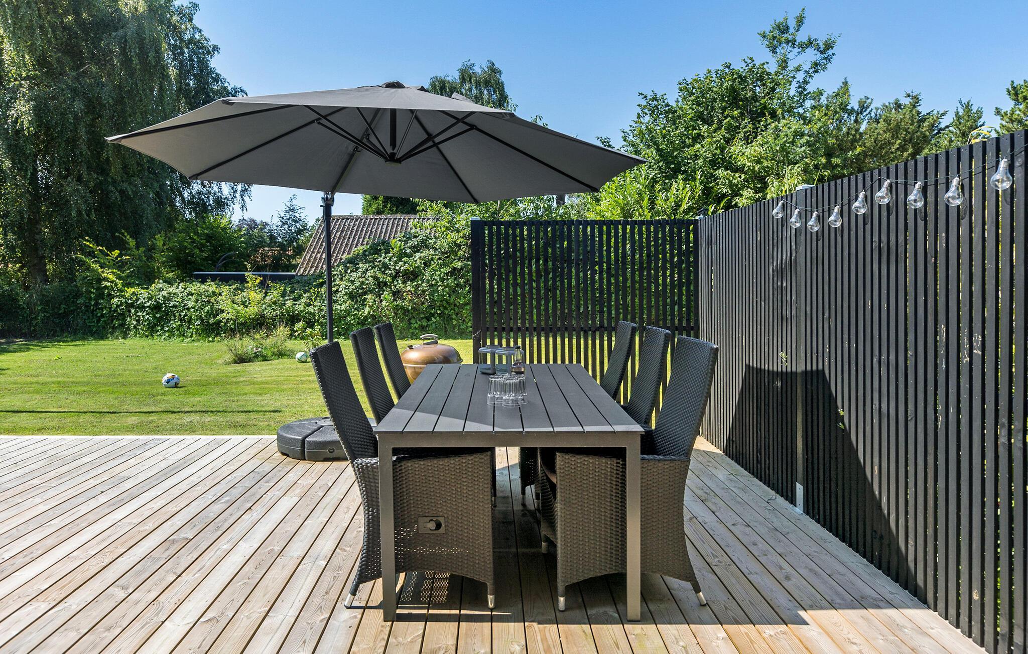 Glæd jer til sommerdagene på den elegante terrasse, hvor man kan sidde ude i al slags vejr. Læn jer tilbage i liggestolene, når solen skinner og dæk op til en herlig sommermiddag med lækre salater og grillretter på det lange bord.