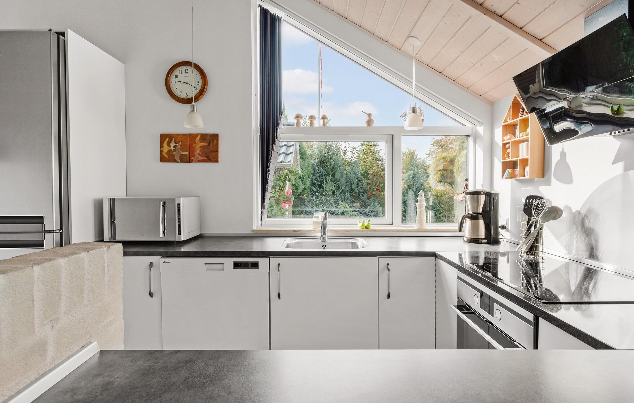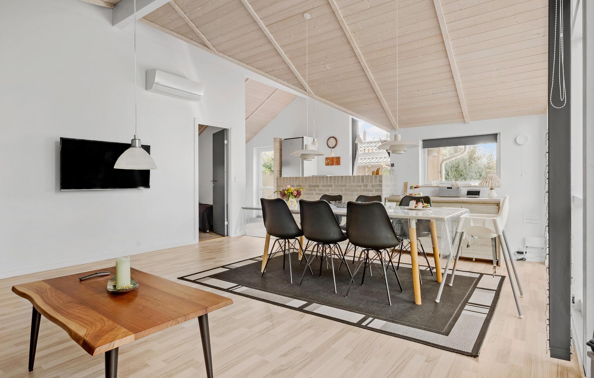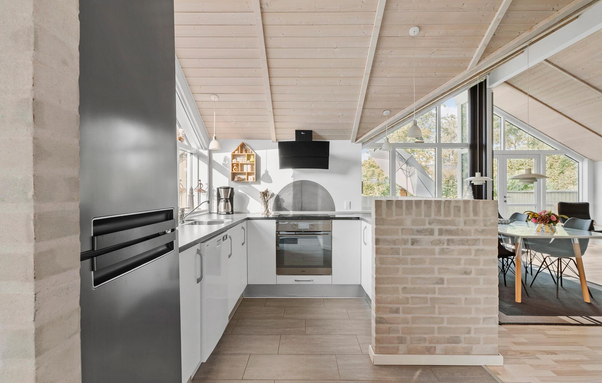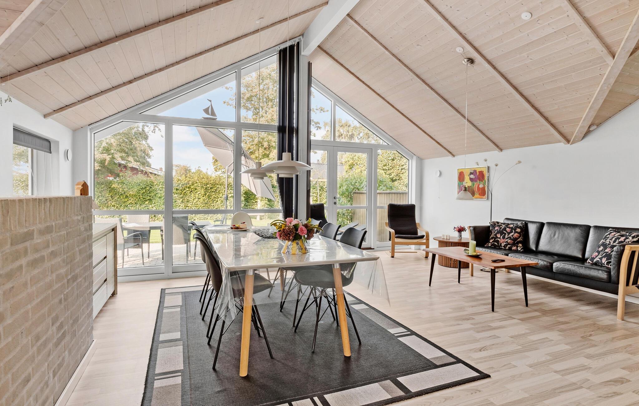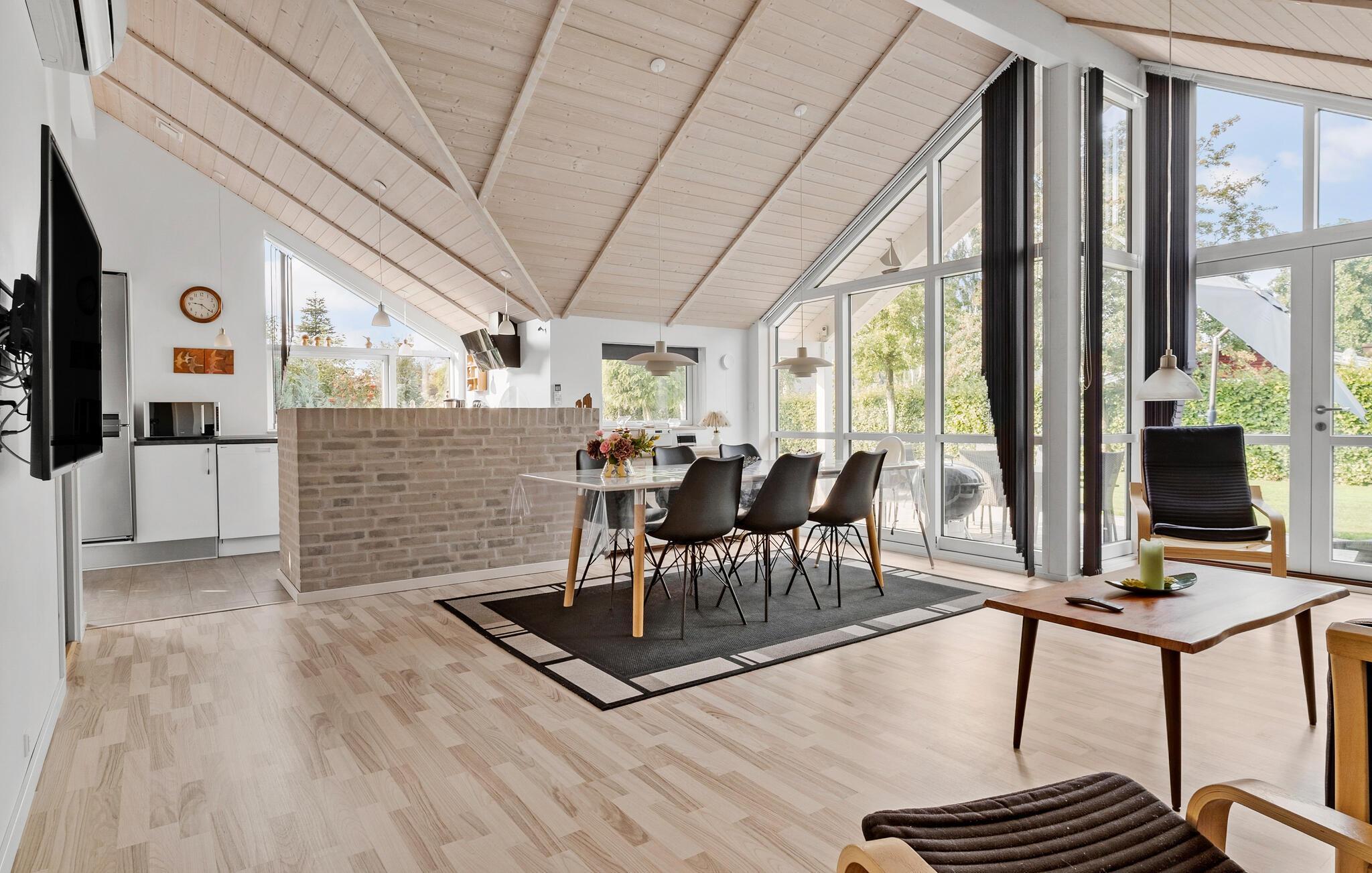 Velkommen til denne flot anlagte grund, som er meget tæt på Skovmose Strand. Her ligger dette hyggelige hus, hvor I kan tilbringe nogle herlige feriedage. Boligen er lys og åben med et fantastisk lysindfald fra den store vinduesvæg ud mod terrassen og haven. Nyd dagens måltider med den behagelige udsigt fra spisebordet og hyg jer med brætspil, når I vender hjem fra jeres eventyr.