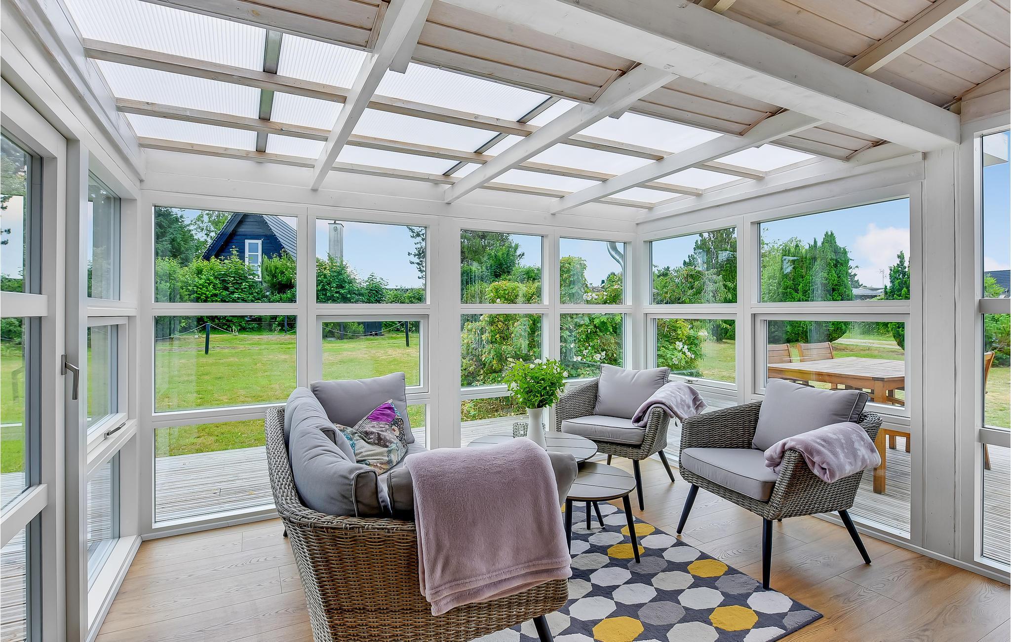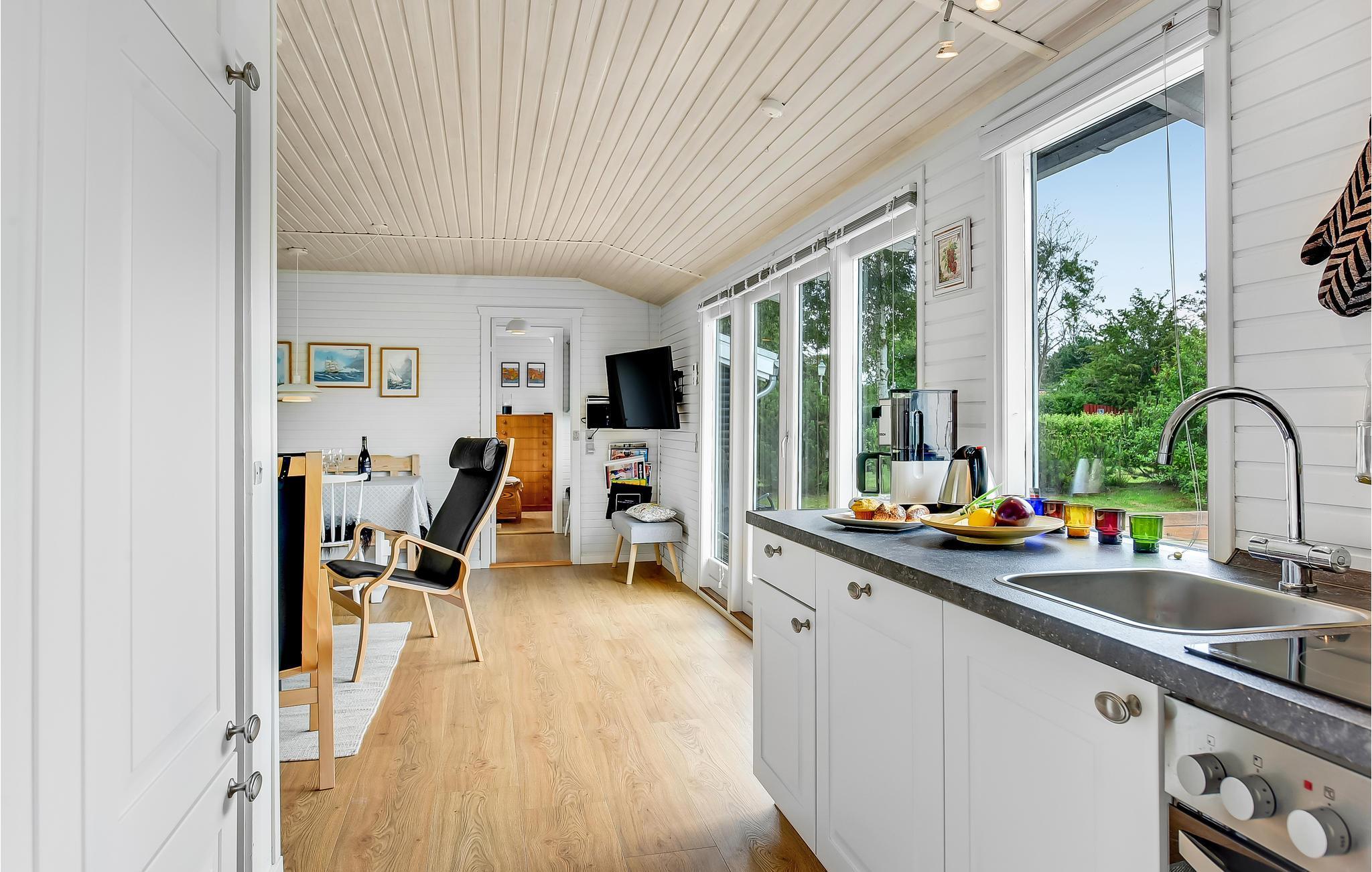 Dette hyggelige feriehus er beliggende i 2. række, kun 100 meter fra vandet. En lille sti fører direkte ned til den dejlige strand og Østersøens rene badevand. Husets moderne og veludstyret køkken ligger i åben forbindelse med spiseafdelingen og opholdsstuen. I stuen er der både en brændeovn og en energivenlig varmepumpe, som I kan bruge på de kølige dage og aftener. Overalt vil I opleve lyse og indbydende rum. Der er også en dejlig havestue, hvor I kan nyde naturen indefra, hvis vejret ikke er til udendørs aktiviteter. Over alt i huset kan I bruge den trådløse internetforbindelse.