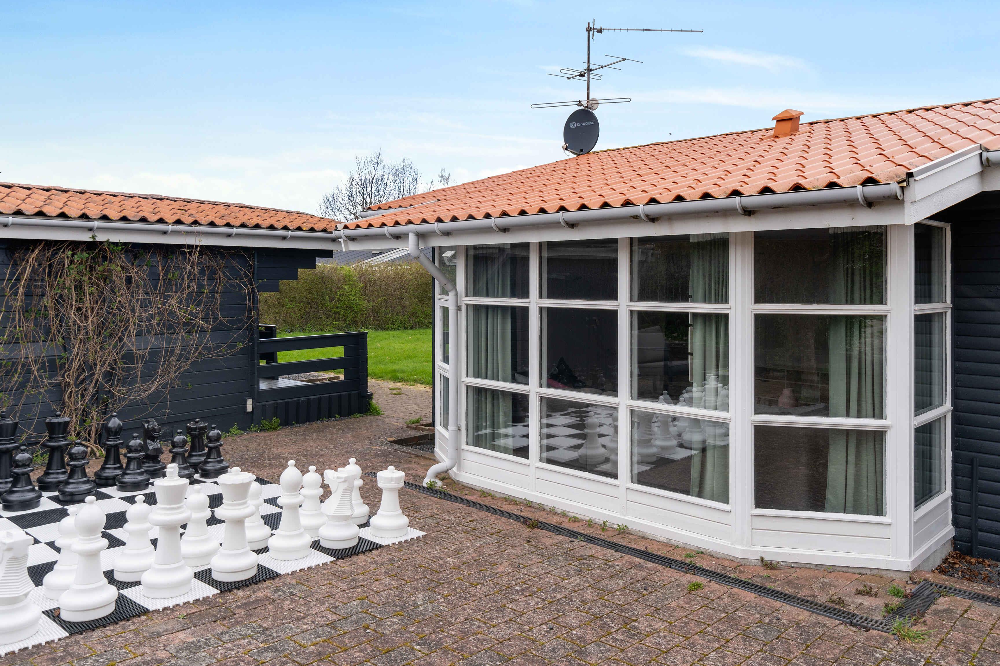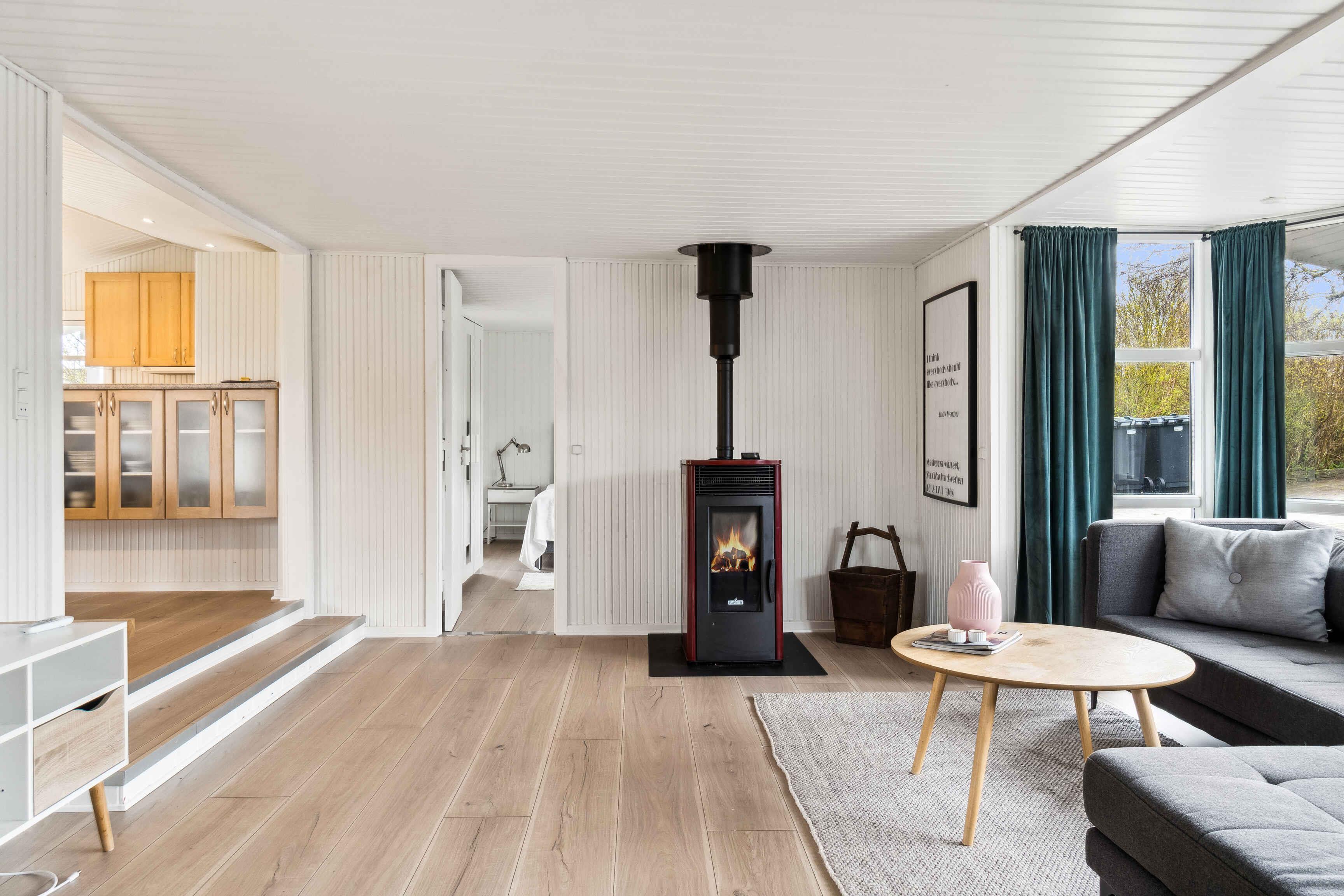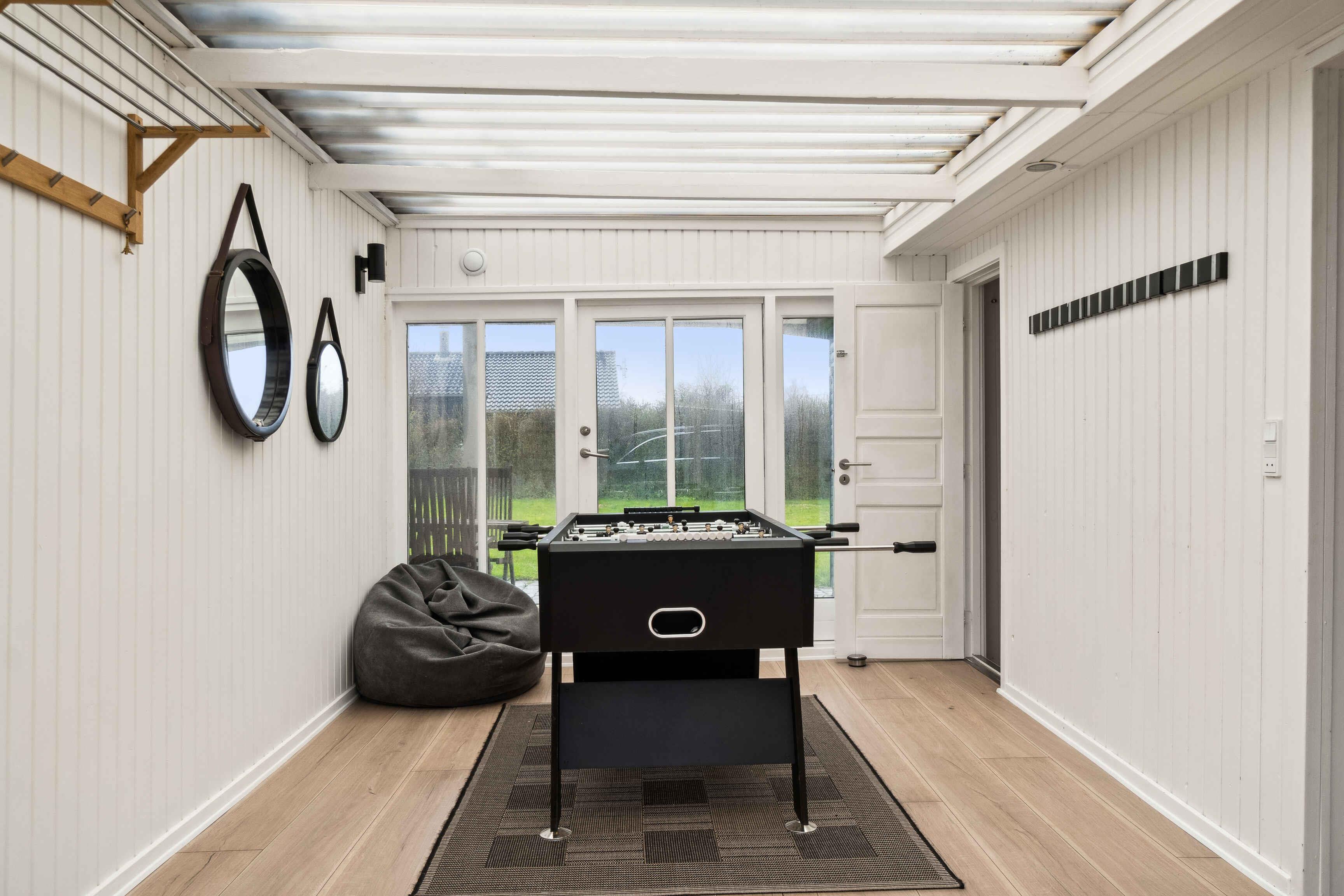 hyggeligt sommerhus, chromecast, 2 annekser med to sovepladser i hver, 2 sovepladser i hovedhuset, træpilleovn, hvor man selv skal medbringe 6 mm piller, og det virker kun med dem, både overdækket og åbne terrasser, bordfodbold, stor grund