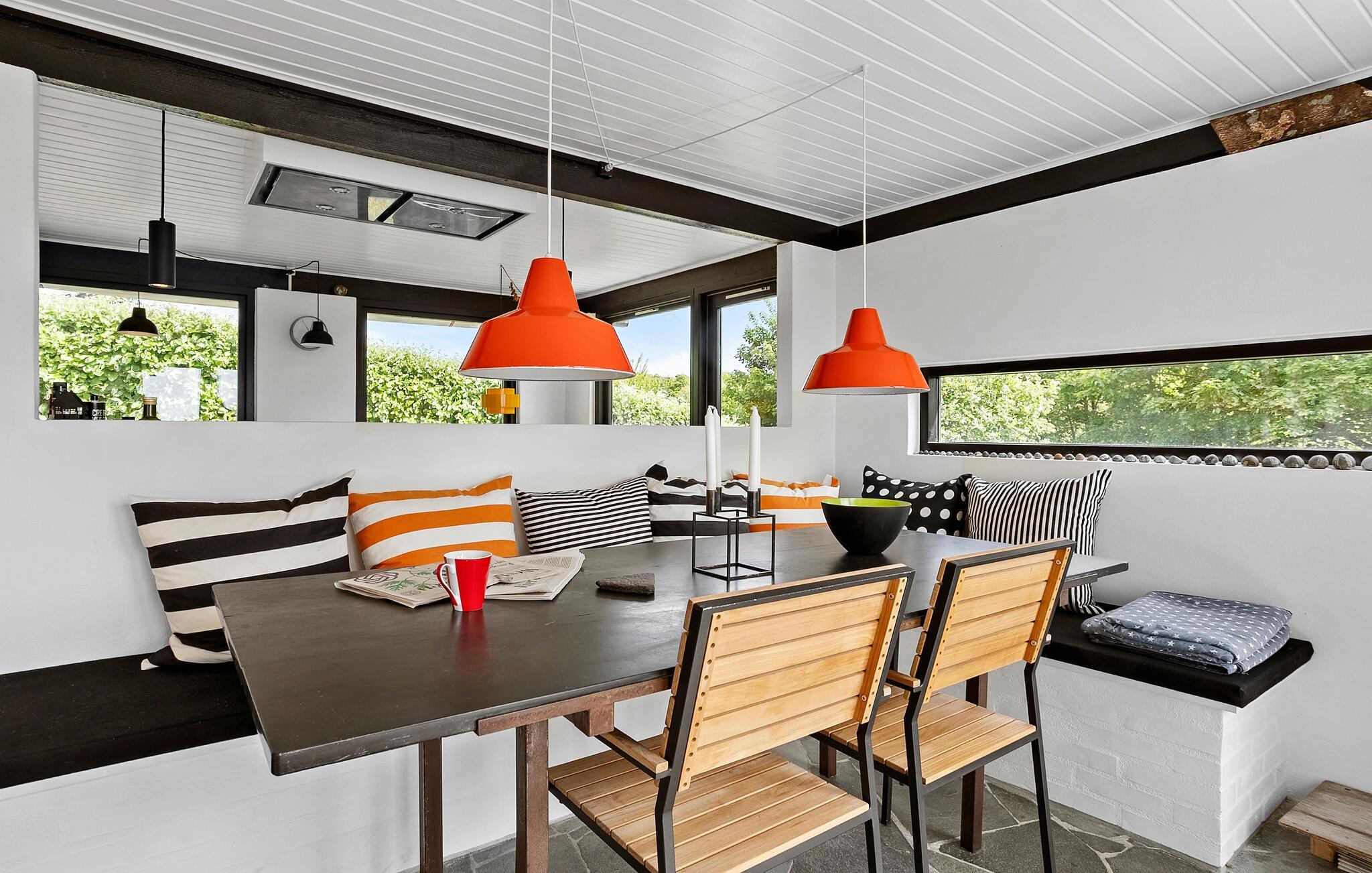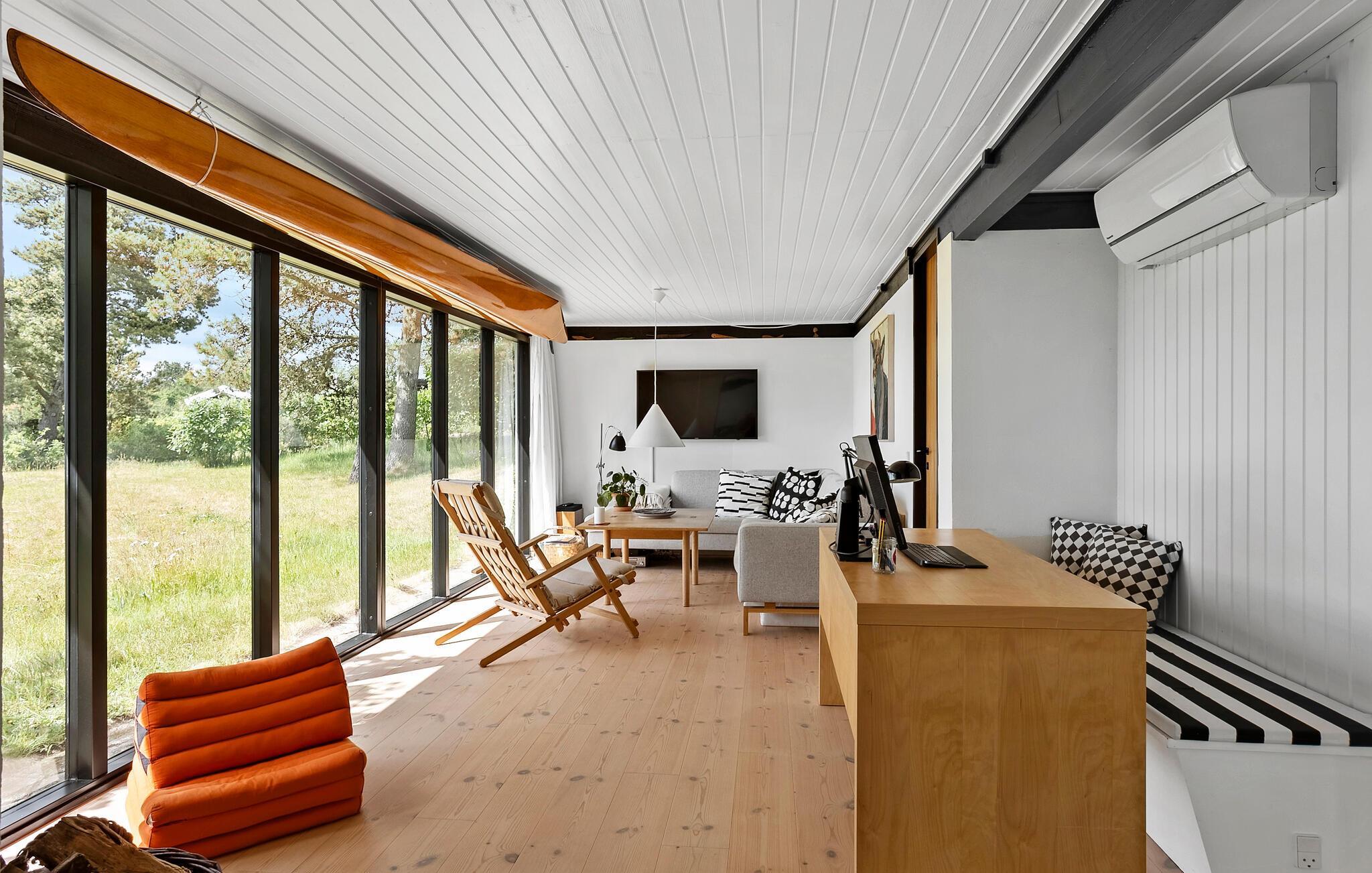 I dette feriehus, der ligger højt på landet, vil I tilbringe en afslappende ferie omgivet af smuk natur. sæt hverdagen på pause og glæd jer til en pause med udsigt, fred og frisk luft. Den lyse opholdsstue med gulv-til-loft-vinduer tilbyder en fantastisk udsigt over det omkringliggende landskab helt ned til havet. Find jer godt til rette i siddegruppen eller læs en bog med udsigt over naturen. Møblerne er lyse og har gennemtænkte detaljer. Brug det åbne køkken med store bordplader og masser af naturskønt lys til at lave mad sammen. Nyd dagens måltider ved det hyggelige spisebord med direkte adgang til terrassen.