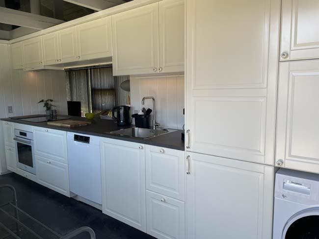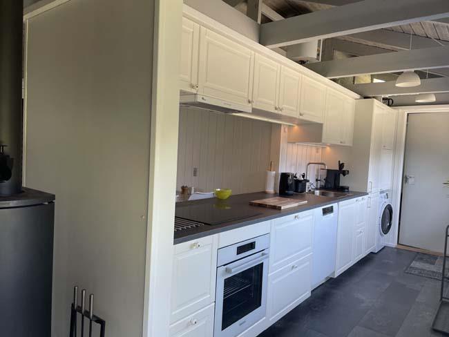 Charmerende feriehus nær havet med nyt køkken, terrasse og brændeovn, perfekt til familien.