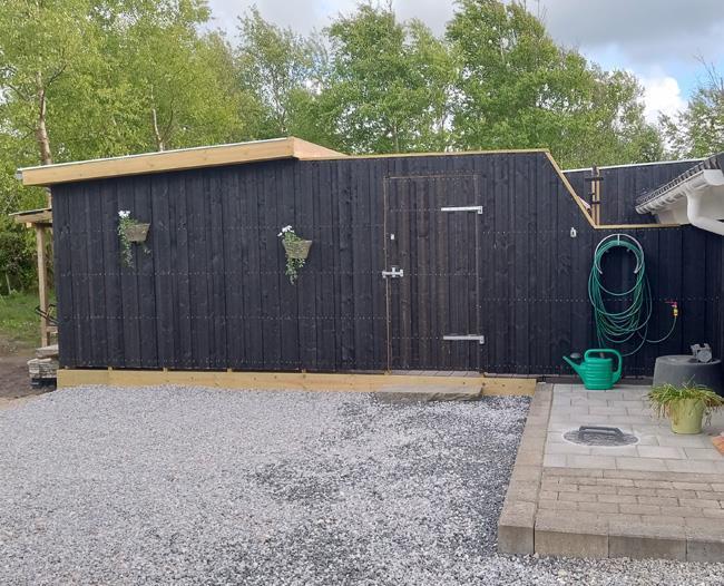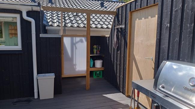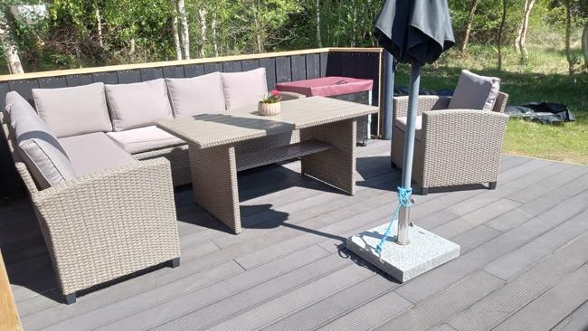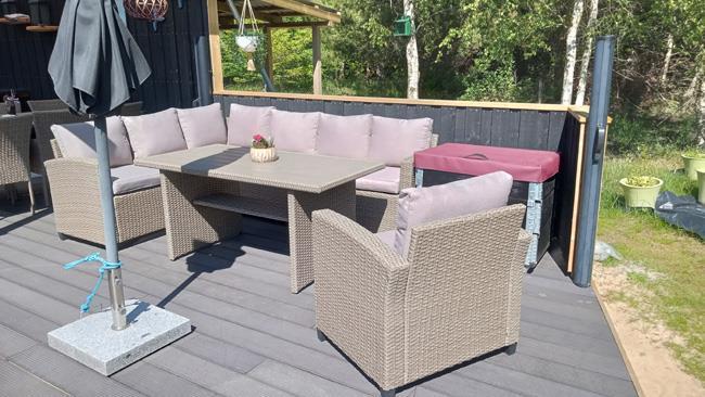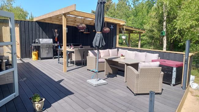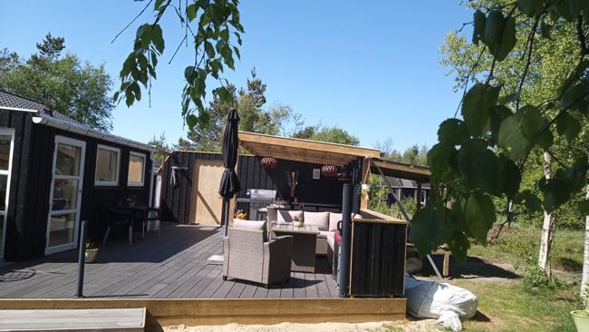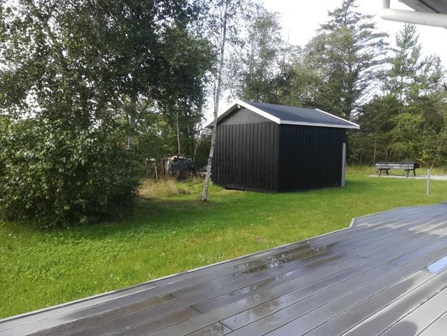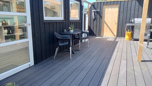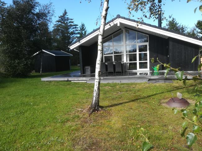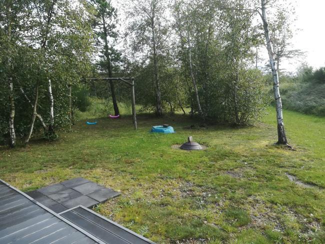 Huset ligger på en stor grund med plads til leg og spas på græsset. Her er der til de mindst gynger og en sandkasse. Til hygge med hele familien er her et bålfad, hvor der kan blive lavet snobrød og varmet skumfiduser. Huset har terrasse stort set hele vejen omkring huset, hvilket betyder at man lige meget hvornår man på dagen ønsker at nyde solen, kan gøre det fra terrassen. Terrassen har også et område som er overdækket. Huset er afskærmet fra offentligheden og de andre huse, så der er mulighed for at solbade på grunden.